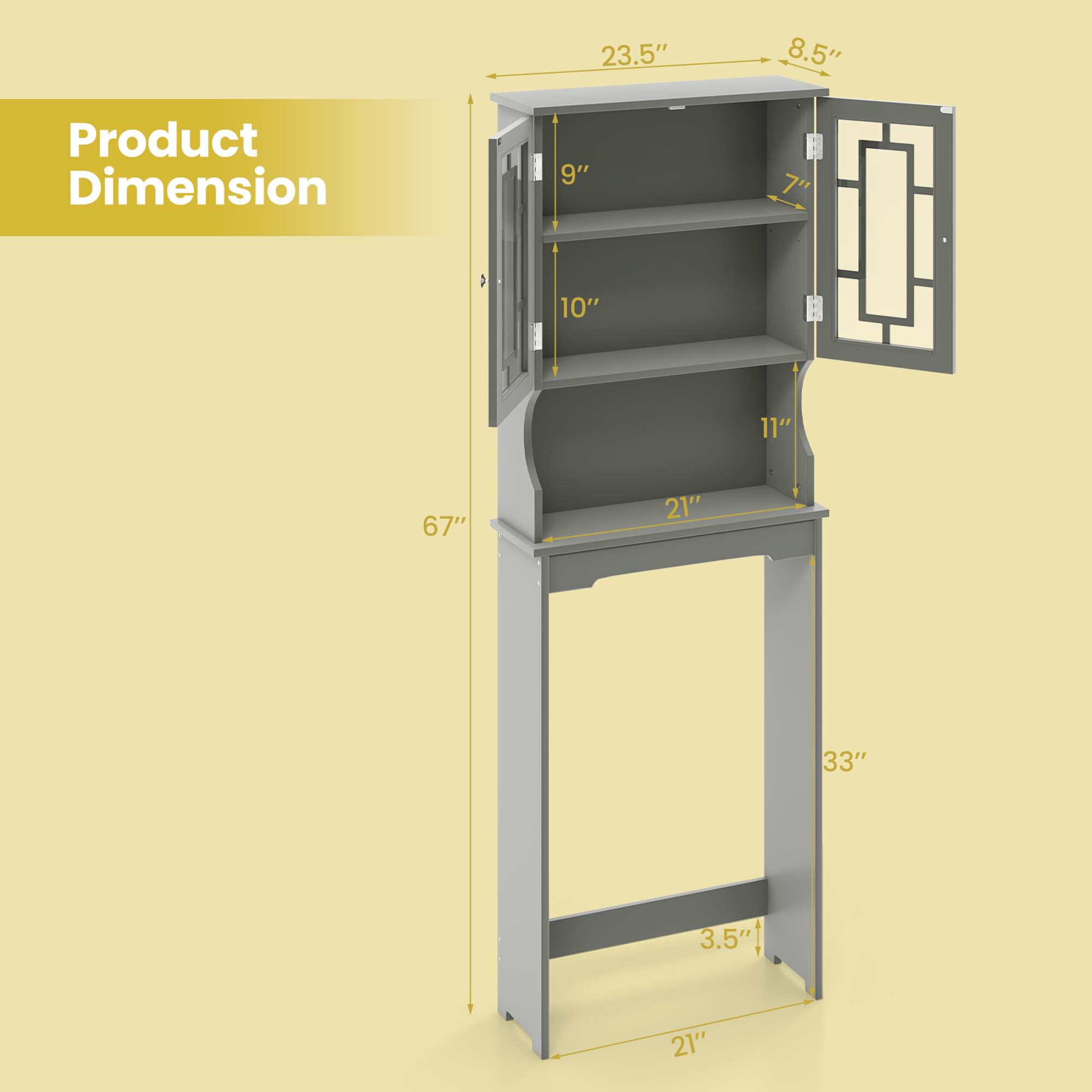 Enjoy your life with this over the toilet storage cabinet! This over the toilet storage cabinet helps to keep your bathroom tidy without taking up much floor space (please measure the height of your toilet before buying). Equipped with 2 tempered glass doors, a 3-position adjustable shelf and an open compartment, the bathroom organizer cabinet offers roomy storage space and can meet various storage needs. Crafted from selected engineered wood, this bathroom space saver ensures long-lasting use. Besides, the anti-toppling device and bottom reinforced crossbar enhance stability. Meanwhile, the smooth and anti-scratch surface is easy to wipe clean. Feature Ample storage space for bathroom essentials or other items 3-position adjustable shelf for placing different sized items Anti-toppling device fixes the cabinet to the wall for added safety Keep your bathroom neat and tidy without taking up floor space High quality materials and sturdy construction for long-term use Handy knobs and magnetic catch make it easy to open the doors Elegant and modern look adds a touch of delicacy to your home Ideal for bathroom, laundry room, balcony, etc Clear instruction for simple assembly Easy-to-clean surface Specification Color: Grey Material: Engineered Wood, MDF, Tempered Glass Product Dimension: 23.5″ x 8.5″ x 67″ (L x W x H) Recommend Toilet Size: 21″ x 33″ (W x H) Net Weight: 37 lbs Weight Capacity of Each Layer: 22 lbs Package Includes: 1 x Over-the-Toilet Storage Cabinet 1 x Instruction