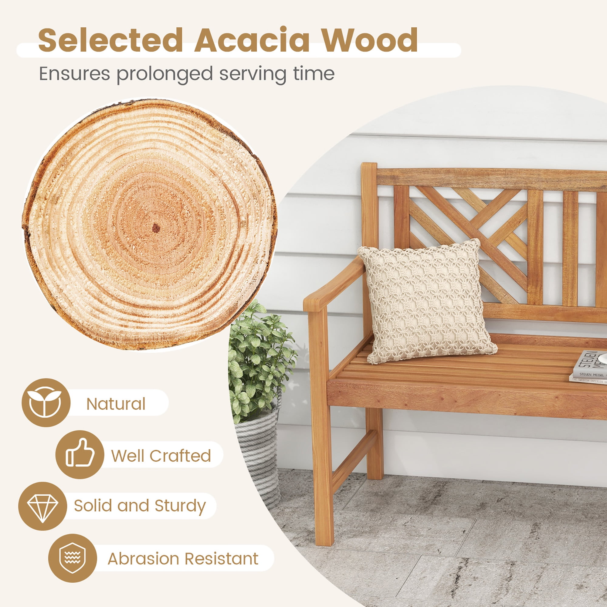 Costway Patio Acacia Wood 2-Person Slatted Bench Outdoor Loveseat Chair Garden Natural