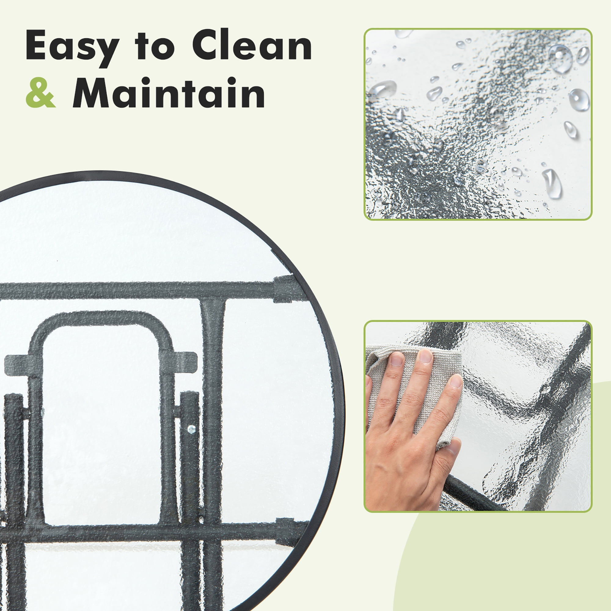 No Assembly Required: In order to give you a better use experience, our patio side table with folding design makes it effortless to fold and unfold, you just need to adjust the security lock up or down. It only weighs 8lbs, you can bring the table anywhere you want without effort. With compact size, this patio side table will take up less space when not in use. High Quality Tempered Glass Tabletop: This bistro table features a sturdy tempered glass tabletop, improving overall safety and durability. In addition, the delicate tabletop is able to place snacks, drinks and your favorite books. And the rounded corners prevent accidental scratches. Sturdy & Durable Side Table: Constructed from powder-coated steel frame, this patio side table is strong enough to hold up to 110 lbs and is durable for all weather use. Besides, X-shaped structure for added stability. 4 non-slip foot pads protect your floor from scratches. Once the locking system is in place, the table will not fold during use. Suitable for Various Occasions: This stylish folding table is a perfect choice for you to take a cup of tea in your backyard, balcony, poolside or enjoy a camping trip outside. With a simple and elegant appearance, this round side table matches well with any indoor and outdoor area. Easy to Clean & Maintain: The smooth surface is easy to clean thanks to the waterproof and rustproof finish, which allows you to spend less time cleaning and more time relaxing. You just need to wipe the stain with dump cloth. Overall dimension: 18” x 18.5”(D x H).