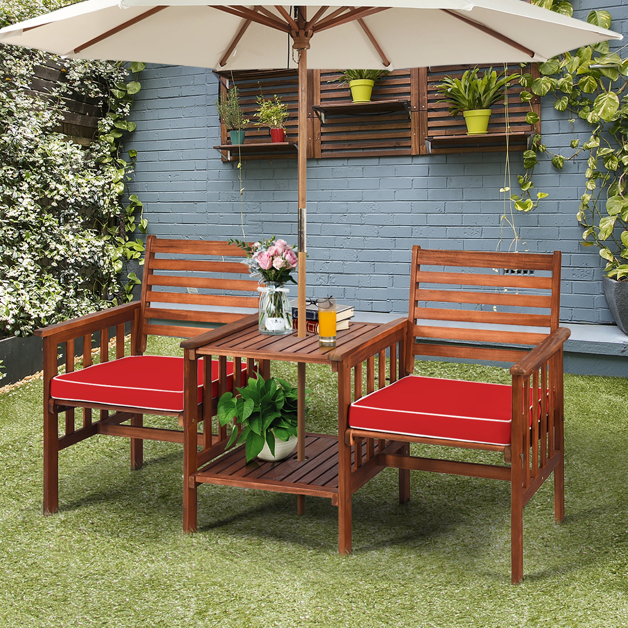 Costway Patio Loveseat Conversation Set Acacia Wood Chair Coffee Table Cushioned Red
