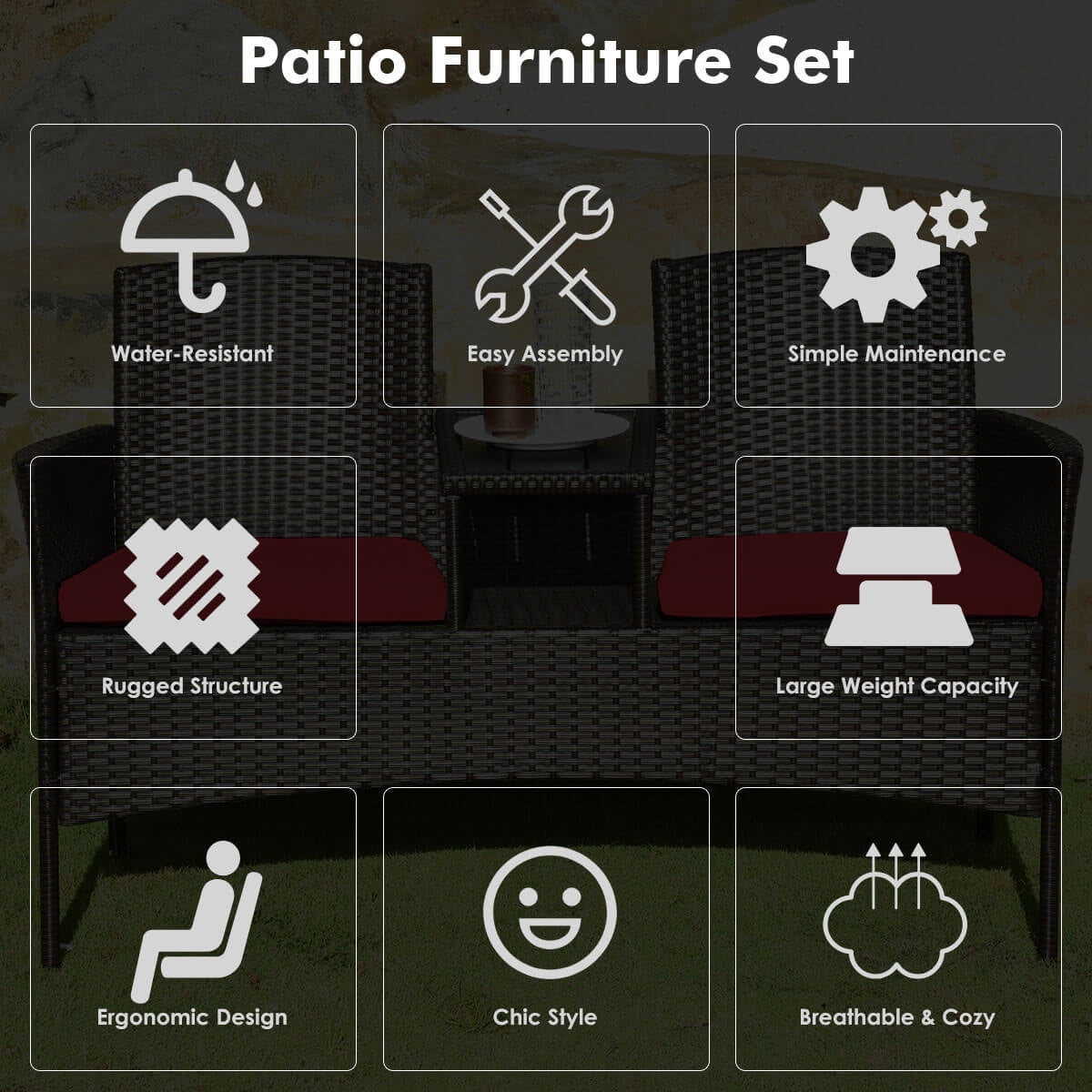 Costway Patio Rattan Conversation Set Seat Sofa Cushioned Loveseat Glass Table Chair Red