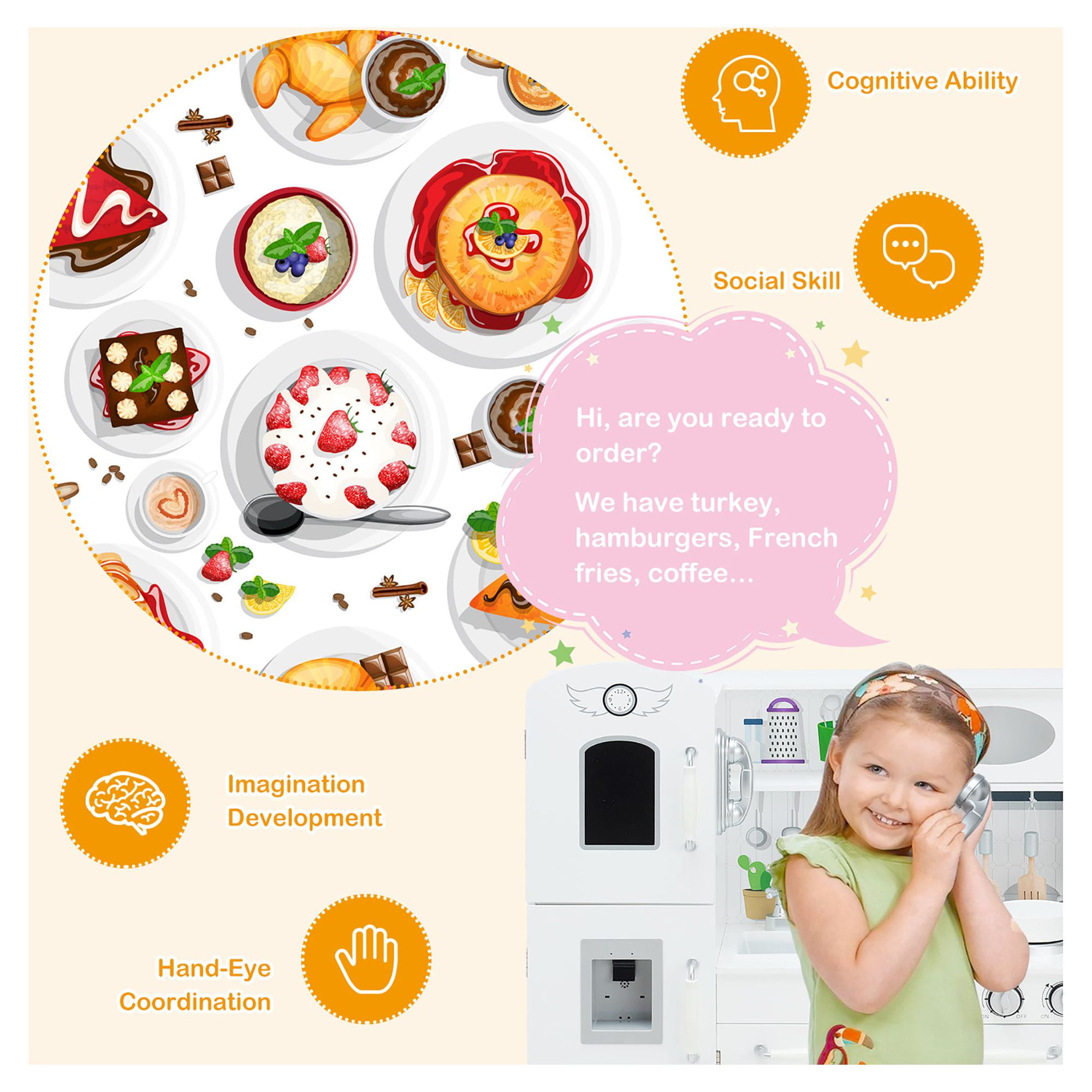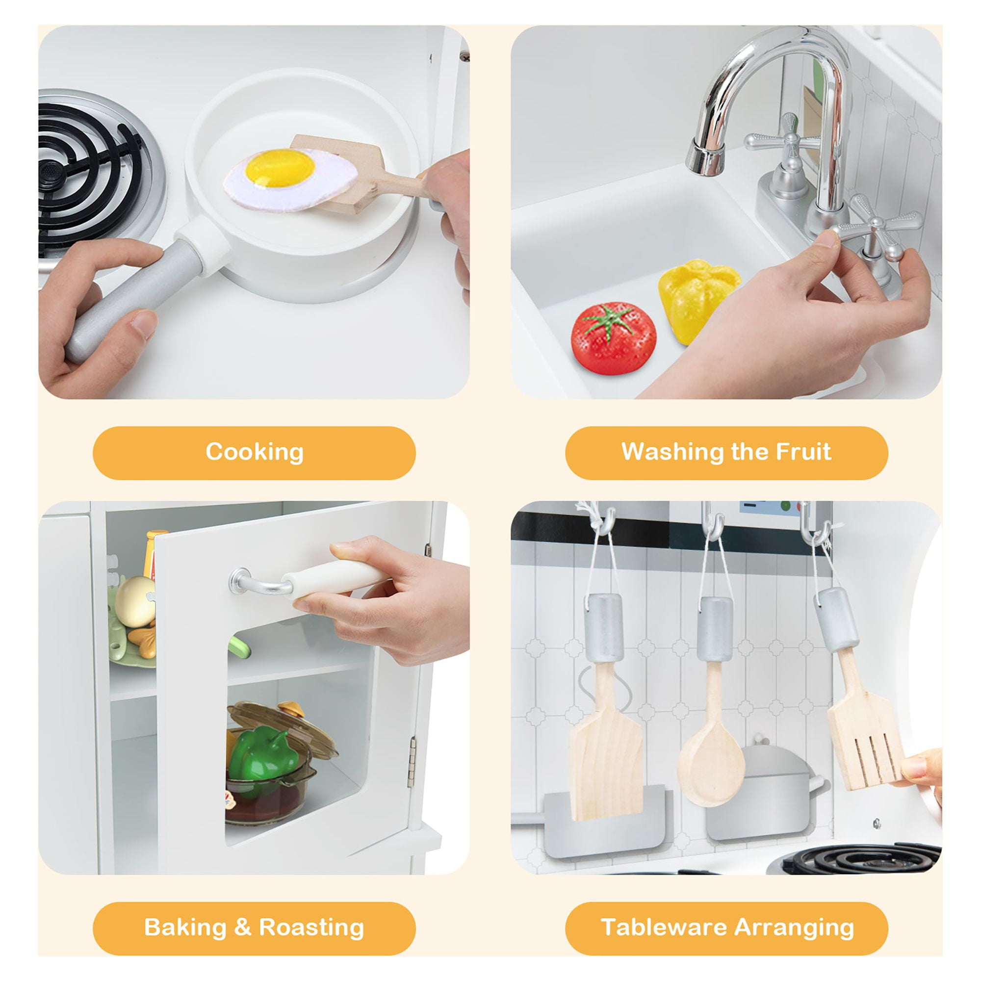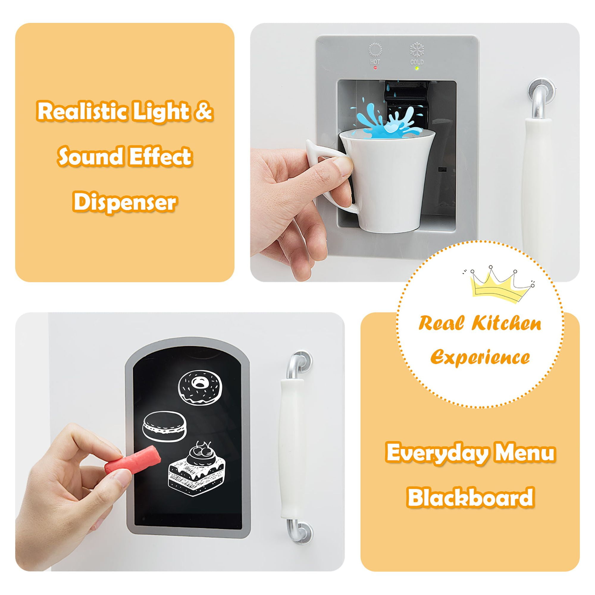 Premium & Safety Materials: Crafted out of high quality MDF boards and premium PP plastic, this pretend play kitchen set is sturdy and sturdy.Plus, with high-quality craftsmanship, the surface is smooth without burr and easy to clean. Realistic Sound & Light Effect: With this Play Kitchen toy set, your kids will enjoy being a little chef, and tasting “delicious food” from your kids. For example, parents can take orders via telephone. Moreover, featuring a water dispenser built in realistic light and sound and a simulated sink, which makes it more fun. Endless Fun with Friends: Having a role-playing game with friends and families allows your children to give full play to their imagination and provide lots of fun. Develop children’s interests and hobbies, exercise hands-on ability, and improve language expression and social skills in games. Meantime, they can also develop good washing & cleaning habits. Complete Kitchen Set: Equipped with most kitchen utensils, such as Phone,Microwave, Oven, Water Dispenser,Pot, and Pan. Spacious open shelves and enclosed cabinets are enough for storing kitchen essentials. Plus, this kitchen play set can be used as an extra locker for books, toys, and groceries when children don’t play it. Therefore, it’s also a good storage solution. Great Gift for Children: This pretend play kitchen set are suitable for any occasion as gift for boys and girls, other children or parents can also join the game, to promote the friendship, parent-child relationship. Choose it as a companion to accompany your kids’ growth. Let them have joyous childhood memories.