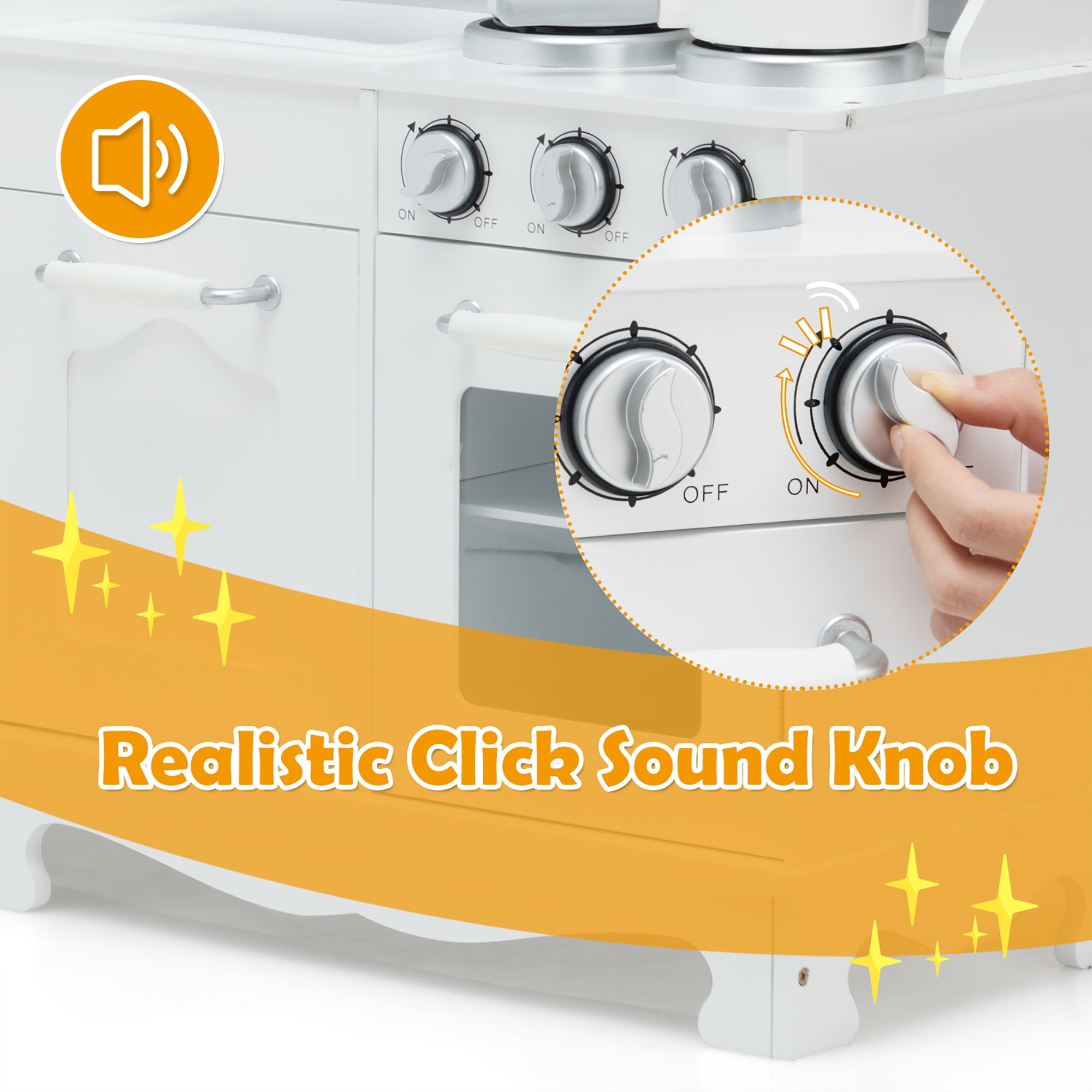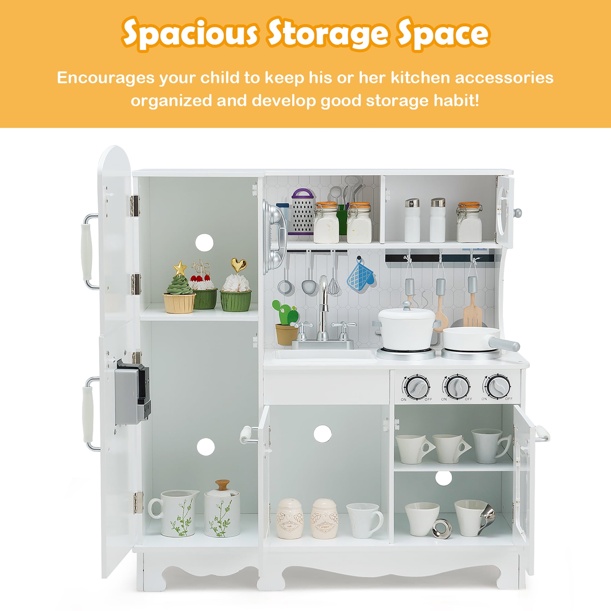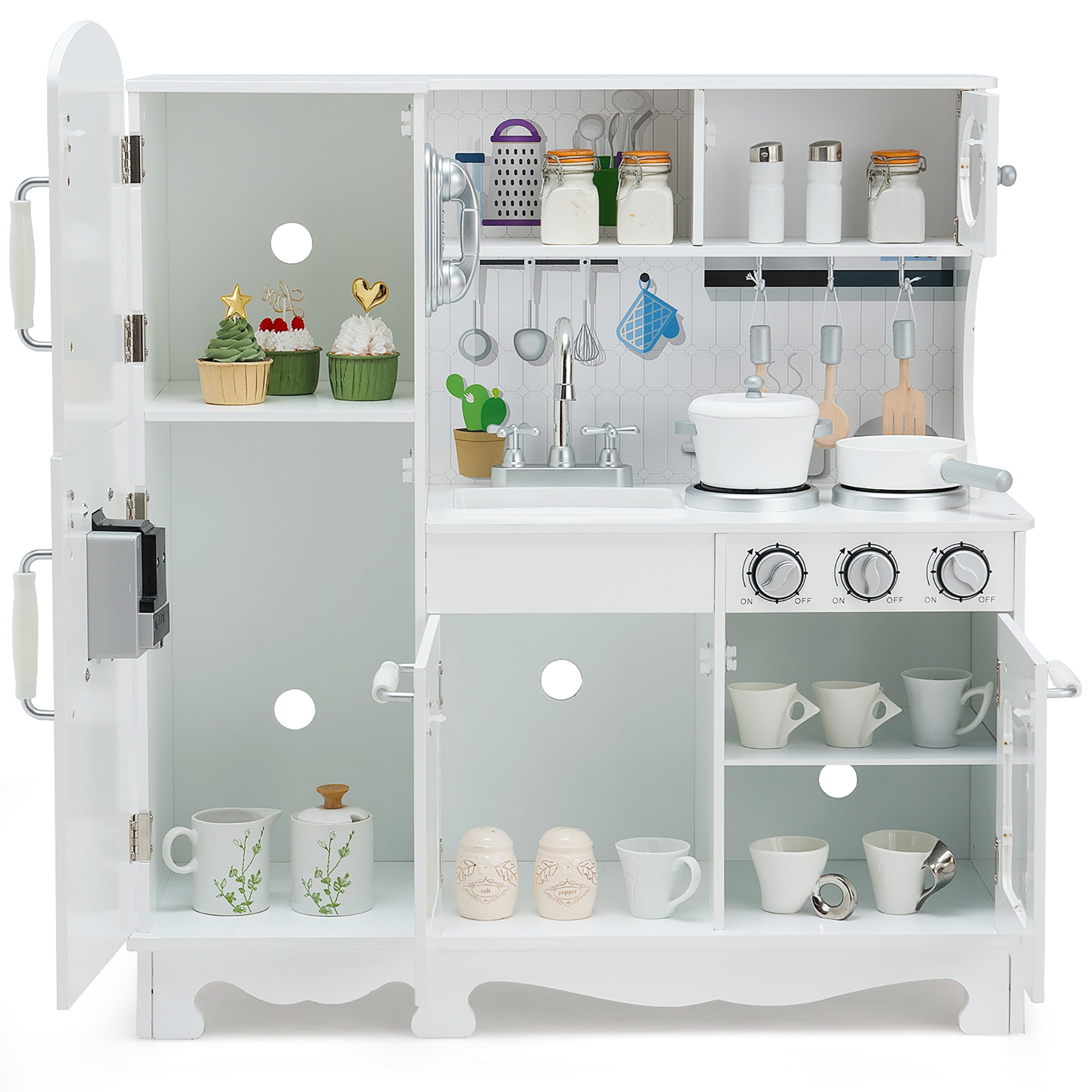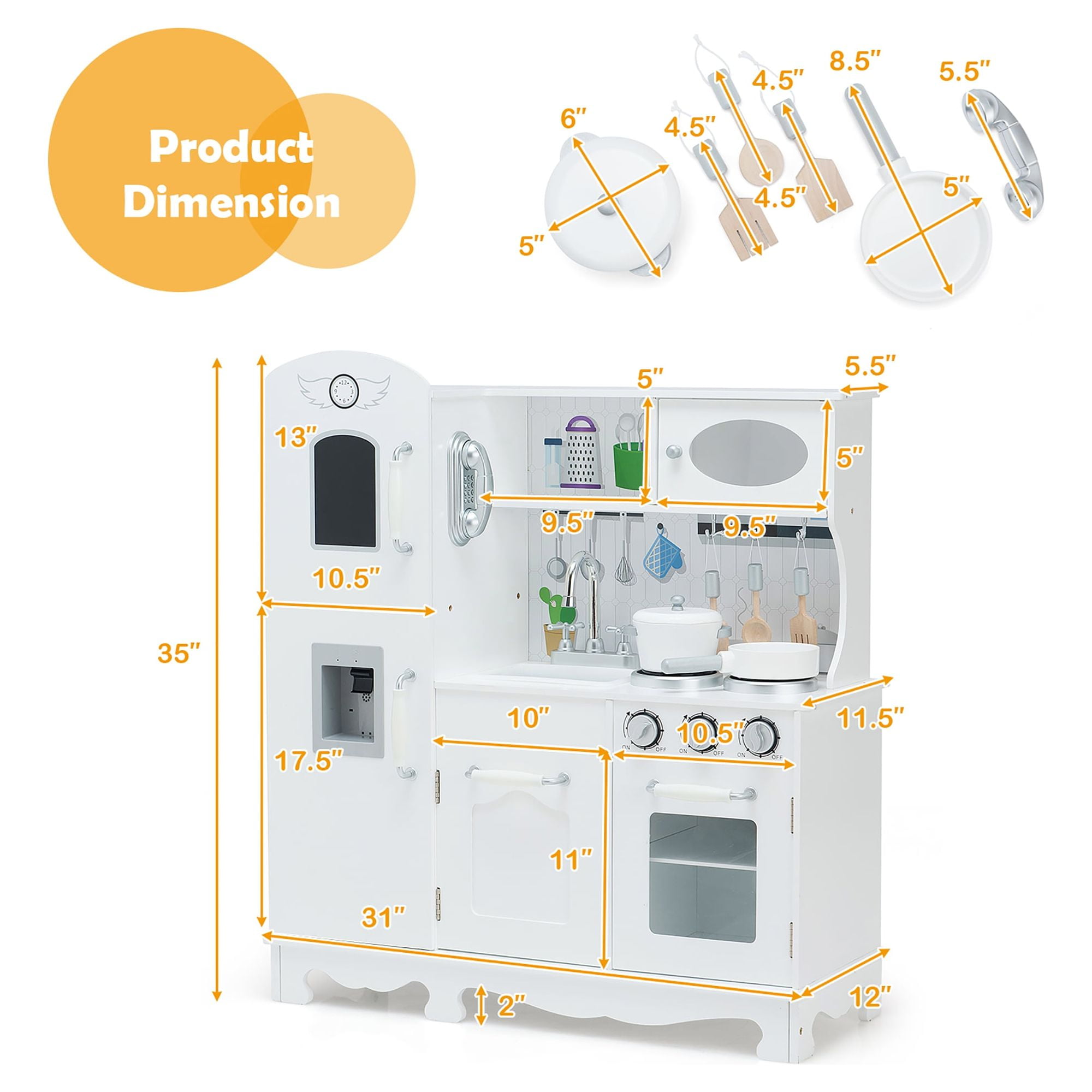 Premium & Safety Materials: Crafted out of high quality MDF boards and premium PP plastic, this pretend play kitchen set is sturdy and sturdy.Plus, with high-quality craftsmanship, the surface is smooth without burr and easy to clean. Realistic Sound & Light Effect: With this Play Kitchen toy set, your kids will enjoy being a little chef, and tasting “delicious food” from your kids. For example, parents can take orders via telephone. Moreover, featuring a water dispenser built in realistic light and sound and a simulated sink, which makes it more fun. Endless Fun with Friends: Having a role-playing game with friends and families allows your children to give full play to their imagination and provide lots of fun. Develop children’s interests and hobbies, exercise hands-on ability, and improve language expression and social skills in games. Meantime, they can also develop good washing & cleaning habits. Complete Kitchen Set: Equipped with most kitchen utensils, such as Phone,Microwave, Oven, Water Dispenser,Pot, and Pan. Spacious open shelves and enclosed cabinets are enough for storing kitchen essentials. Plus, this kitchen play set can be used as an extra locker for books, toys, and groceries when children don’t play it. Therefore, it’s also a good storage solution. Great Gift for Children: This pretend play kitchen set are suitable for any occasion as gift for boys and girls, other children or parents can also join the game, to promote the friendship, parent-child relationship. Choose it as a companion to accompany your kids’ growth. Let them have joyous childhood memories.