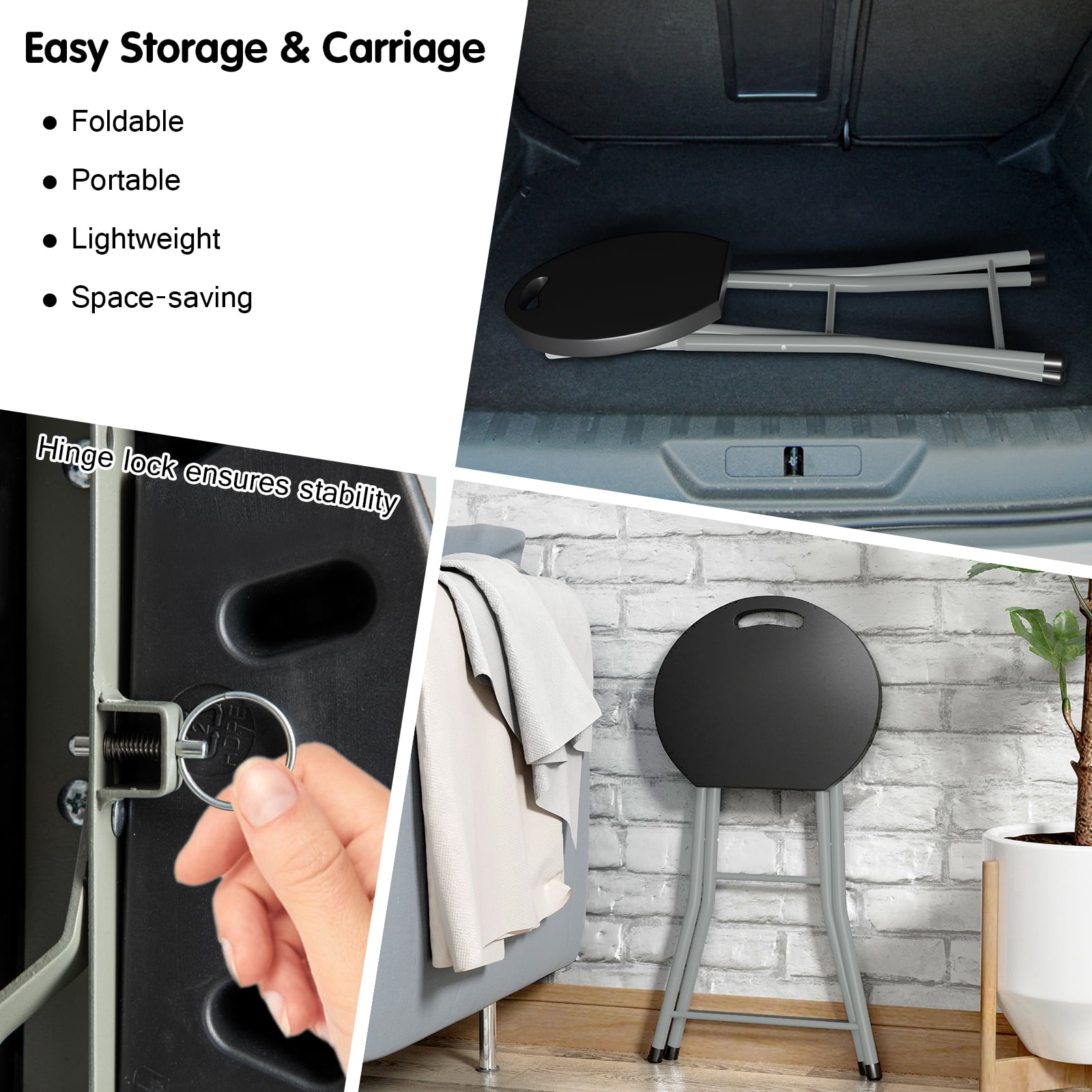 Costway Portable Folding Camp Chair, Black and Silver Portable & Foldable Design: The folable stool perfectly fits in a narrow place under the sofa, in the corner or in the trunk of your car. With an ultra light weight of 5.5lbs, you can carry the stool to anywhere you need it with ease. What’s more, the built-in handle allows for more convenient transportation Sturdy Structure: Made of heavy-duty steel frame with power coating, this folding stool boasts outstanding durability, sturdiness and rust resistance. Plus, the X-shaped frame and non-slip foot pads effectively avoid wobbliness and increase stability. Hence, the stool is able to withstand a weight up to 330 lbs Indoor & Outdoor Use: This portable and foldable stool can be widely used for camping, hiking, picnic, BBQ, traveling and other outdoor activities. Likewise, you can also use it in your living room, garage, studio, etc. And the footrests is designed for added comfort, especially when you sit for long periods of time HDPE Round Seat: The seat adopts selected HDPE material that is waterproof, stain-resistant and weather-resistant, so it not only is easy to clean, but also is durable to use. Besides, the seat panel with honeycomb structure distributes weight evenly, providing you with strong support No Assembly Required & Compact Size: There is no need to worry about hassle installation or complex instruction. This collapsible round stool can be easily expanded and folded up in just seconds. Expanded Dimension: 15″×15.5″×28″ (L x W x H), Folded Dimension: 14″ x 2.5″ x 39″ (L x W x H)