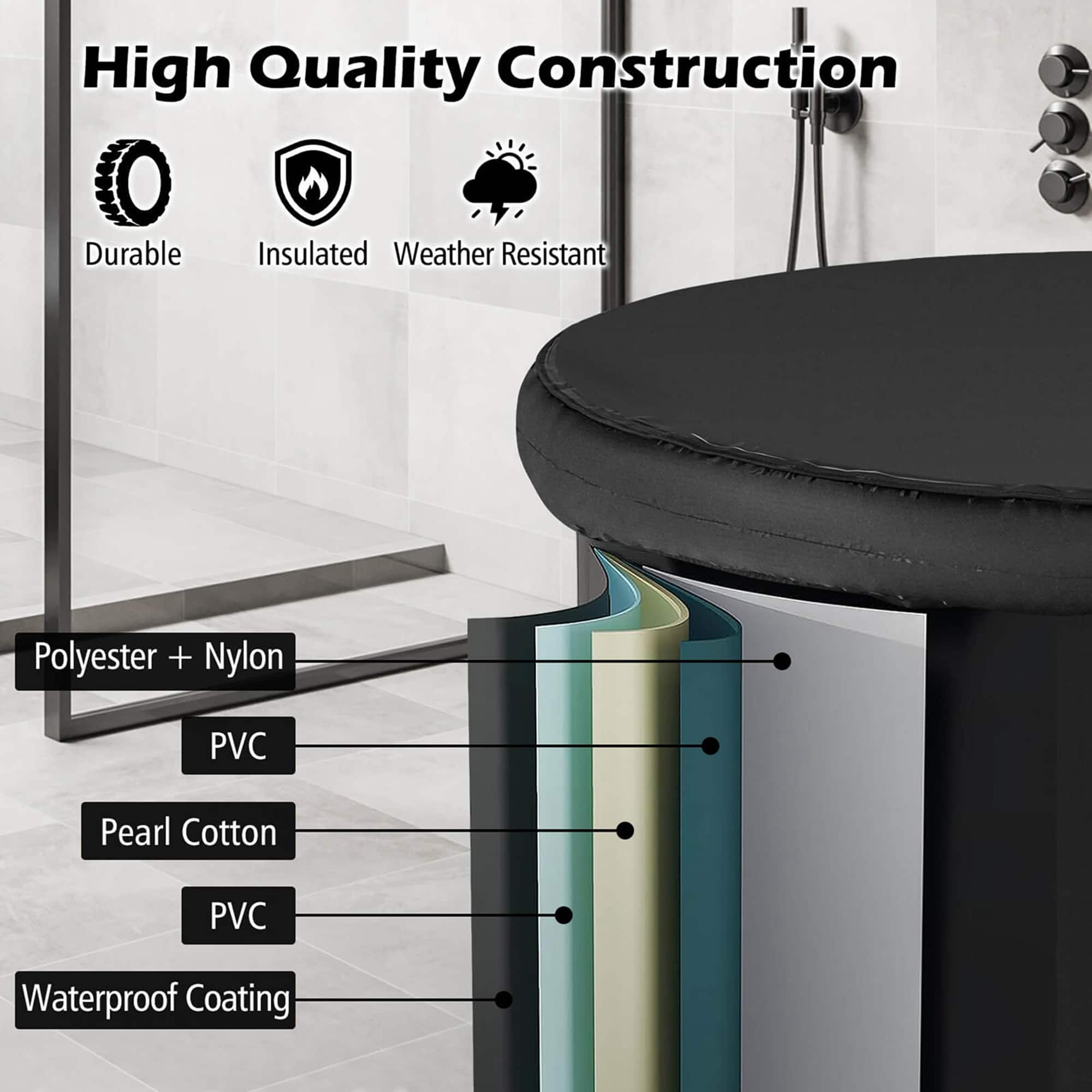Designed with 5 layers of high quality construction made of durable polyester, nylon, PVC, pearl cotton and waterproof coating, this insulated bathtub can keep your bath at the perfect temperature for a longer time, ensuring a refreshing and invigorating experience every time you use it.