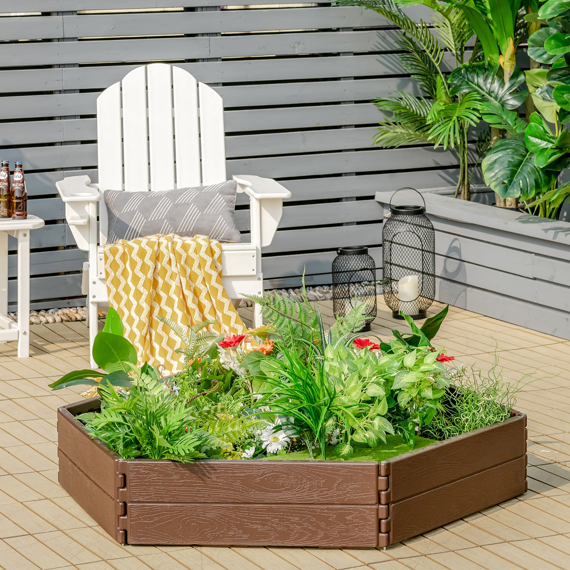 Weather-Resistant Material: The raised garden bed is made of premium HDPE material with good weather resistance, ensuring long-time outdoor use, and it is also safe and friendly for soil, ensuring the healthy growth of vegetables and flowers. Besides, the wood grain imitation surface adds a touch of nature to your garden. Great Bottomless Design: Adopts open base design, which provides a good drainage channel to prevent ex cessive water accumulation and absorb sufficient nutrition in soil for better root development. Whether planting herbs, flowers, succulents, or vegetables, you would get an ex cellent harvest in this ideal conditions. Multiple Configurations: The raised garden planter is equipped with 6 panels for free combinations, which can combine into a rectangular or a hex agon, meeting your needs of different configurations. Moreover, you can add additional garden box es to create endless unique combinations. Ample Space & Versatile Use: The large hex agon raised garden bed measures 47”x 47”x 8” (L x W x H), providing ample space to plant various plants while keeping them more convenient to manage. You can cultivate your plants in your patio, garden, yard, or greenhouse. Easy & Quick Assembly: The garden bed is easy and quick to set up and requires no tools. Just insert the metal stake to keep all parts together, then line the panels up to adjust a needed shape. Also, the metal stakes can insert into the soil for adding great stability and safety.
