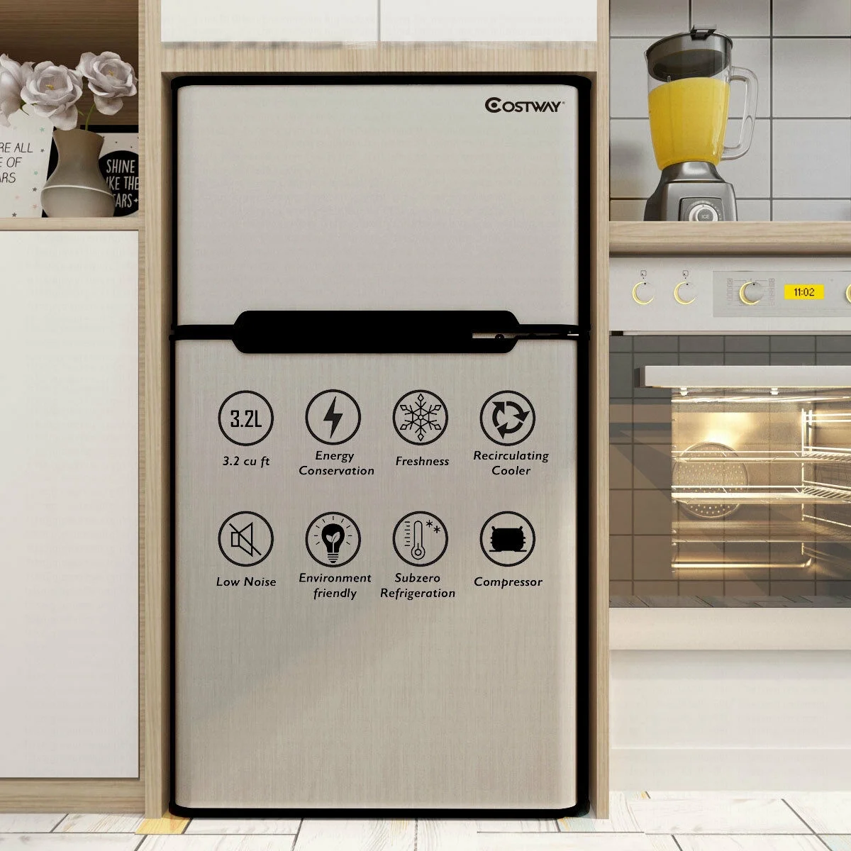 2 exterior doors allows you to access the freezer or the refrigeration compartment Material: Glass + Plastic Interior Capacity:3.2 cu.ft Temperature Range:5 – 50 Fahrenheit degree