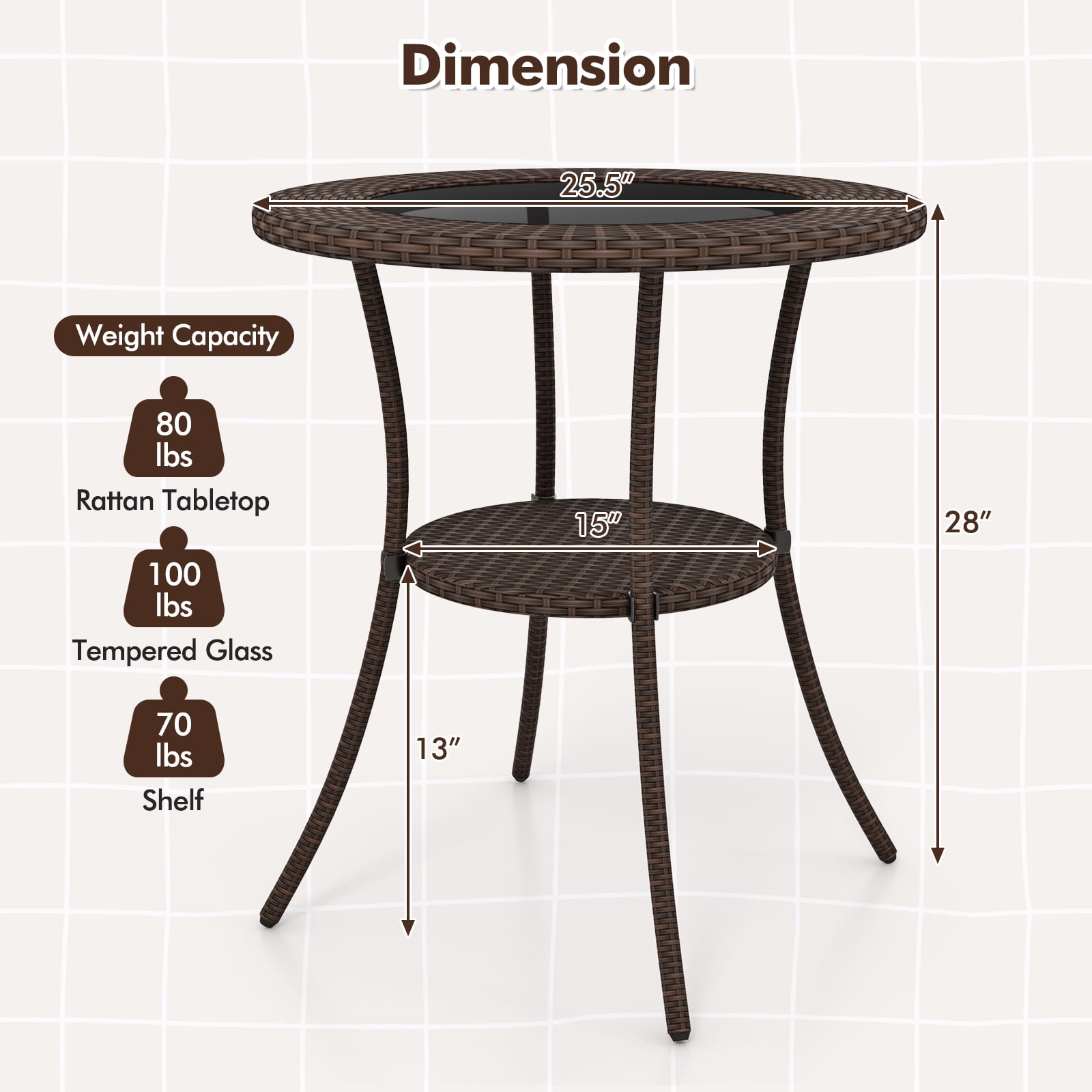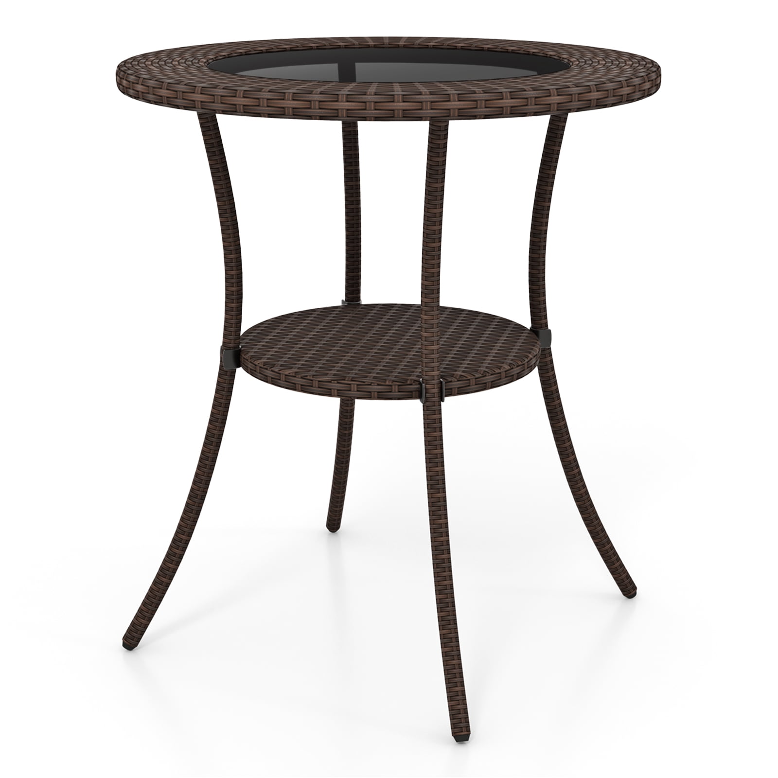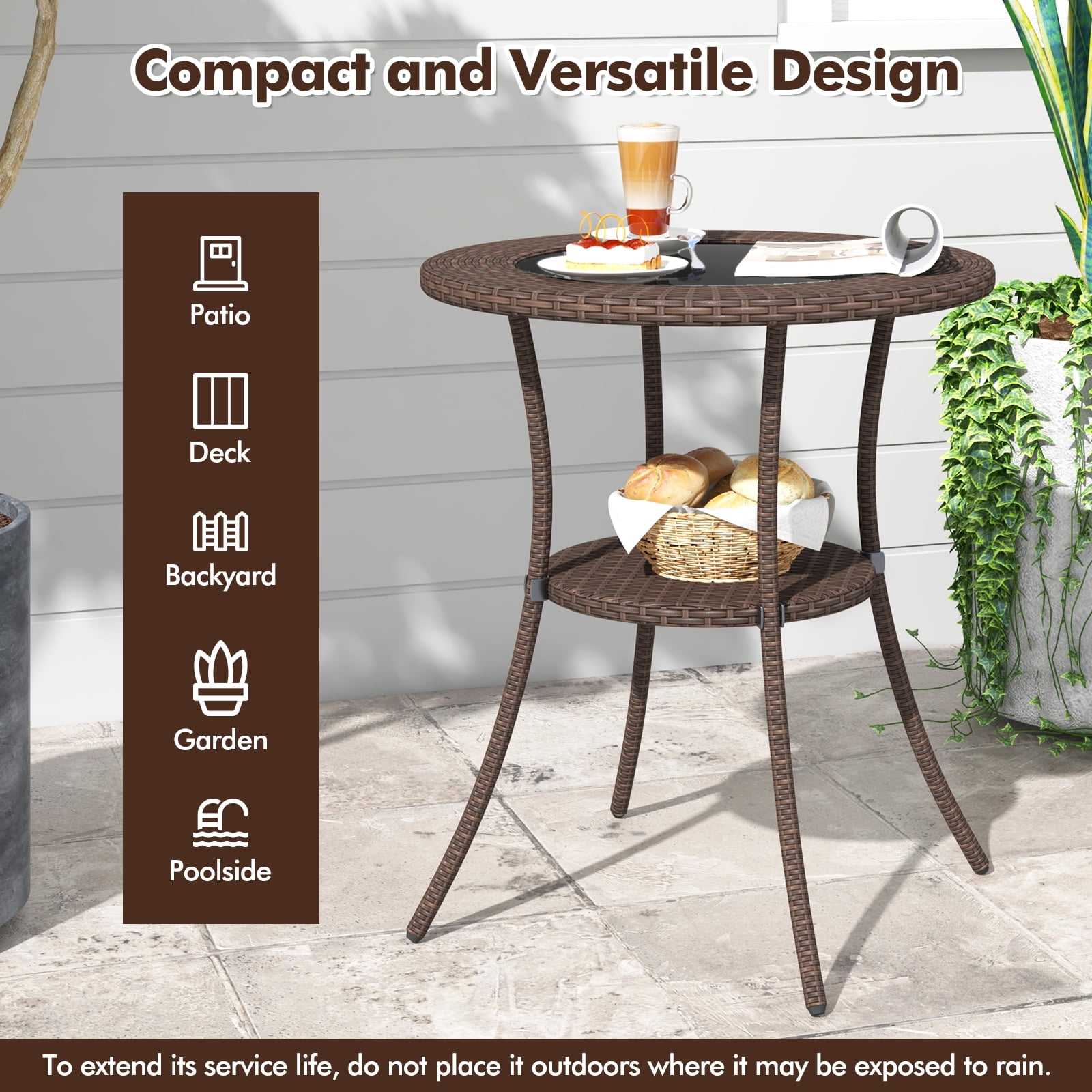 Wicker Patio Table is the perfect for your outdoor space. The brown color is neutral to complement most existing furniture. Contemporary design is exactly the right combination for your Patio or Garden spot. Sit down and enjoy a cup of coffee or have a pleasant meal outside. With it, you will enjoy your happy time. Feature WEATHER RESISITANT:High temperature tolerant, UV resistant and waterproof EASY TO MOVE:Lightweight build, you can rearrange or put into storage easily BEAUTIFUL WICKER DESIGN:Stylish, open-weave design and neutral color to fit with your backyard decor. EASY TO CLEAN:Wipe-clean surface, and tempered glass top table, easy to clean Specification Material:iron, PE rattan and tempered glass Color:brown Overall Dimensions:26″Dia. x 28″H Net Weight:15.4lbs Package include:1 x round rattan table