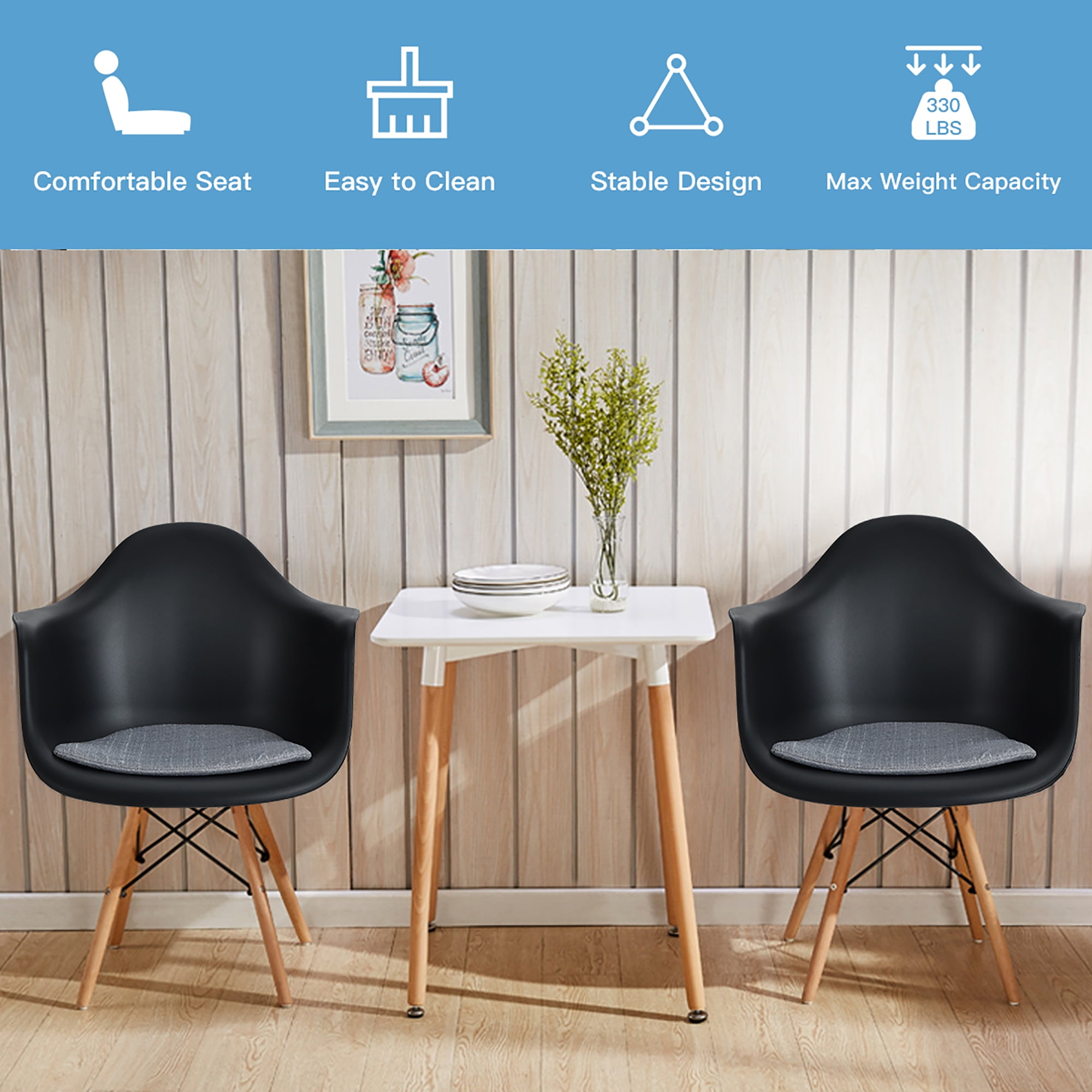 Ergonomic Backrest and Seat: This set of 2 modern chairs comes with curved back and armrest to fit the curve of human body. The round seat edge will reduce pressure on your legs. Besides, each chair is equipped with a linen cushion, helping effectively relieve the fatigue of sitting for a long time. Quality PP Seat Shell &Beech Wood Legs: Molded in quality PP material, our chair shells feature high wear and corrosion resistance. The chairs, supported by natural beech wood legs with black x-shaped metal braces, are sturdy and sturdy for safety use. The connections between seats and legs are reinforced by quality rivets, keeping the chairs firm and stable. Humanized Design& Easy Assembly: Edges of each chair in rounded design to avoid bumping. Chair legs are mounted with anti-slip pads to keep chairs from sliding and scratching the floor. The chair legs are pre-assembled for you, and all you need to do is to attach them to chair shells with hardware. Mid-Century Style Bright Your Room: The mid-century chairs feature classic color and clean lines. They serve not only a piece of furniture, but also ornamentation for your home. You can place them in your dining room, bedroom or living room, bringing a touch of modern minimalism to your room layout. Product Details: Chair Dimension: 24.5”(L) x 24”(D) x 31”(H), Seat Height: 17”, Weight Capacity: 330 LBS. In addition, don’t worry about getting chairs dirty. Stains can be easily wiped off with a damp cloth. Weighing only 9 lbs each chair, you can easily carry these chairs from place to place.