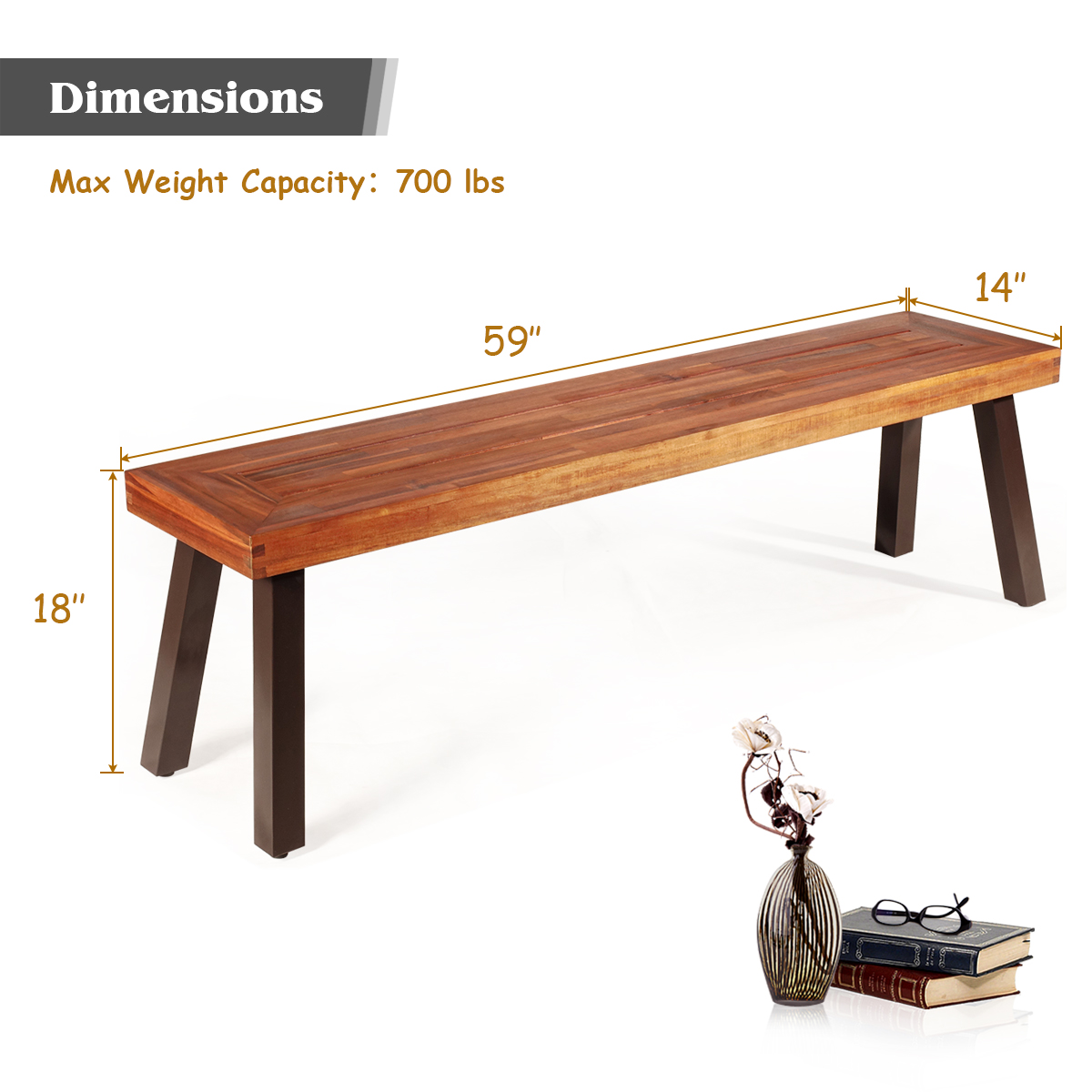 Well Selected Acacia Wood: Crafted from the premium acacia wood, this dining bench is solid and sturdy enough for long time use. It greatly highlights your home décor with clear wood tex ture. What’s more, the finished smooth surface can prevent the bench from being scratched easily. Spacious Space for Sitting: Featuring large sitting area of 59” (L)x 14” (W), every patio dining bench is available to 3 people to sit commodiously. You can combine more than one beach to meet your different needs. Put this eye-catching dining set in your backyard and relax with your family or friends. Best for Outdoor Use: Featuring with natural wood color and industrial steel legs, our bench is highly compatible with surrounding environment in your house. This bench can be used as a dining bench in backyard, a footstool in hallway and a park bench in garden or any other outdoor occasions. Easy to Assemble & Clean: With the smooth and waterproof surface, this wooden bench is easy to clean with a damp cloth in daily times. With detailed instructions and clearly defined components, this acacia wood bench can be assembled without any problems. Dimensions of Acacia Wood Bench: Bench dimension: 59”x 14”x 18” (Lx Wx H), max weight capacity of bench: 700 lbs.