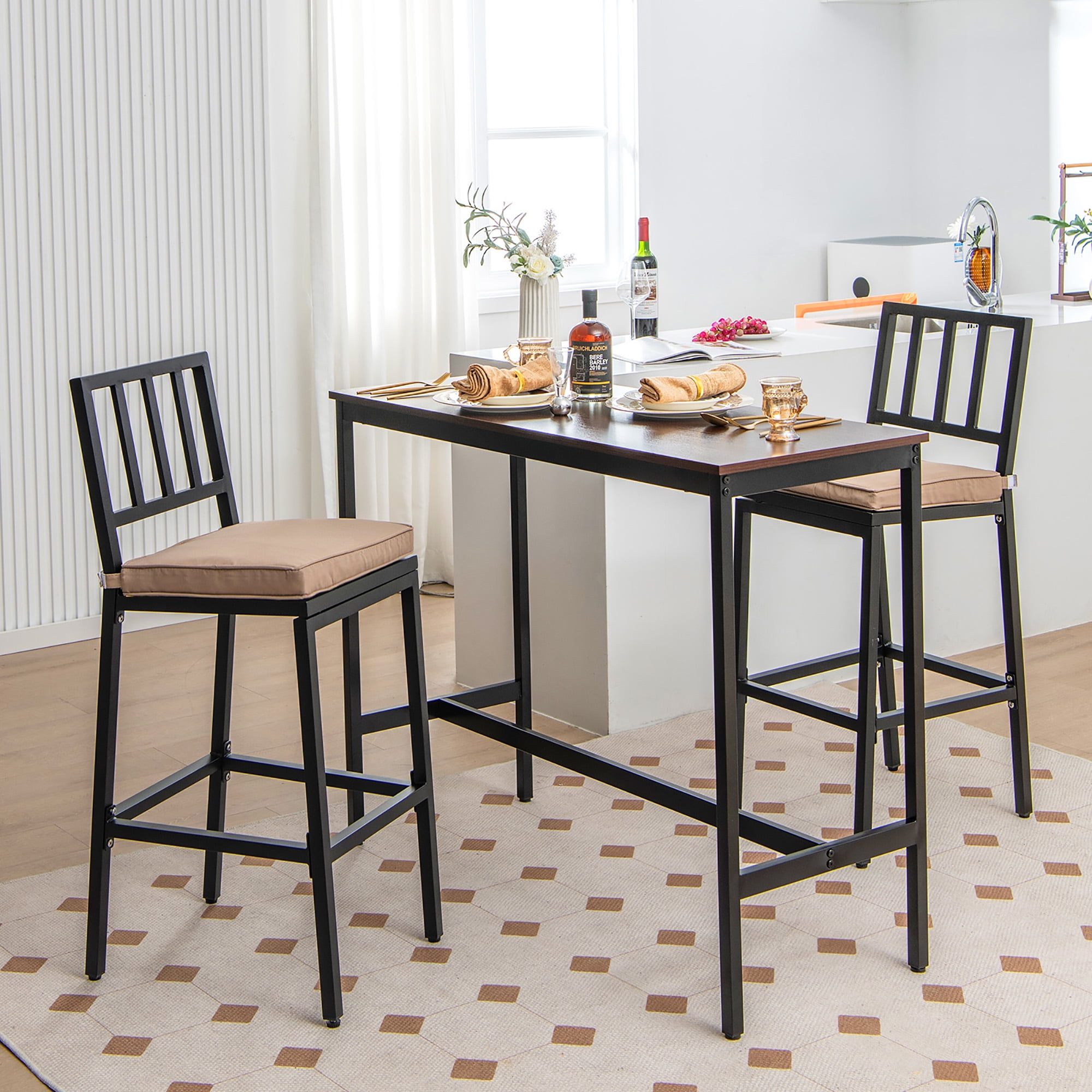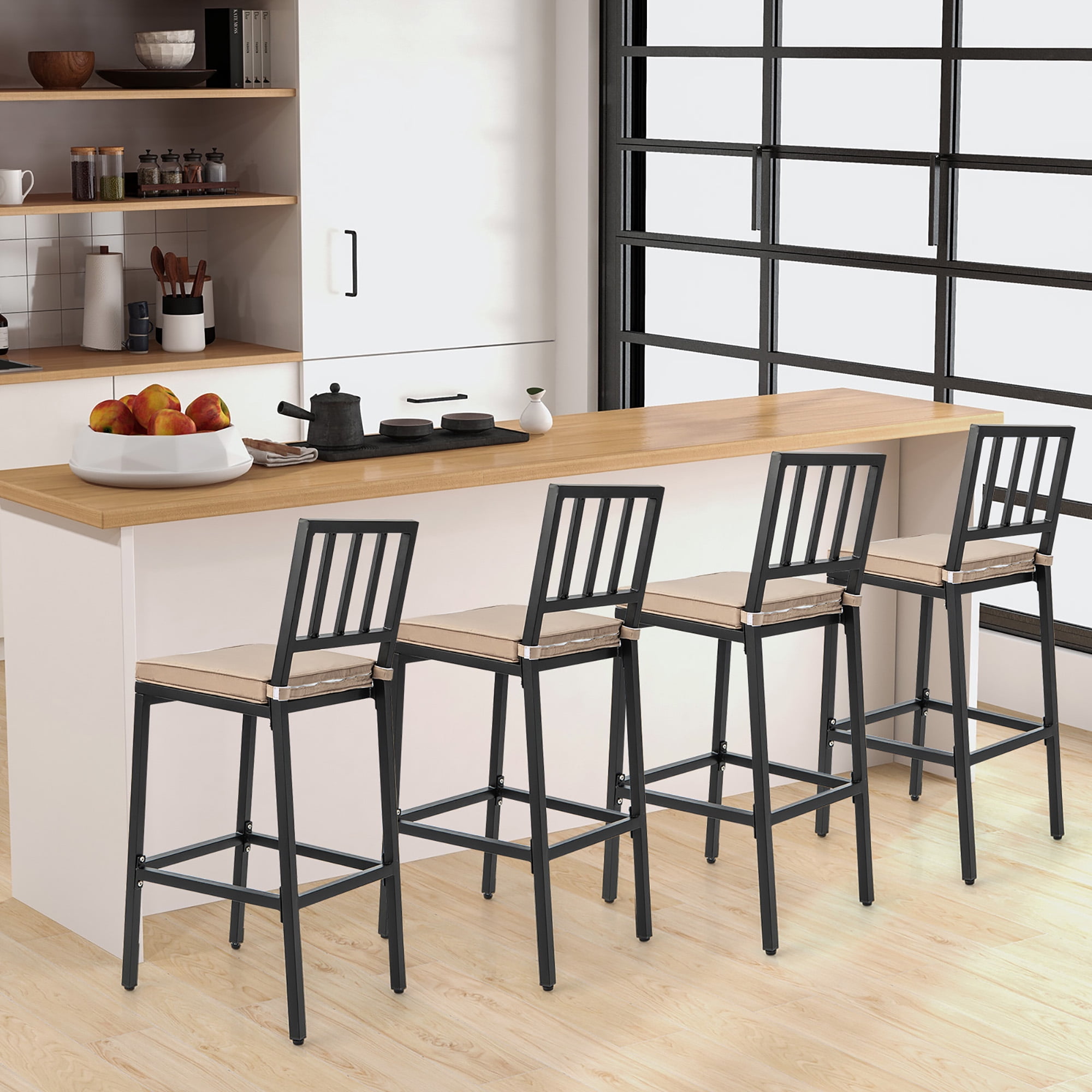 Looking for the ideal chair for your patio? Take a look at our 2-piece bar chair set! This set of chairs is designed with comfortable thickened seat cushion and high rebound sponge filled interior that will give your body plenty of support. The ergonomic backs fit the curves of your body, while the footrests give you an extremely comfortable sitting experience. The metal frame has a powder coating and is water and rust resistant, making it suitable for outdoor use. In addition, thanks to the heavy-duty metal frame, each chair can provide a weight capacity of up to 330 lbs. The simple and modern design makes this set of chairs suitable for a variety of decorative styles. Whether you use this indoor and outdoor use bar chair set in a dining room, indoor bar , balcony or poolside, it will be an ideal choice. Feature Stylish industrial appearance brings highlights to the decoration of your home Soft 1.2” cushion gives you the ultimate comfortable sitting experience Comfortable footrests allow you to relax your legs while sitting Cushion with hook and loop fasteners can be easily removed Removable cover with zipper is easy to clean and maintain Heavy-duty metal frame provides a weight capacity of up to 330 pounds Adjustable foot pads keep the chair balanced even on uneven ground For both indoor and outdoor use: suitable for dining room, kitchen, restaurant, etc. Easy to assemble with detailed instructions Note: please take the cushion away on rainy days for long-time lasting use Specification Color: Black + Beige Material: Metal, Sponge, Polyester Overall Dimension:16” x 19.5” x 40.5” (L x W x H) Seat Height (Without Cushion): 27” Footrest Height: 11.5” Net Weight: 27.5 lbs Weight Capacity of Each Chair: 330 lbs Package includes: 2 x Bar Chairs 1 x User Guide