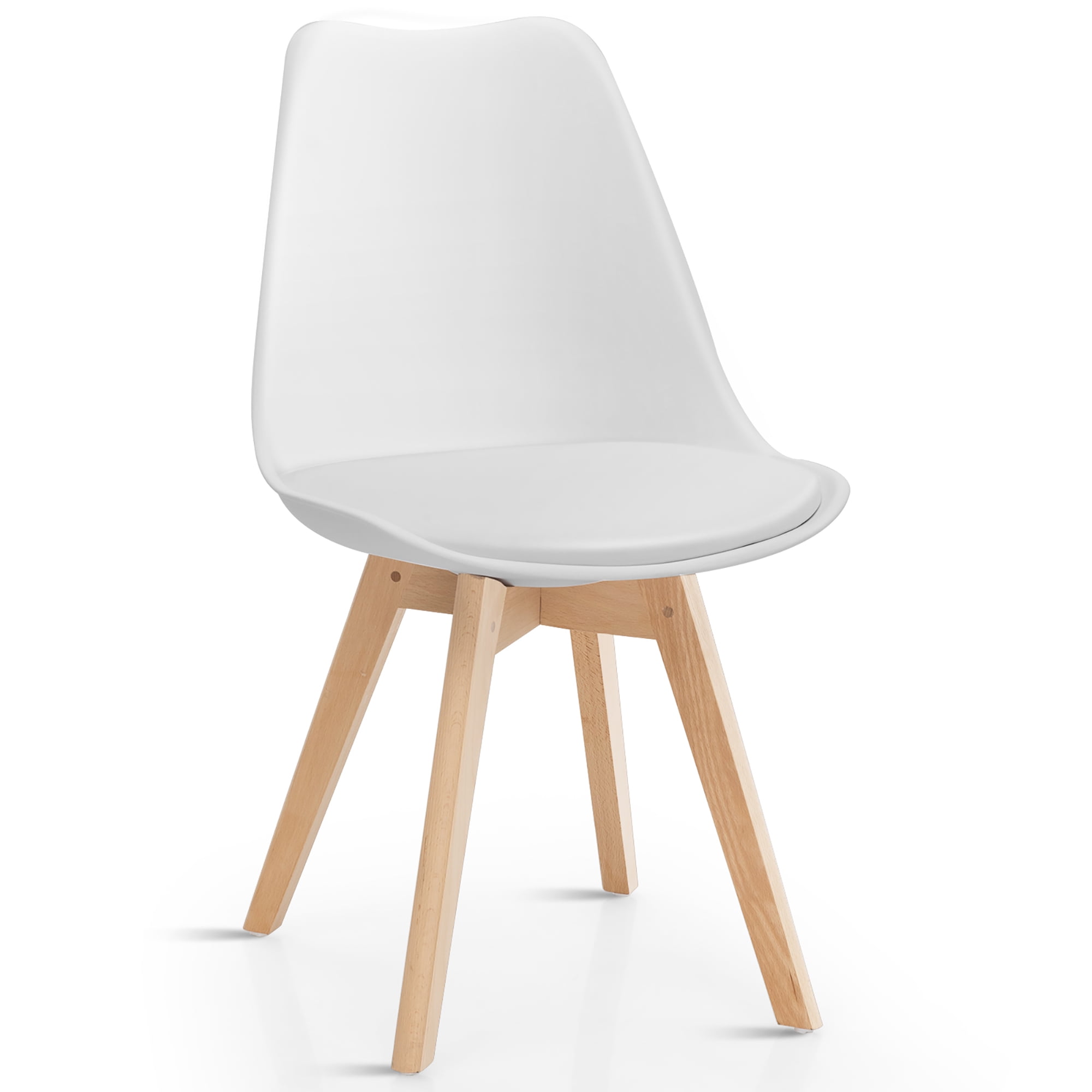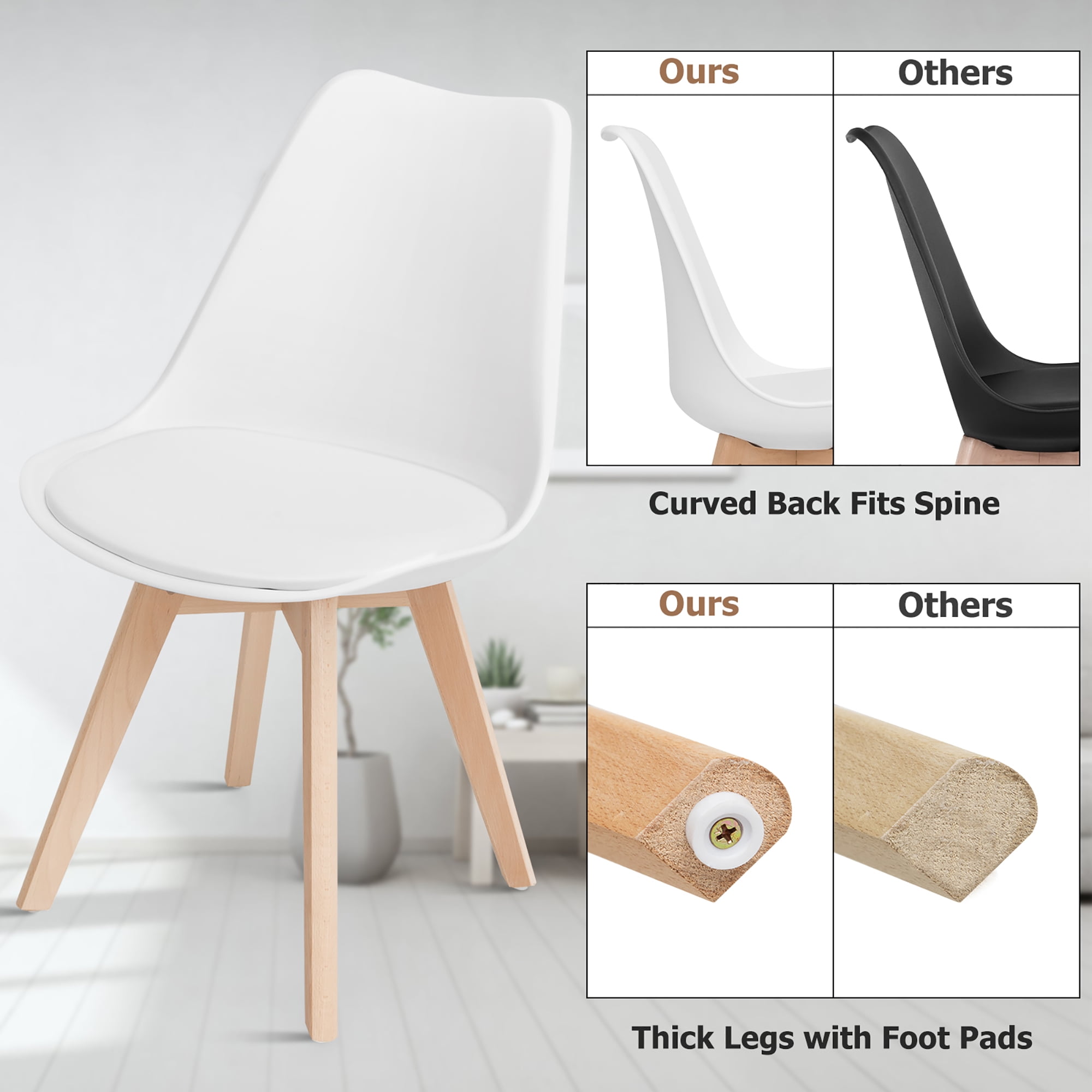 Our 4 stylish dining chairs bring eye-catching attractiveness to your dinner time. Equipped with thick cushion and curved high backrest, the chair provides you with a cozy place to take a break and release your fatigue. Made of premium PU leather and selected beech wood, the chair has great durability, stability and load capacity. At the bottom of legs, match with the noise-proof foot pads to protect the floor. Armless design provides ample space for your different sitting positions. Moreover, our 4 dining chairs with mid-century appearance and elegant lines add attractiveness to your house. You can place them in the kitchen or living room to have a small gathering. Feature Ergonomic high backrest ensures better relaxation Soft cushion chair offers comfortable sitting experience Sturdy beech wood legs ensure stability & load capacity Non-noise feet pads protect floor from scratching Waterproof and smooth PU cover for easy cleaning Modern design matches with various decoration styles Chairs set of 4 are ideal for family party & small gathering Specification Color: White Material: PP, Beech Wood, PU, Sponge Net Weight: 39lbs Product Dimension: 18”x 16.5”x 33”(L x W x H) Seat Dimension: 18”x 16.5”(L x W) Weight Capacity: 264lbs Package includes: 4 x Dining Chairs 1 x User’s Instruction