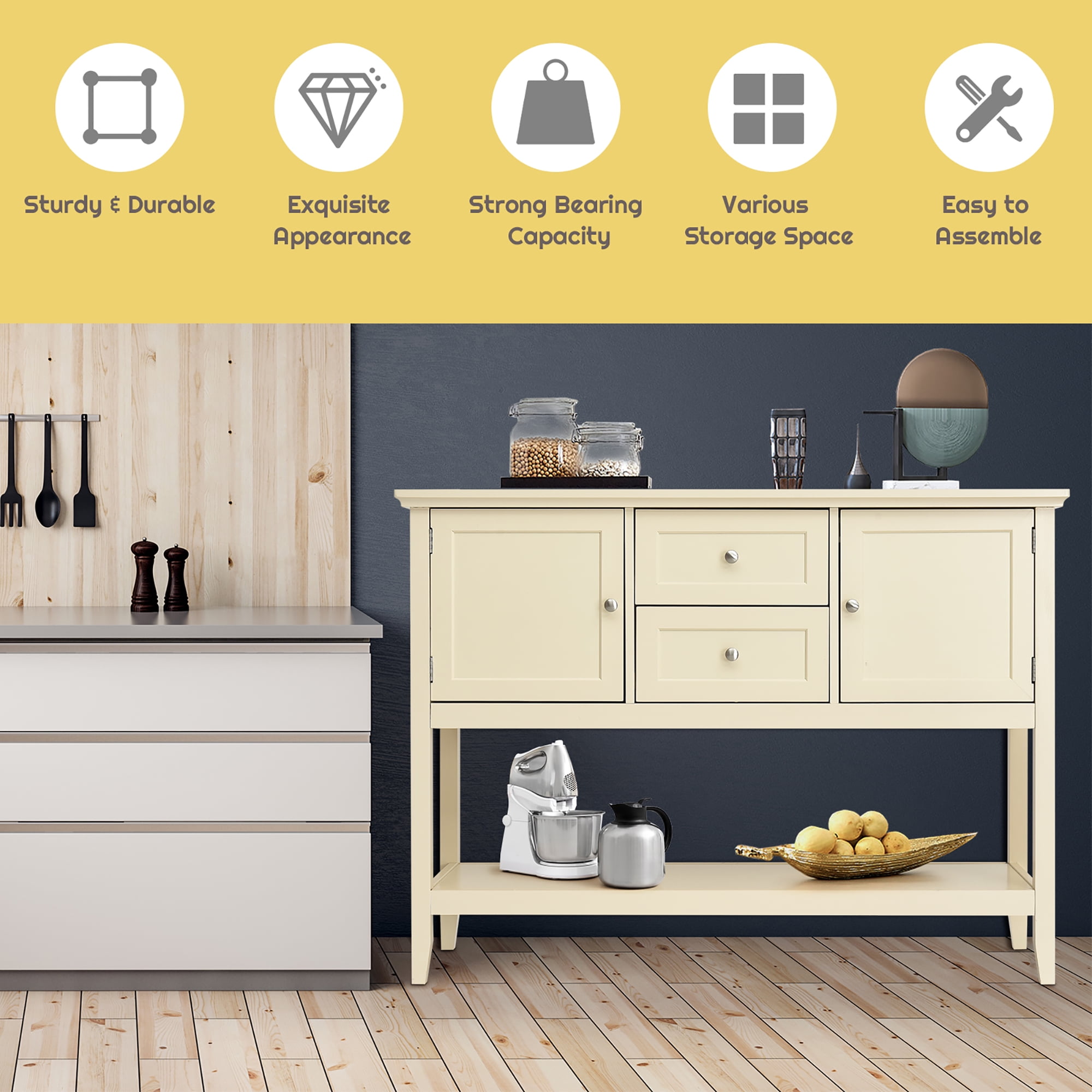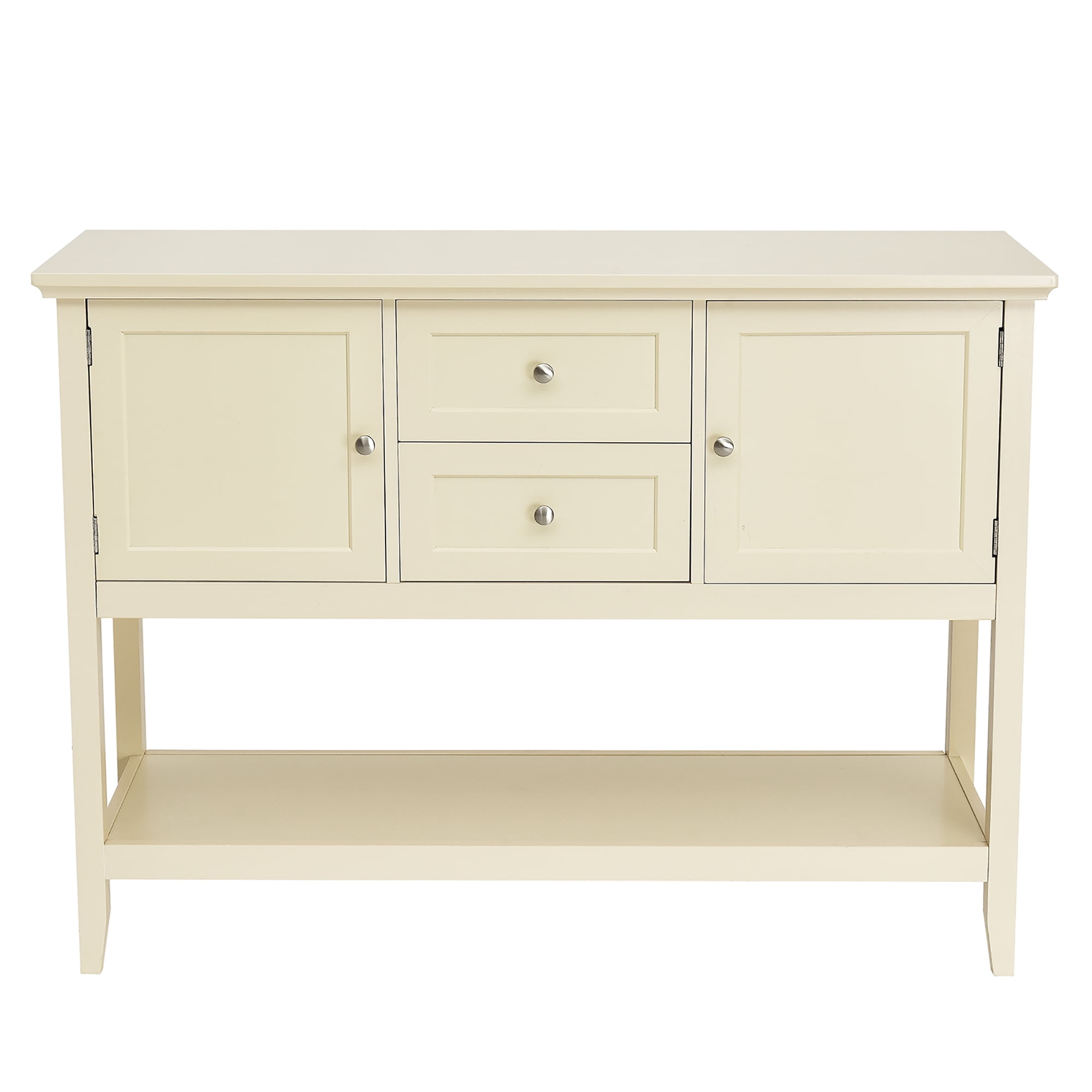 Are you bothered by the messy but essential items in your home? This wooden sideboard is your perfect choice! This console table is made of P2 MDF frame and pine wood legs, which is sturdy and stable to hold up to 220 lbs. The smooth surface is not only easy to clean, but also burr-free to protect your hands from injury. Its sturdy desktop and bottom open shelf are ideal for displaying your kitchen utensil or decorative items. Equipped with 2 cabinets and 2 drawers, the sideboard offers spacious storage space. This elegant tables can be used as a buffet table, couch table and entry table in your dining room, living room, hallway and office. Feature Premium MDF and solid pine wood to ensure stability and durability 2 cabinets and 2 drawers to provide ample storage space Top board and wide open shelf to store essentials or display belongings Metal knob and slide for pushing and pulling flexibly Used as console table, sofa table, buffet table, sideboard or entry table Suitable for living room, kitchen, hallway, office, etc Makes a high-end and elegant addition to any home decor Keeps your room tidy and organized Maximum bearing capacity up to 220 lbs Smooth surface for easy clean Easy to assemble under the detailed instruction Assembly video: Specification Color: Beige Material: MDF + Pine Wood Overall Dimension: 46” x 15” x 34” (L x W x H) Bottom Shelf Size: 42” x 14” (L x W) Weight Capacity: 220 lbs Net Weight: 63 lbs Package Includes: 1 x Buffet Sideboard 1 x Instruction