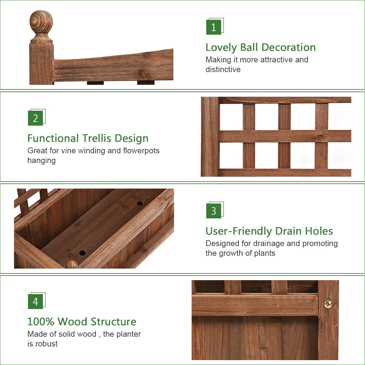 Are you still sad about not having a beautiful garden? Our planter with trellis can solve your problem. This is our planter with trellis which is made of solid wood and has unique and beautiful appearance. The natural fir is weather-resistance and sturdy which can be used for a long time. You don’t have to worry about the wood breaking which is caused by exposure to the sun and wind. This pot has a grid design to support your climbing plants. The water outlet can be easily drained, allowing the plant to grow better. Our planter with trellis has a very large flower box that can hold a variety of plants you like. Of course, you can also grow crops. The exterior design is simple and easy to match and it is ideal to place in yard, garden, patio or balcony to be a perfect decor with many of your favorite plants. Our planter is definitely superior in quality and reasonable in price. Feature 100% solid wood for stability and durability Weather-resistant design is great for outdoor using Suitable for being placed in the balcony, garden and yard Designed with drain hole to prevent rotting of roots Large storage space for planting more plants High load capacity allows more plants to be suspended The built-in trellis offers great support for climbing plants Create a romantic pastoral atmosphere for your yard Easy installation needed Specification Color: Dark brown Material: fir Net weight: 9.24lbs Product dimensions: 25” (L) X 11” (W) X 30” (H) Inside dimension: 23” (L) X 8.5” (W)X 6”(H) Mesh size: 25” (L) X 21” (H) Package includes: 1X planter with trellis 1x Instruction Book