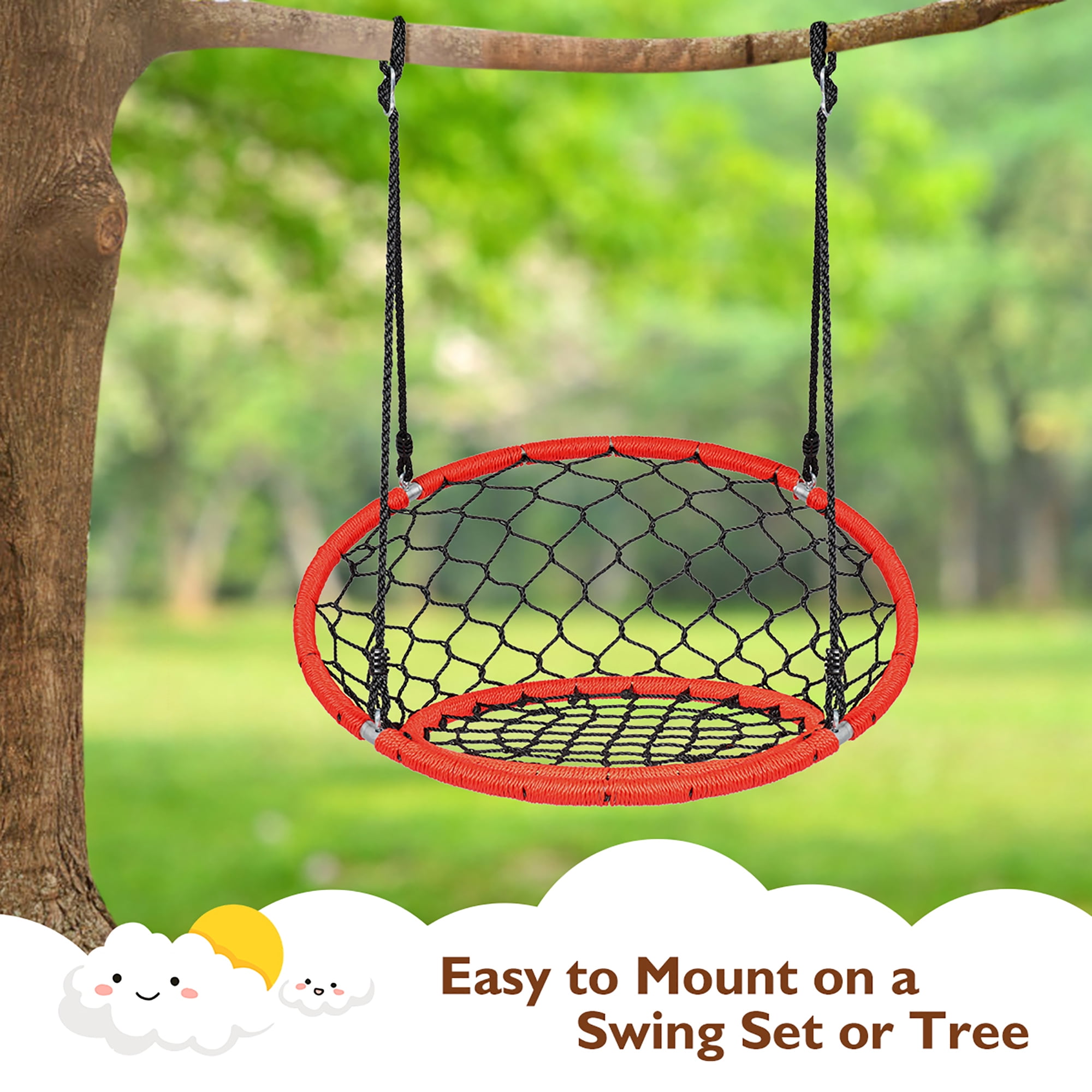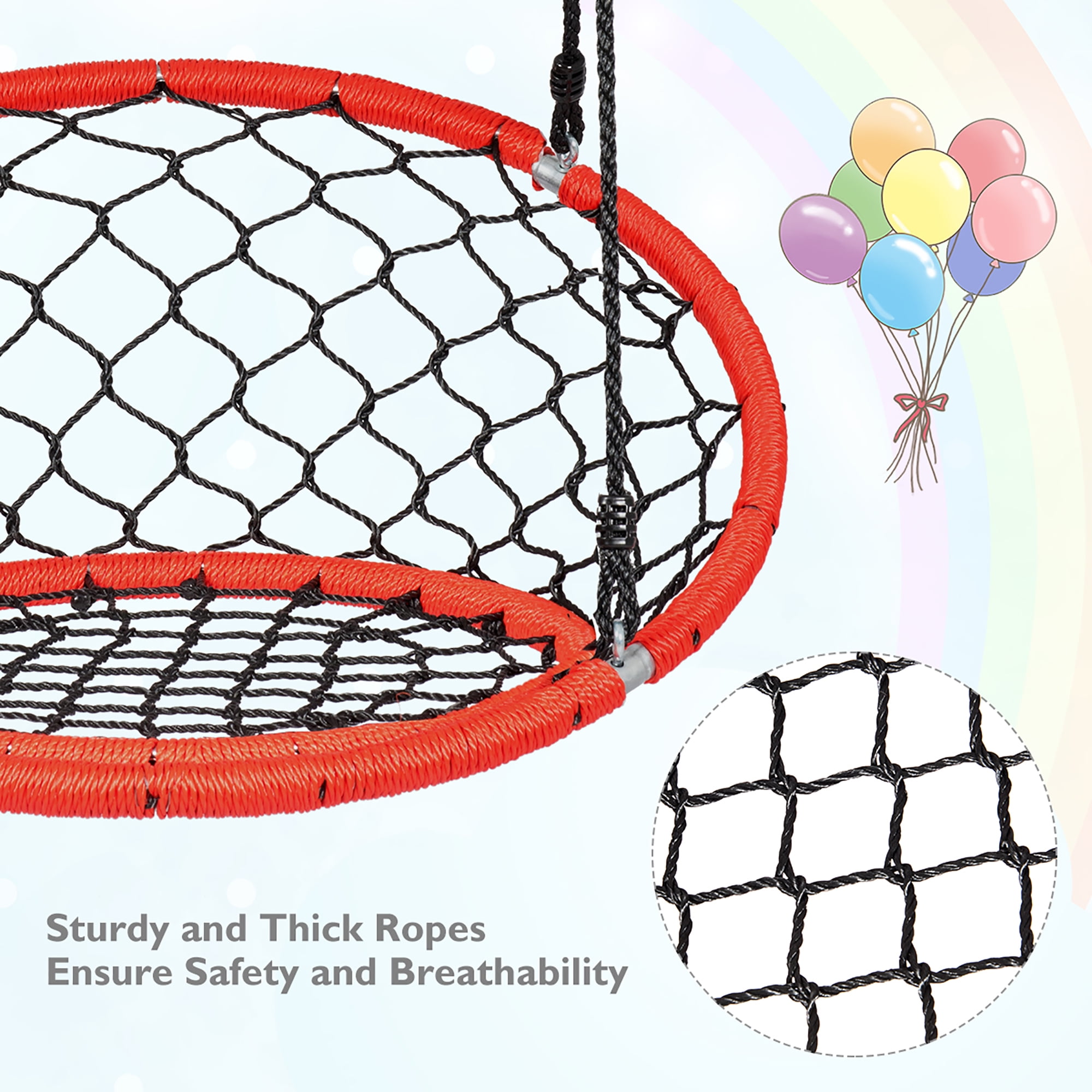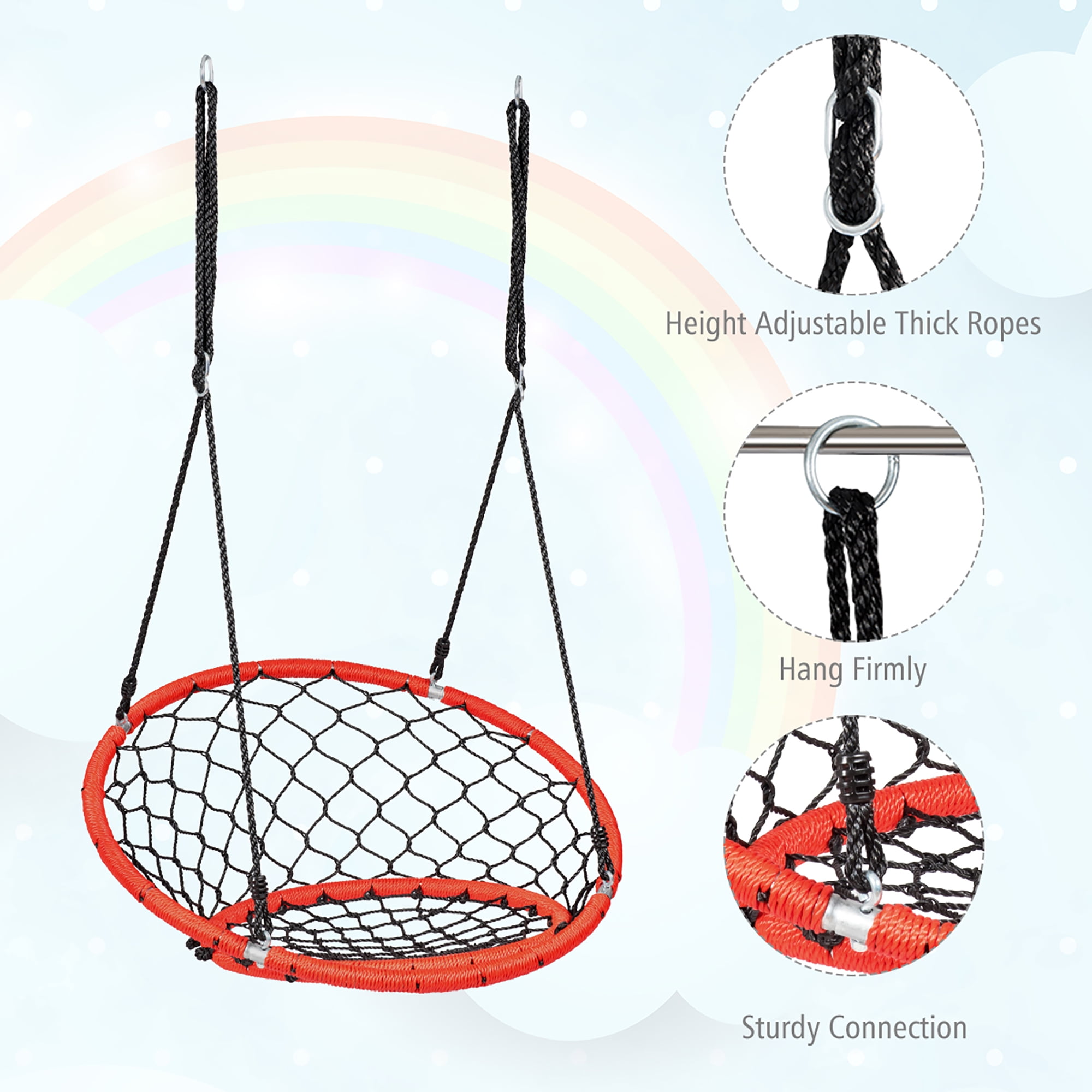 Costway Spider Web Chair Swing with Adjustable Ropes for Kids, Orange Yearround fun for kids: The web chair swing is designed for excitement, making it a favorite among children and adults alike Safe and durable materials: Constructed from sturdy galvanized pipes and thick ropes, this swing ensures longterm use and a strong loadbearing capacity Adjustable height: The 63inch rope can be easily adjusted between 40 inches and 63 inches to accommodate your child’s needs Easy to assemble and use: Designed for simplicity, this swing can be quickly hung from a tree branch or attached to a swing set Multiple functions: Ideal for sitting, reading, or playing, this versatile swing can be used in various locations such as backyards, parks, or homes