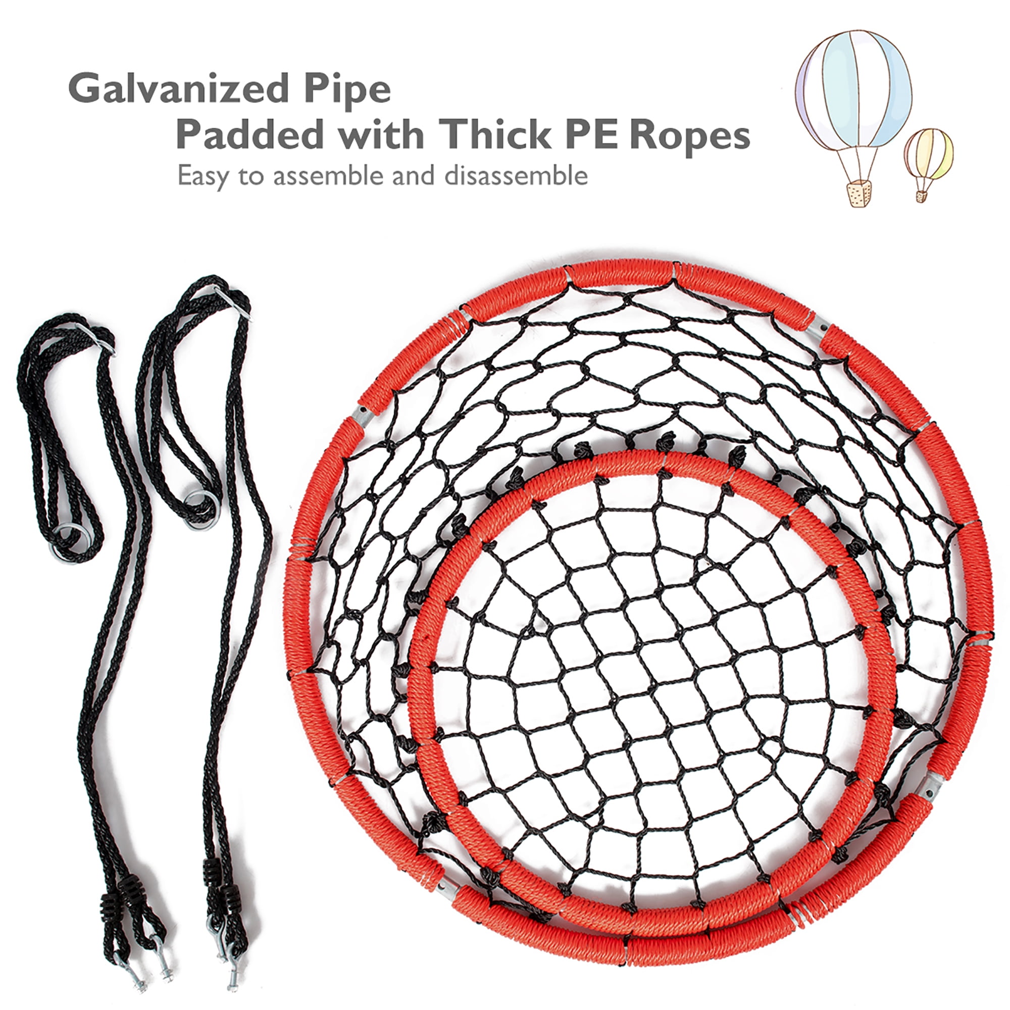 Our web chair swing will bring much pleasure to your family! Made of sturdy galvanized pipes and thick ropes, this web chair swing will have your kids playing for hours on end. It is built to withstand 330 lbs of static weight and features a round base with strong PE ropes that will last. And you can freely adjust the height of the ropes to meet different needs. It can be easily connected to trees or swing hangers. Your kid can safely sit, play, read and chat on the swing. This pleasing appearance and practical application will definitely satisfy your needs. It is the best gift for your kids! Feature Provides a fun hang out space for kids to safely swing into action during playtime Thick ropes and sturdy galvanized pipes ensure great load-bearing capacity Backrest design for maximum comfort Adjustable heights to satisfy various needs Easy to install, disassemble and store, saving you time and effort Perfect lounging space to play, read, listen to music, daydream and relax Long life with anti-aging feature, ductile and wearable Resilient and resistant to all types of weather Specification Color: Orange+Black Material: Galvanized Pipe, PE Rope Diameter: 35” Adjustable Height: 40” – 63” Net Weight: 10 lbs Max Capacity: 330 lbs (Static), 220 lbs (Dynamic) Package Includes: 1 x Web Chair Swing 1 x User’s Manual