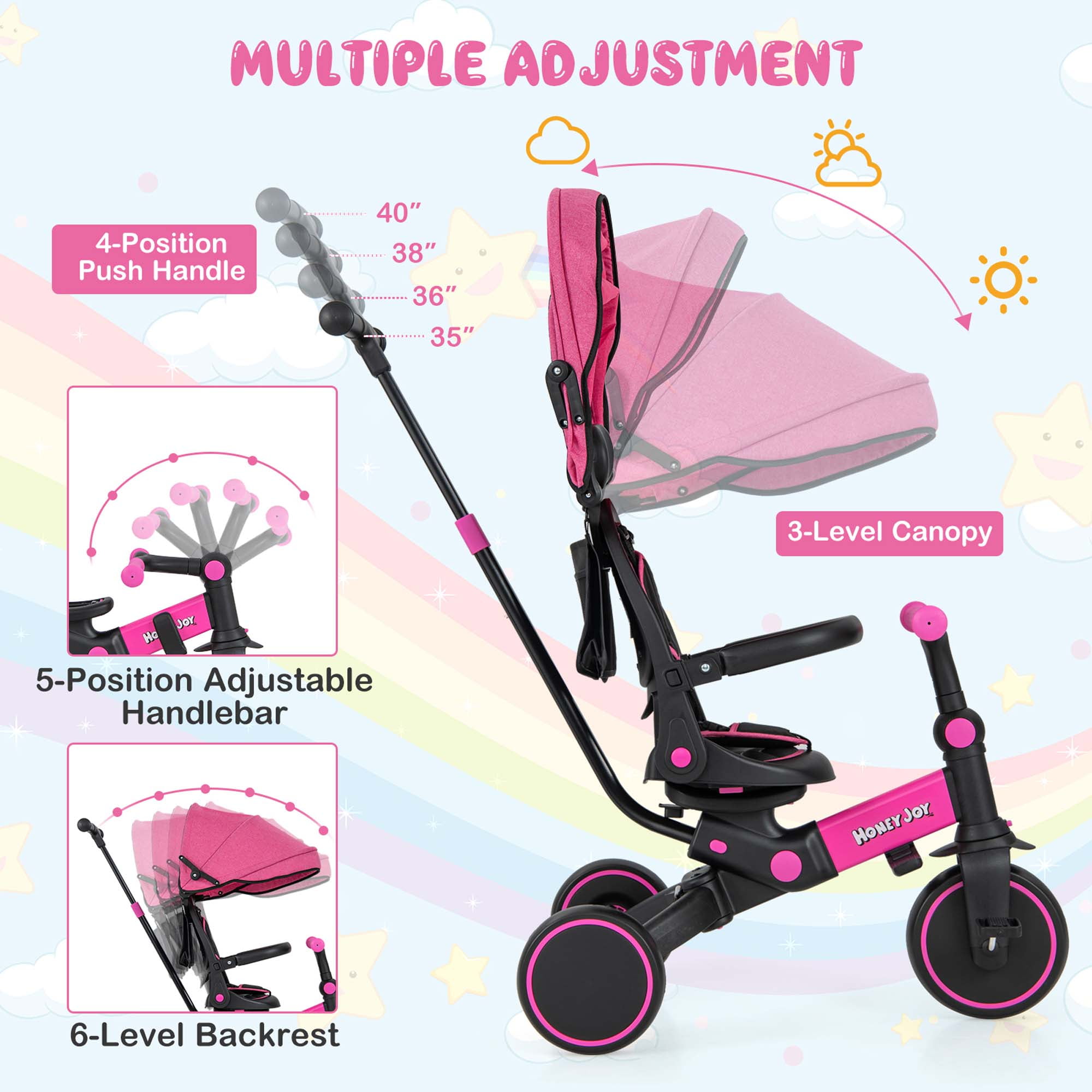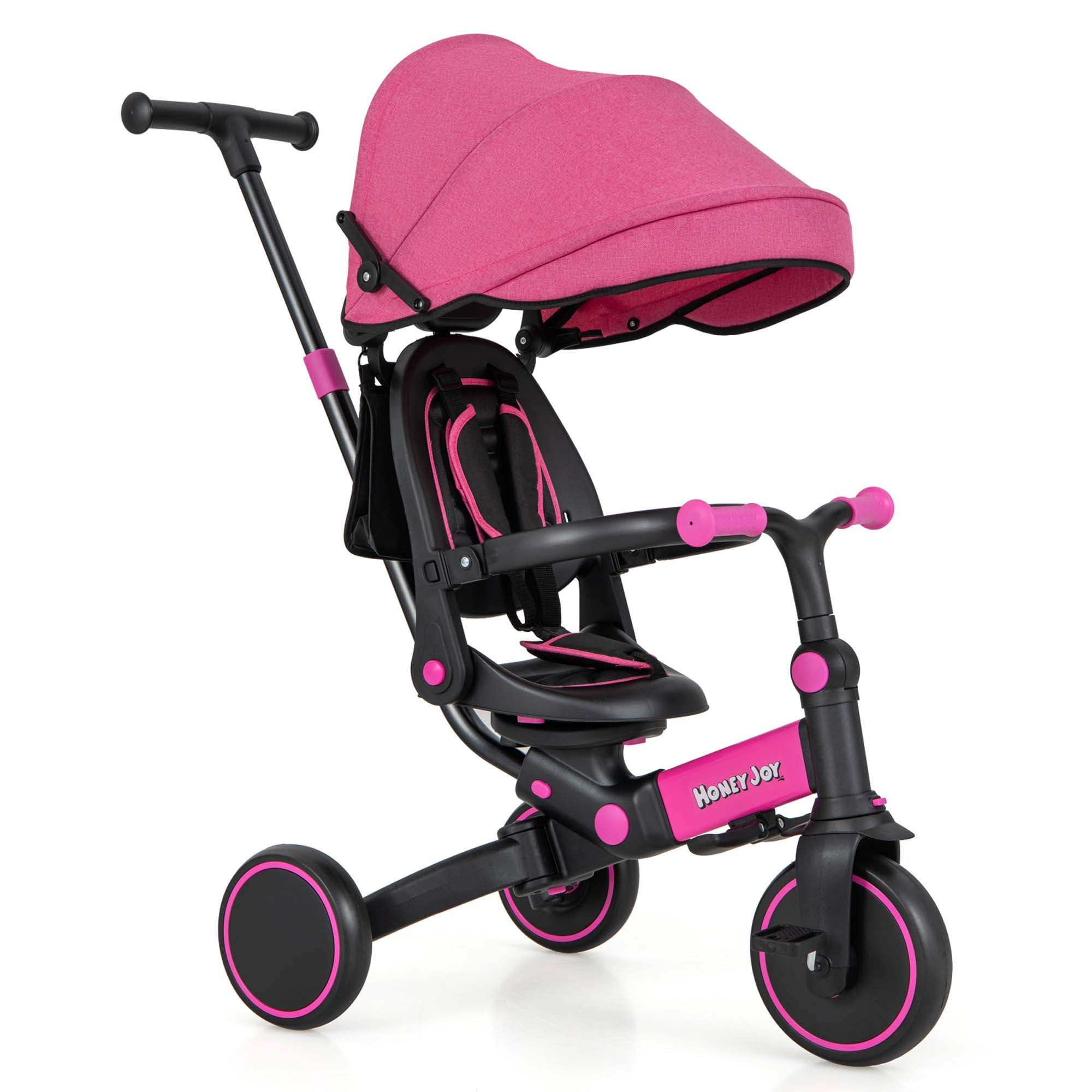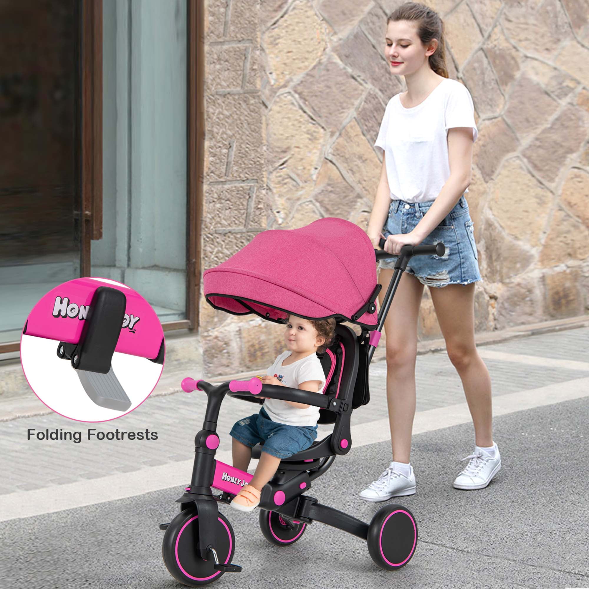 Costway Toddlers Pink Foldable Tricycle Multifunctional Kids Trike: This versatile trike easily switches between various modes, including toddler bicycle, seatreversed trike, steering tricycle, classic tricycle, push tricycle, learntoride tricycle, kids bike, and balance bike, making it suitable for children aged 12 to 72 months Fully Adjustable Design: Features a 3level canopy for sun protection, an adjustable backrest, and handlebars to ensure a comfortable riding posture. The 4position push handle can be adjusted to preferred heights (35”, 36”, 38”, 40”) for parents’ convenience Multiple Safe Protection: Equipped with removable guardrails and a 3point safety belt, this trike ensures comprehensive protection for toddlers. Round and burrfree edges enhance safety during use UserFriendly Details: Includes an extra headrest for comfort, a detachable storage bag for essentials like diapers and cups, and a folding footrest for resting little legs. The tricycle features 3 wearresistant wheels for smooth movement on various surfaces Sturdy Structure & Perfect Size: Constructed from quality aluminum alloy, this trike supports a weight capacity of up to 55 lbs. Its stable triangular structure ensures steadiness. Product dimensions are 37” x 19” x 35”/36”/38”/40” (L x W x H), with a seat height of 13” in bike mode