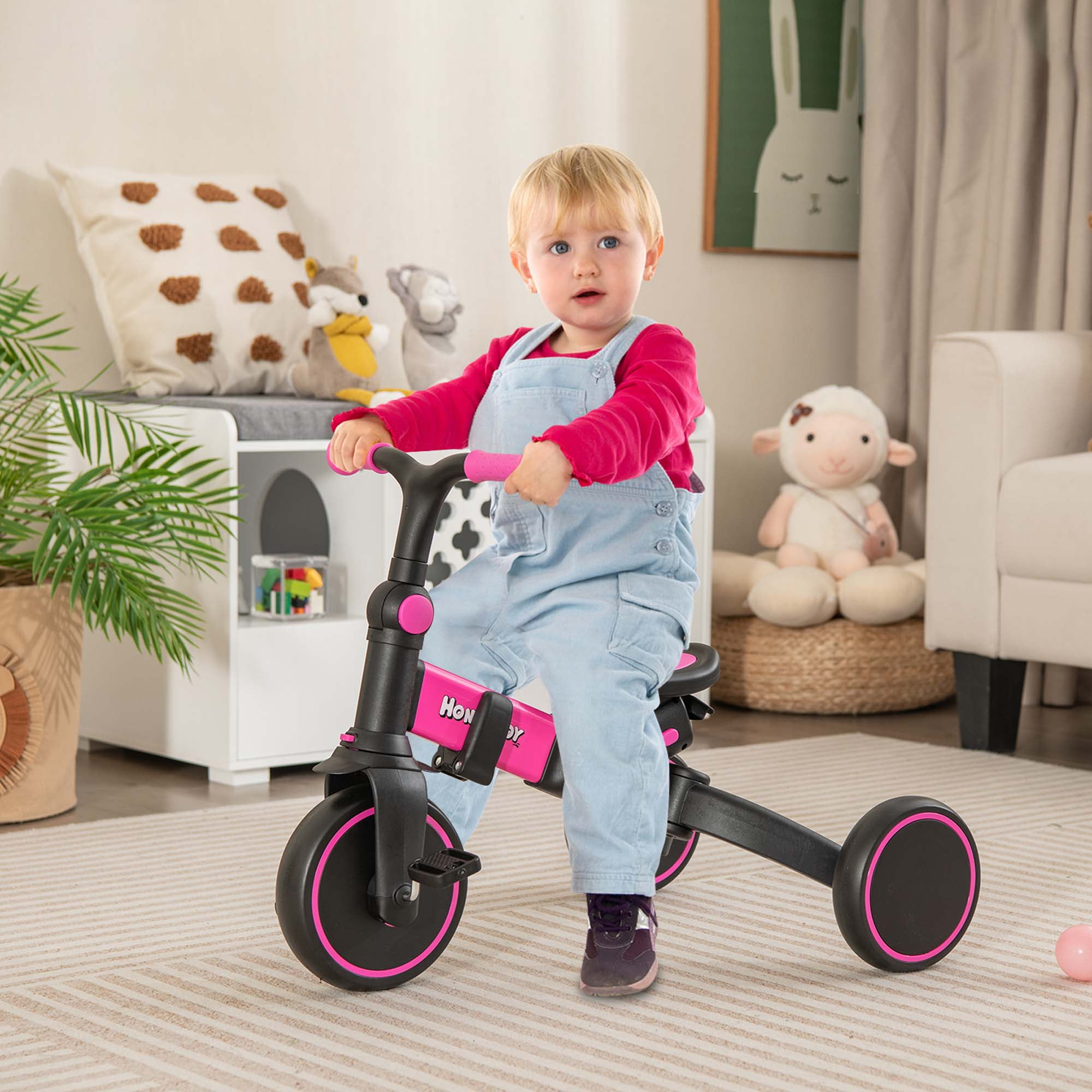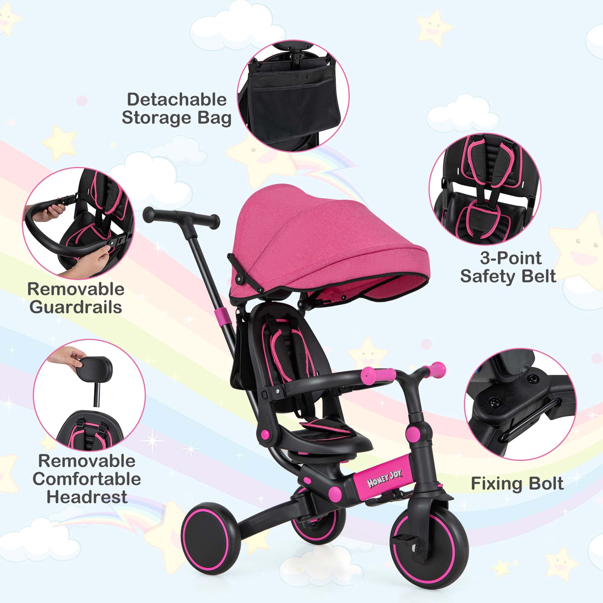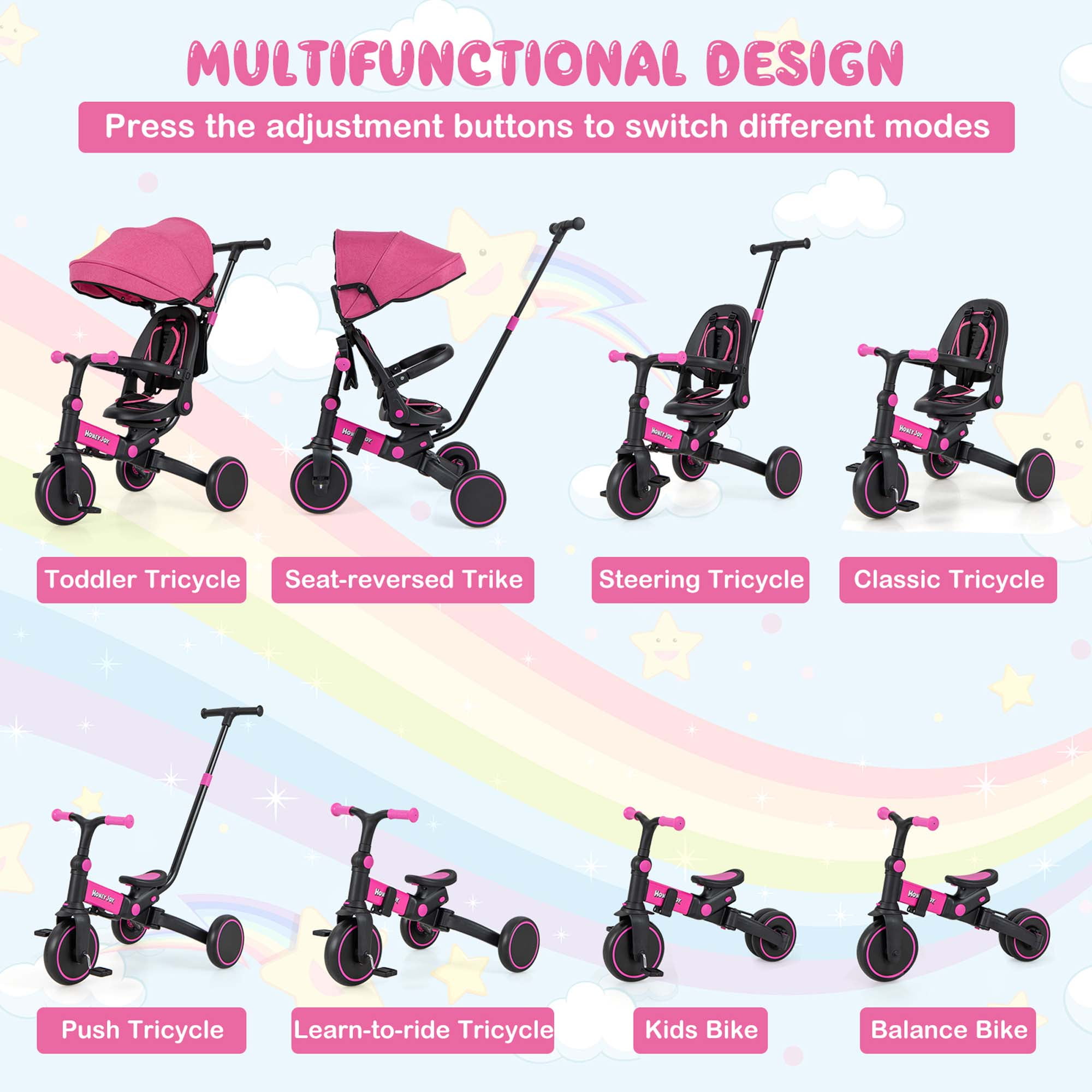 Costway Toddlers Pink Foldable Tricycle Multifunctional Kids Trike: This versatile trike easily switches between various modes, including toddler bicycle, seatreversed trike, steering tricycle, classic tricycle, push tricycle, learntoride tricycle, kids bike, and balance bike, making it suitable for children aged 12 to 72 months Fully Adjustable Design: Features a 3level canopy for sun protection, an adjustable backrest, and handlebars to ensure a comfortable riding posture. The 4position push handle can be adjusted to preferred heights (35”, 36”, 38”, 40”) for parents’ convenience Multiple Safe Protection: Equipped with removable guardrails and a 3point safety belt, this trike ensures comprehensive protection for toddlers. Round and burrfree edges enhance safety during use UserFriendly Details: Includes an extra headrest for comfort, a detachable storage bag for essentials like diapers and cups, and a folding footrest for resting little legs. The tricycle features 3 wearresistant wheels for smooth movement on various surfaces Sturdy Structure & Perfect Size: Constructed from quality aluminum alloy, this trike supports a weight capacity of up to 55 lbs. Its stable triangular structure ensures steadiness. Product dimensions are 37” x 19” x 35”/36”/38”/40” (L x W x H), with a seat height of 13” in bike mode