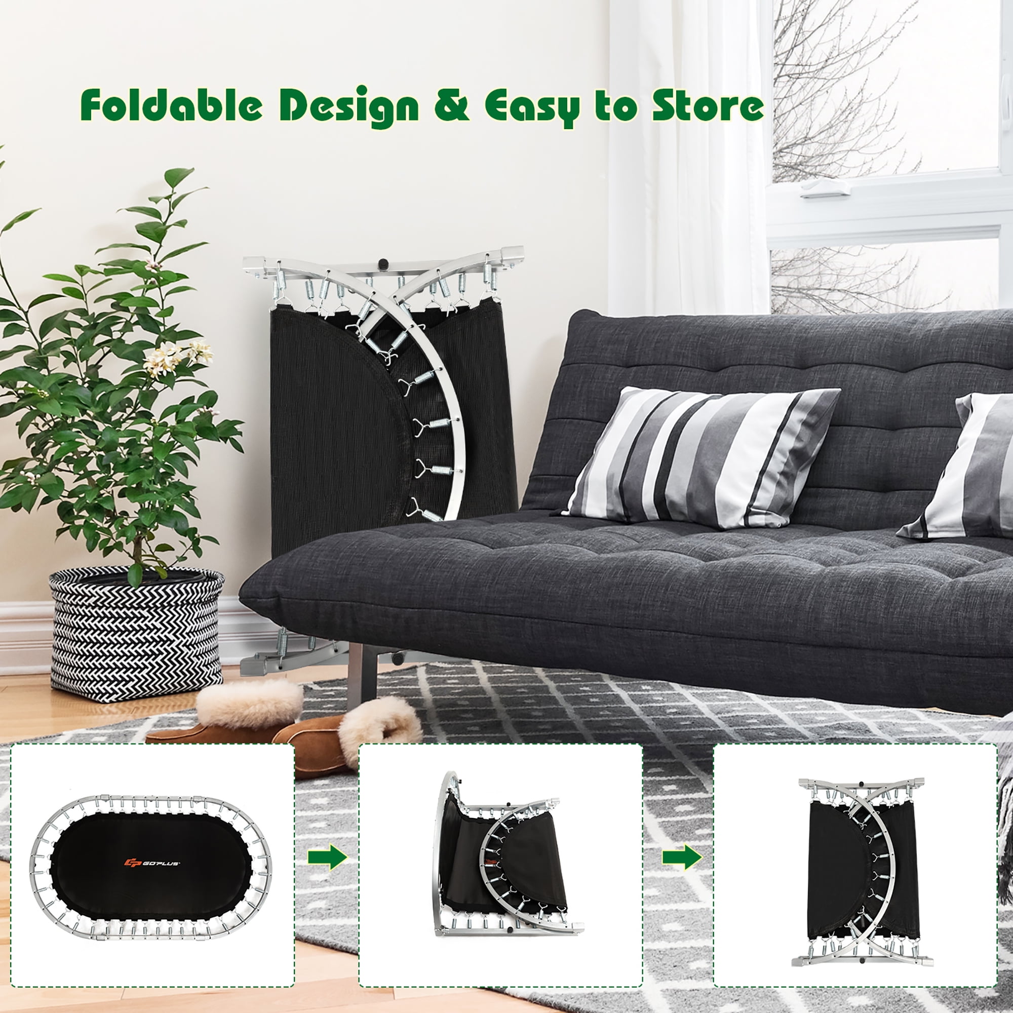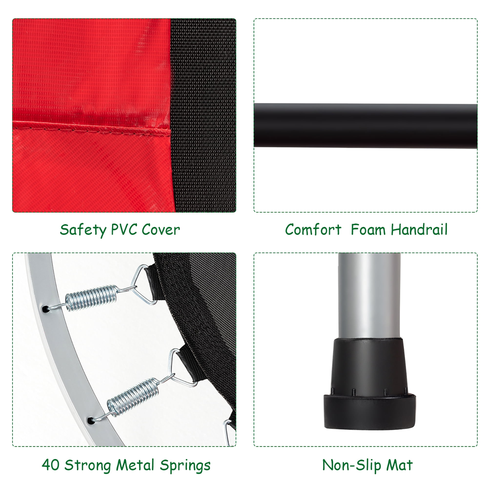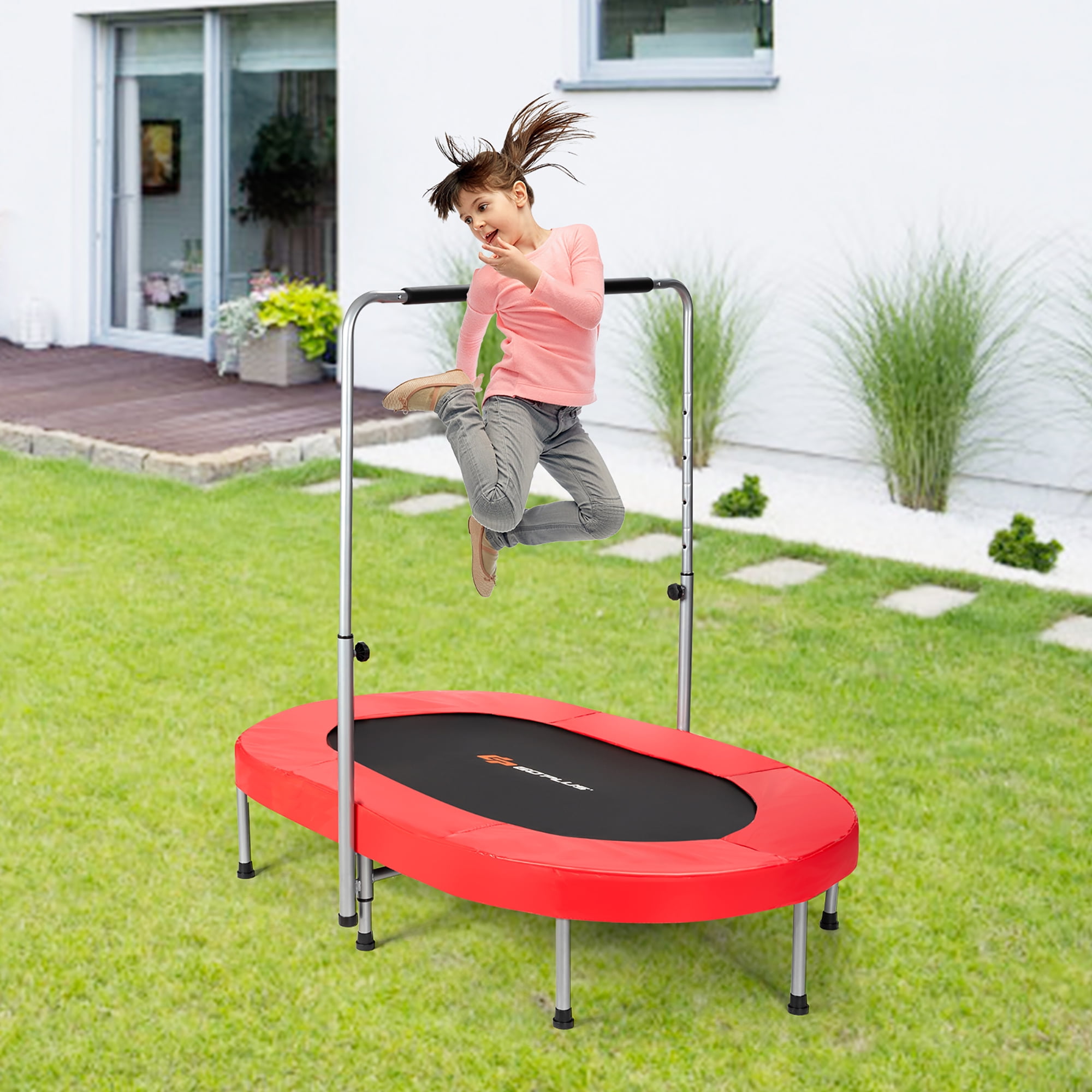 Costway Trampoline Double Mini Kids Fitness Rebounder with Adjustable Handle, Red, 60.00″ x 40.00″ x 50.50″ Activity Center: Ideal for muscle and bone development, enhancing social and parent-child interactions Balance & Coordination: Includes a handle for improved balance, coordination, and heart health Safety Materials: PVC safety mats and non-slip foot pads on a rust-proof steel frame, supporting up to 330 lbs Adjustable Handle: Five height settings (34.5” to 50.5”) with a foam-wrapped grip for various user heights Convenient Storage: Foldable design for easy storage in small spaces