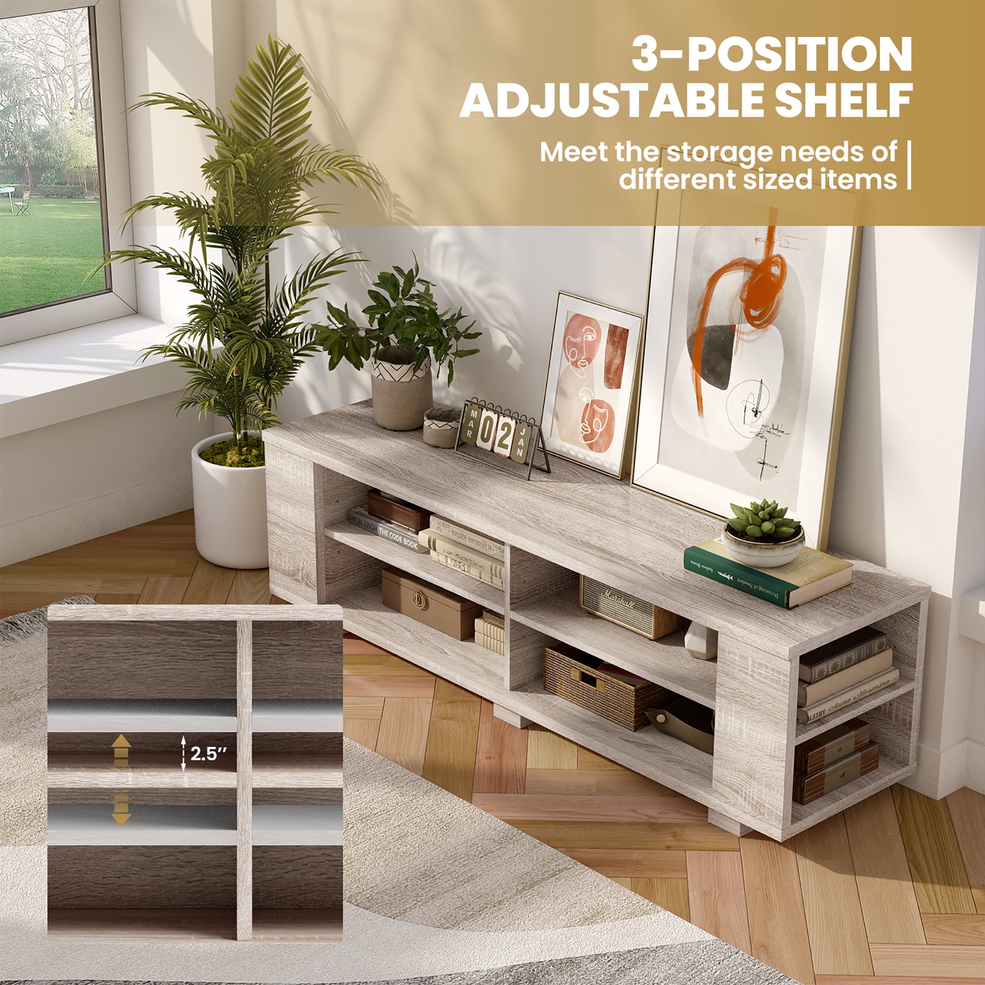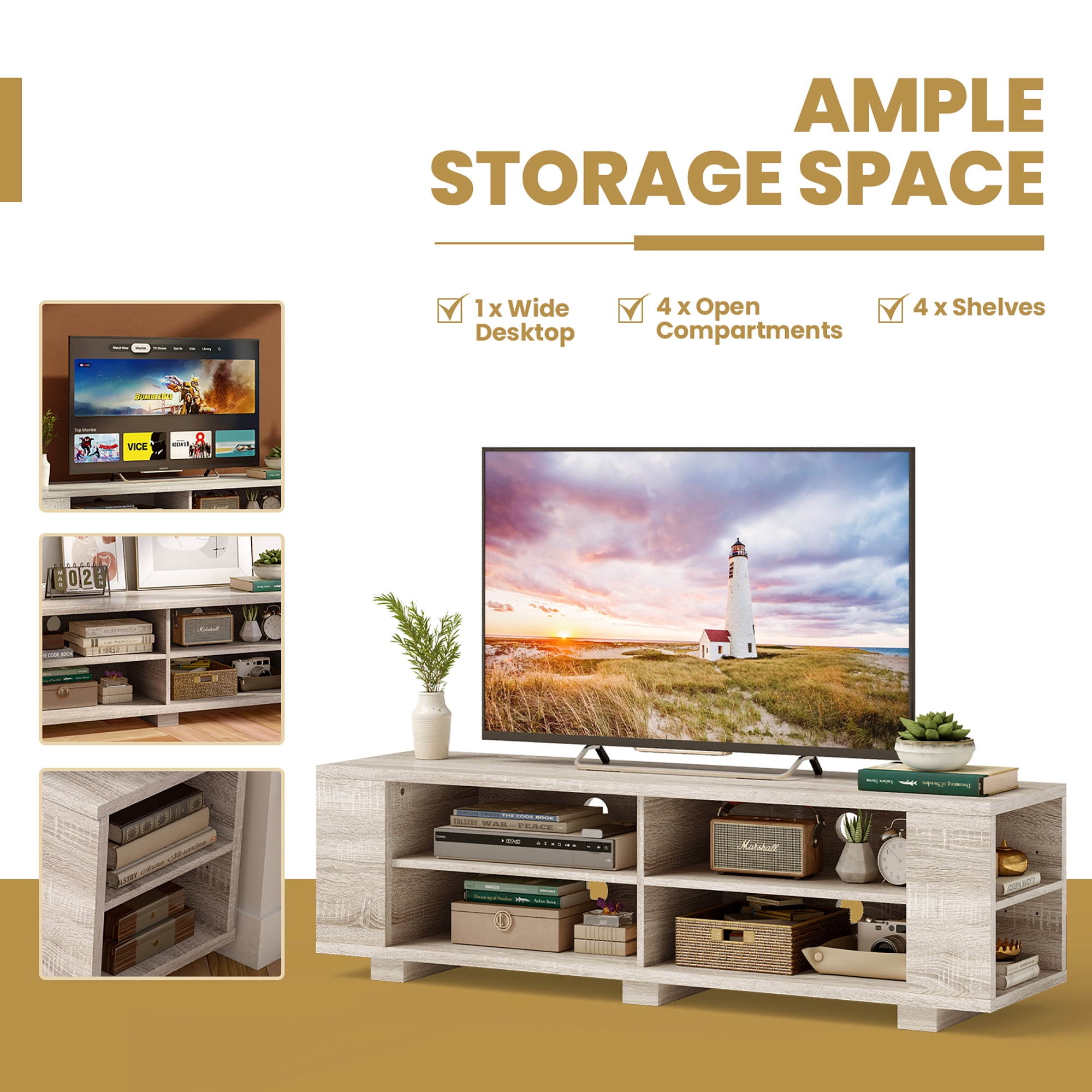 If you need a beautiful and sturdy TV stand, don’t miss out on our new product. This TV stand is made of MDF veneer, which has a firm structure and strong load-bearing capacity. You can put things like TV, vases and photo frames on it. The most important thing is that it has a large capacity of open storage space. Eight cabinets allow you to put a lot of things, which saves you a lot of space. It has four threading holes on the back that allow wires from TV set-top boxes, DVD players, game consoles and stereos to pass through easily and orderly. And it’s easy to clean and assemble, saving you a lot of time. Feature Modern and stylish design, suitable for bedroom, living room and event room Made of P2 MDF veneer, strong structure, wear resistance and durability 59″ long, easily accommodate a 65″ TV Strong load-bearing capacity to hold 350 pounds of weight Three-layer TV cabinet, eight large storage spaces, saving your space Adjustable shelf, easy placement of objects of different heights Four cable management holes maintain a clean space Open space facilitates heat dissipation and ventilation of electrical equipment Easy to assemble Specification Material: MDF Color: Oak Net Weight: 70.5 lbs Overall Dimension: 59”x15.5”x17.5”(LxWxH) Weight Capacity: 350 lbs Package includes: 1 x TV Stand