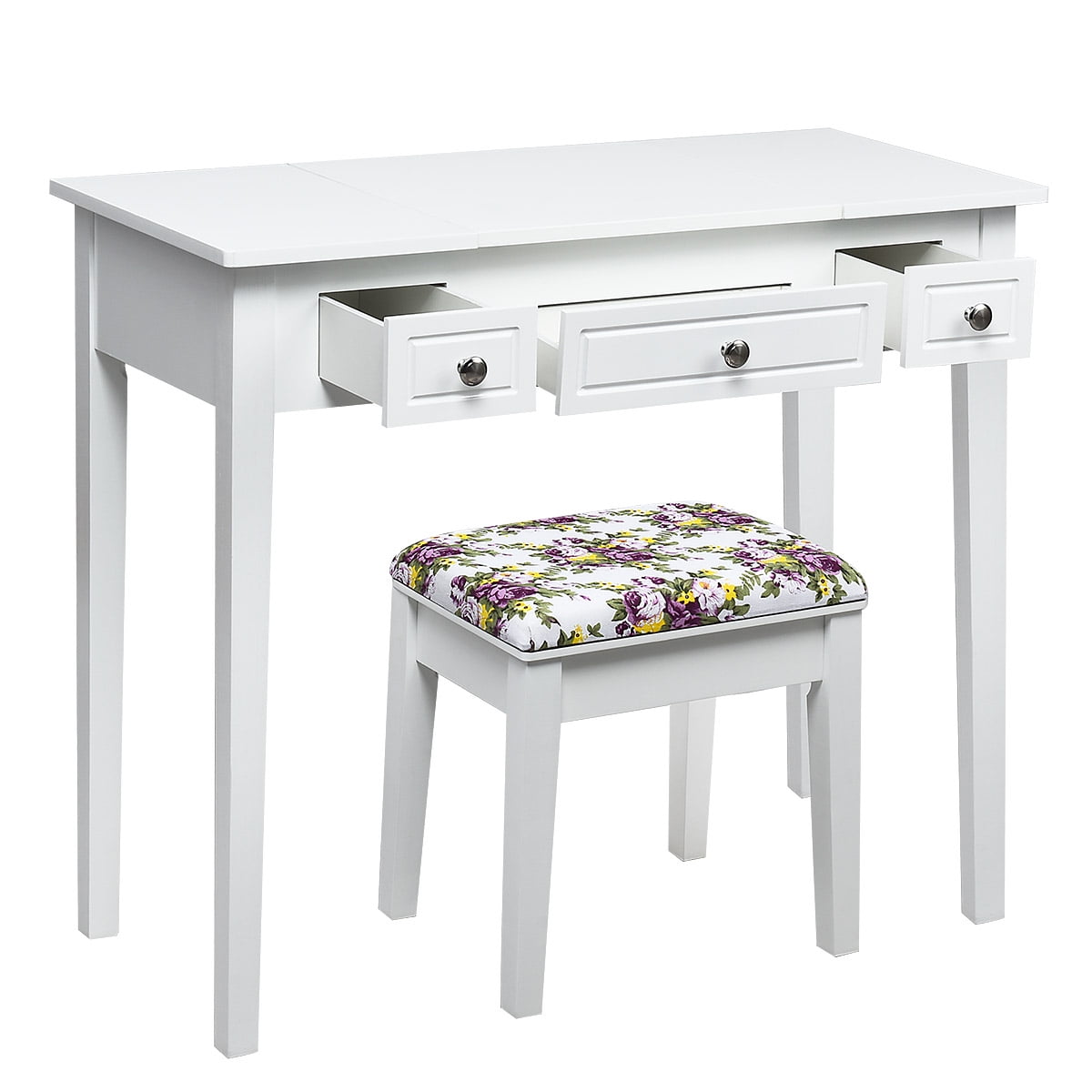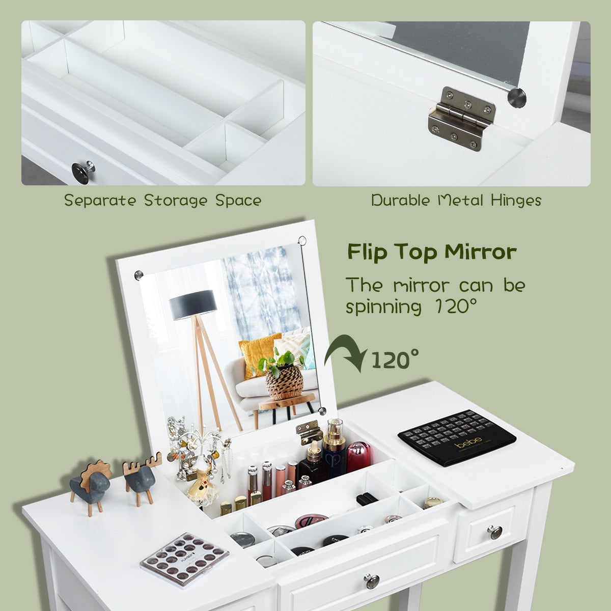 Flip Top Mirror for Double-Use: Features with a 110degrees tilting flip top mirror, this amazing dressing table provides a better view while sitting comfortably, making your makeup convenient and easy. The 2-in-1 design allows it to turn into a writing desk or laptop desk in seconds after the lid is closed.You can switch between the two functions to save space. Large Capacity& Manage Space Effectively: This vanity set has a separate storage box and 3 drawers, which gives you enough space to store your makeup. 7 compartments in the storage box can classify cosmetics, perfumes, jewelry and accessories effectively. The spacious desktop can be used to place large bottles of skin care products or makeup tools for daily use. Smart storage keeps your items organized. High Quality Materials & Solid Construction: This quality vanity table set made of carefully selected densified boards and paulownia is sturdy and sturdy in use. Smooth tabletop is not only waterproof and easy to clean, but it can also hold up to 287 pounds.Premium hardware and 100% solid wood legs ensure the solidity of the overall frame structure, providing sufficient support and stability. An Elegant and Comfortable Stool Provided: Made of breathable fabric and high-density sponge that doesn’t collapse easily, this cushioned stool provides a more comfortable makeup environment. The ergonomic height of the stool matches the table and mirror perfectly, so that you can sit for a long time without feeling tired. The stool with flower-patterned adds elegance and glamour, perfect for use as a piano bench , shoe bench or footrest. Simple Design & Easy Assembly: The appearance of this dressing table set is simple and elegant, delicate round handles add a sense of fashion and classic, which suits any home decoration and perfect for bedroom, bathroom, living room. The simple structure and detailed instructions provided make it very easy to assemble. There is no doubt that this is the best gift for your loved one or child.