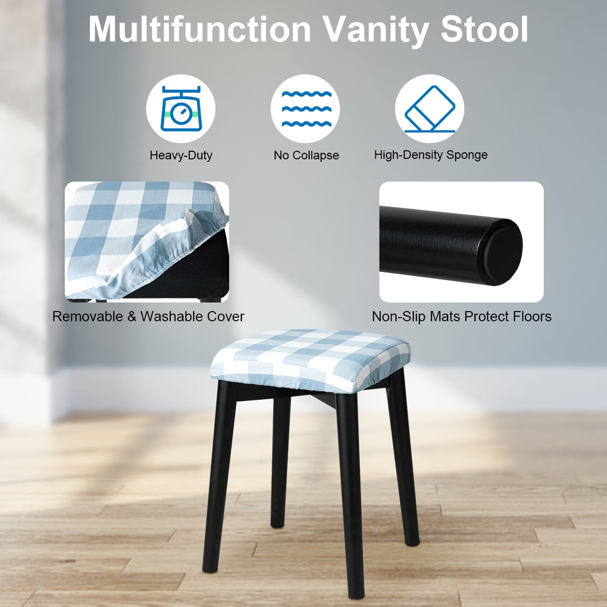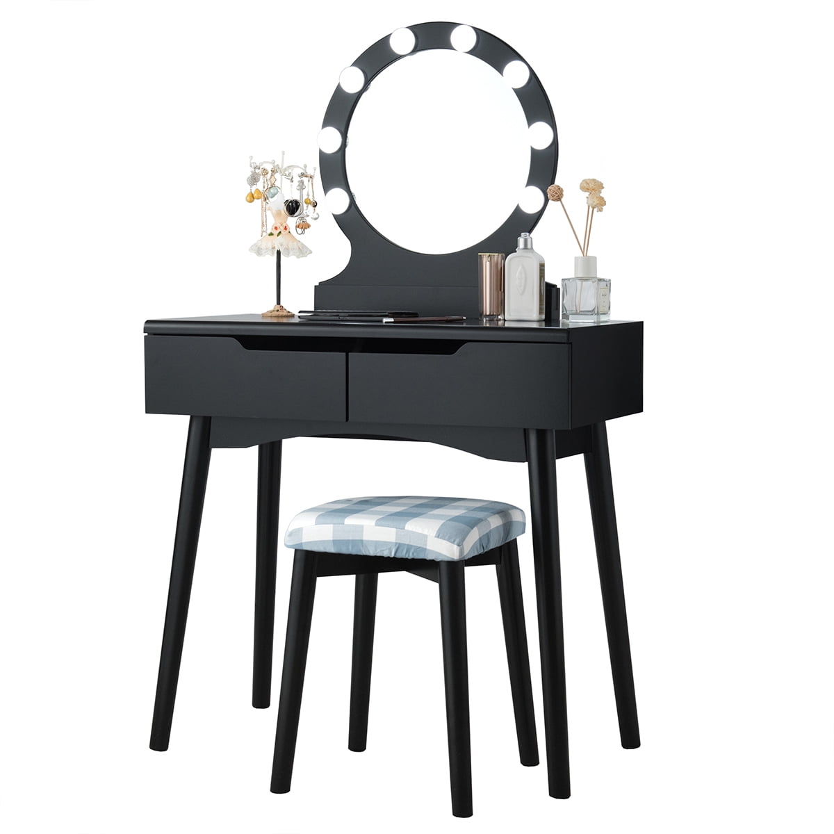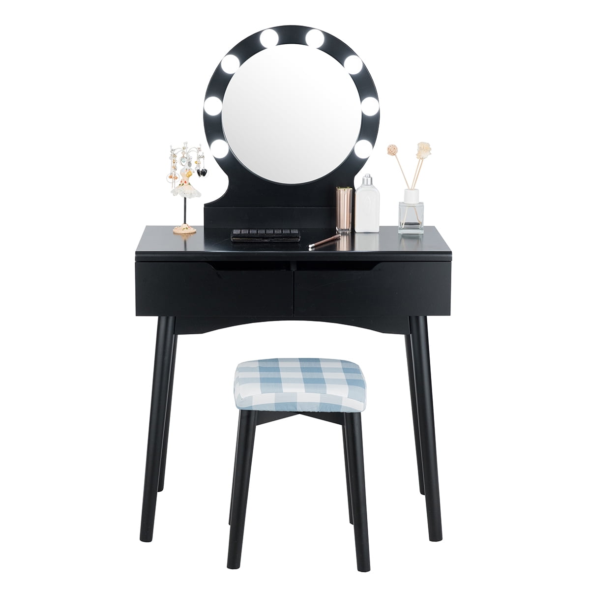 Get up in the morning and start the day with our perfect makeup.If you’re looking for a unique dresser, don’t miss our amazing vanity table with lights. This is our elegant and simple dressing table with round mirrors and cushioned stools. Made of high quality P2 MDF and solid wood,sturdy construction with 100% solid wood legs to ensure the enough support, resulting in a long use time. Soft cushioned stool brings great comfort and relieves fatigue during long periods of make up.The grid cushioned cover can be removed for easy cleaning. We provide 11 LED bright bulbs, 3 of which are spare.The power plug is UL certified for safe use. The large and high-definition mirror with 8 bulbs gives you a clear, bright makeup experience in low-light environments. Of course,the upper part of the dresser can be removed and used as a writing table. The wide desktop and 2 large drawers with smooth slide rails provide enough storage space for your daily needs. Simple design can match the decoration style of any room, ideal to be placed in small spaces. Our products are competitive and won’t let you down. Feature Comes with 11 LED light bulbs, 3 of which are replaced for you. Brightness can be adjusted to adapt different lighting environment. The power plug is UL certified. Concise and elegant design can be combined with different decoration of home. The size is ideal for small spaces. Anti -Topping fitting ensures stability and safety. Slide rails for smooth and easy operation. Soft sponge cushion makes you feel comfortable in the long time of sitting. Grid cushioned cover can be removed for easy cleaning. Separate matching stool can be used as shoe stool, footstool or piano stool. The smooth surface is waterproof and easy to clean. Specification Color: Black Material: P2 MDF + Pine+ Rubber wood Net weight:41 lbs Vanity table size: 31.5”(L)x16”(W)x52”(H) Weight capacity of table: 80lbs Weight capacity of stool: 220lbs Stool size: 13”(L)x13”(W)x18”(H) Drawer size: 16”(L)x12”(W)x5.5”(H) Drawer interior size: 13.5”(L)x11.5”(W)x3.5”(H) Mirror size: 14.5”(L)x15”(W) Table Top to the Ground:30.5 inches Package includes: 1x Vanity table set with lights 1x Instructions