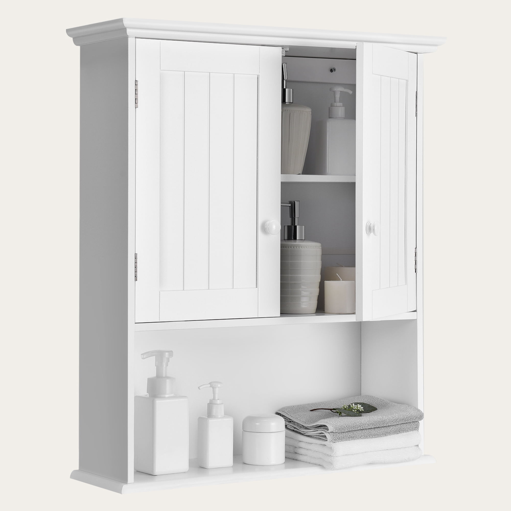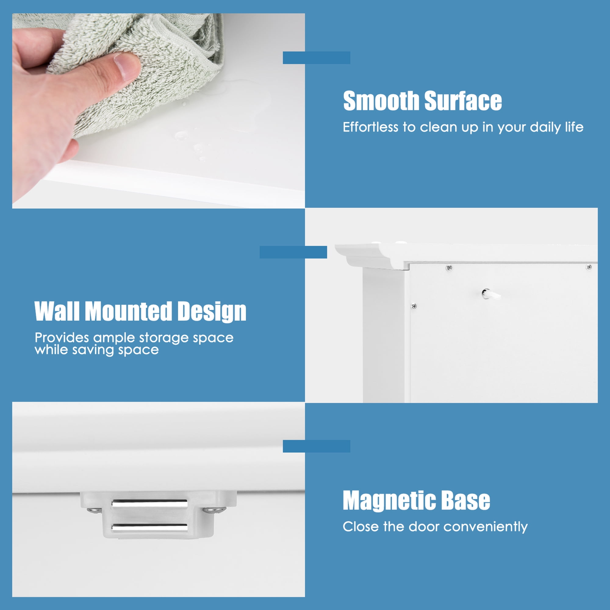 Costway Wall Mounted Bathroom Medicine Cabinet Organizer with Adjustable Shelf The inner shelf height can be adjusted to fit the needs of different goods Wallmounted design maximizes space efficiency Doubledoor cabinets store various items while keeping out dust The open shelf provides easy access to frequently used items Magnetic base on the door ensures a tight closure after use