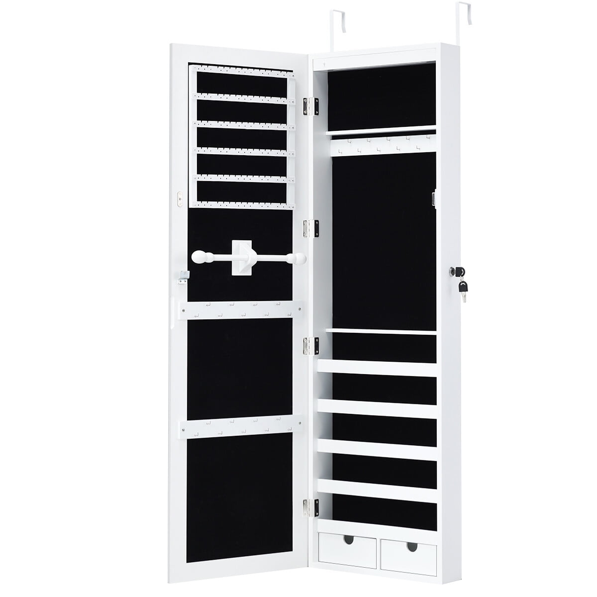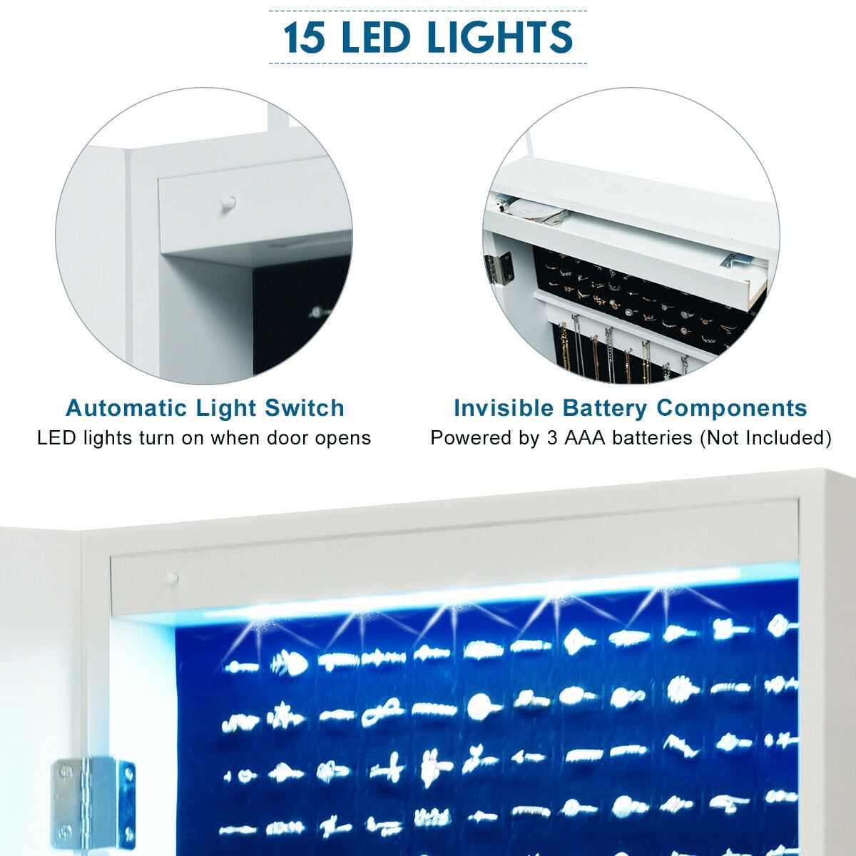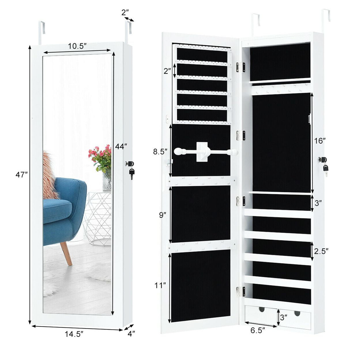 “The jewelry cabinet with full size mirror and lights is an attractive artwork. It is specially designed for all your valuables, helps your jewelry in an organized manner and prevents them from getting tangled, and keeps your jewelry safe and away from kids. The led lights add luxury and glory for the cabinet. Full size mirror is convenient for you to try your clothes or jewelry on. In addition, its chic and stylish design fits with your bedroom decor. With it, your life will be convenient and self-consistent. Worth having! Feature made of premium mdf board, durable and stable painting coated, moisture and corrosion resistant oxidation resisting velvet liner prevents your jewelries from being scuffed and scratched 6 lined shelves designed for holding earrings , 5 rows of ring slots (60 ring slots), 29 hooks, 5 storage racks, 2 storage drawers, 1 scarf rod with full size mirror is convenient for you to try your clothes or jewelry on features beautiful led lights, make your jewelry more dazzling helps your jewelry in an organized manner and prevents them from getting tangled door mounted for saving more space fits with you bedroom decor easy to assemble & easy to clean specification material: mdf board + glass mirror color: white net weight: about 21.5lbs overall dimension: 14.5”l x 3.8”w x 47”h mirror size: 43.5”l x 10.5”w quantity of led lights: 15 (3aaa batteries not included) package include: 1 x jewelry cabinet