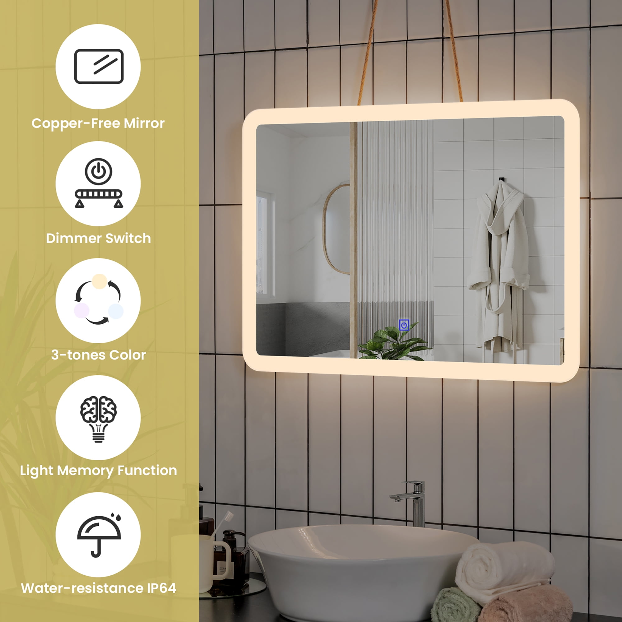 Copper-free HD Mirror: Using the copper-free material, this mirror has upgraded quality and durability compared with the common silver-coated mirrors. Designed with 4 layers, our LED bathroom mirror enables a high imaging clarity with no worry of scratch, burst, or explosion. Dimmable & 3 Color Settings: Our LED bathroom mirror comes up with 3 lights temperatures—3000K warm light, 4500K neutral light, and 6500K cold white. Long press the touch switch to adjust the light intensities from 10% to 100%. And the memory function will remember the status of your last lighting settings. High-Performance Bathroom Mirror: The LED light has more than 8000 hours of lifespan and is visually comfortable with no flicker. IP64 waterproof protection rating ensures safe lighting in humid bathroom environments. Besides, this mirror is equipped with a long power line. Frameless Vanity Mirror: The modern frameless design allows the LED bathroom mirror to blend into any room decoration, which also adds a sophisticated element with actual functionality in your home. This modern wall mirror is suitable to hang horizontally above your bathroom sink, cabinet to use for daily make-up and shaving. Easy to Install with Mounting Kits: Coming with 4 wall mounting kits, it only takes a couple of minutes to mount the LED bathroom mirror up firmly. And the illustrated instructions will walk you through the installation process. The mirror dimension is 28” x 20” (L x W). Please note that it is only allowed to install horizontally.