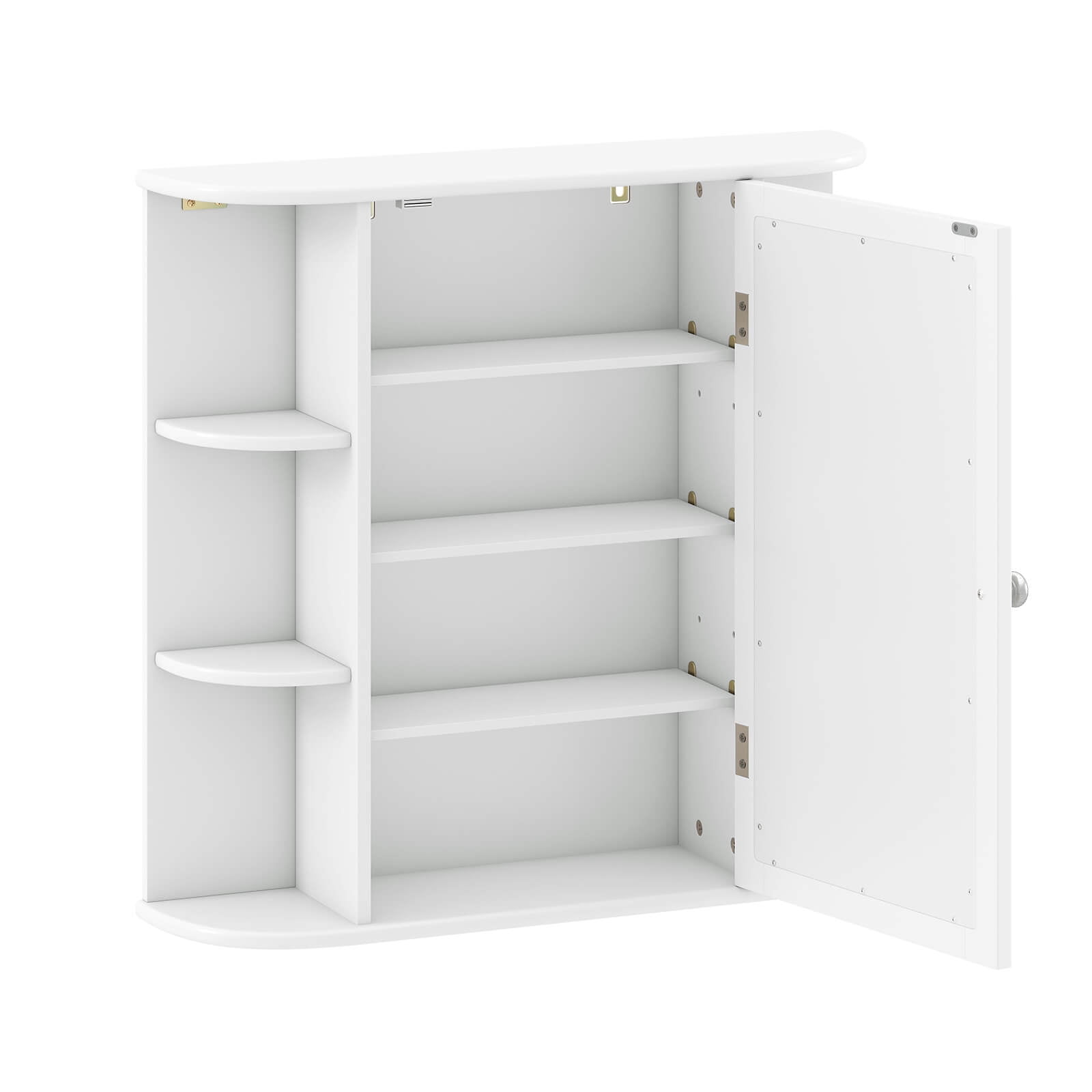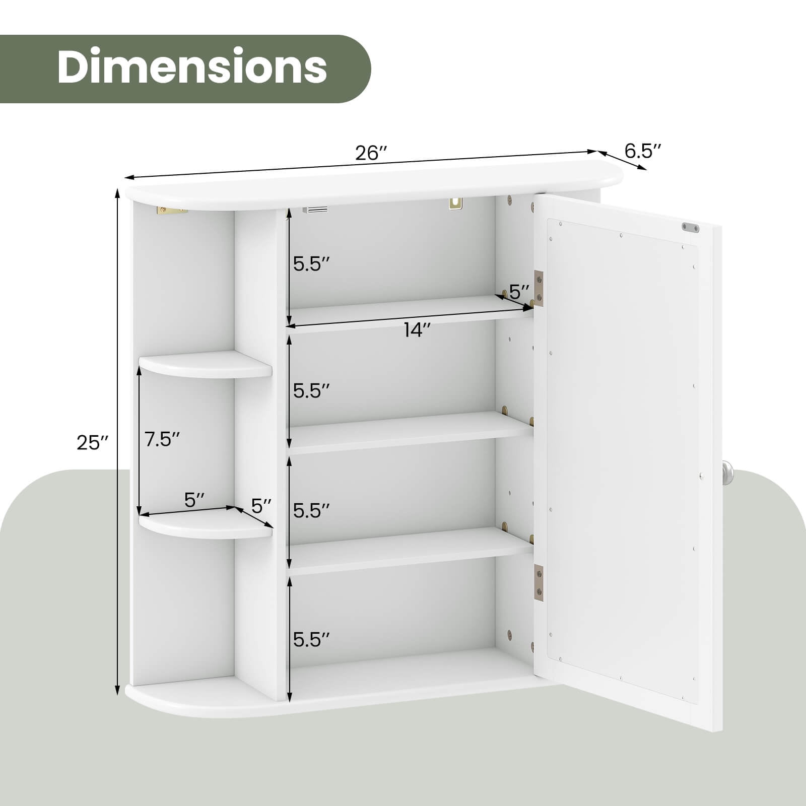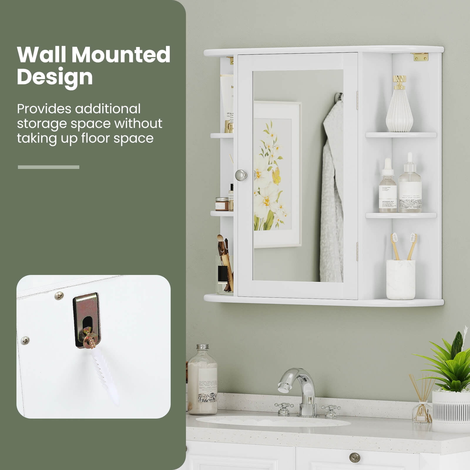 Costway, White, Medium Density Fiberboard, Multipurpose Mount Wall Surface Cabinet Mirror Glass, 26.00 x 6.50 x 23.50 Inches Space-Saving Wall Mounted Design: This bathroom medicine cabinet provides additional storage space without occupying any floor area, making it ideal for small bathrooms Overall dimensions: 26″ x 65″ x 235″ (L x W x H) Open & Enclosed Storage Space: Built with 6 fan-shaped shelves on both sides and a 4-tier storage cabinet, this cabinet offers ample storage for various items, keeping your space organized Open shelves are perfect for frequently used items like toothpaste and toothbrushes 3-Tier Adjustable Shelf: The cabinet features 3 adjustable shelves that can be set at 3 different heights, with a distance of 25″ between each height, allowing you to store items of various sizes, such as skincare products, towels, and toilet paper Combines Beauty & Functionality: This wall-mounted storage cabinet features an HD mirror, enhancing convenience in your daily routine Its simple and elegant design complements various decor styles, making it suitable for bathrooms, laundry rooms, and entryways Premium Material & Easy Installation: Constructed with P2 MDF, this bathroom wall cabinet is sturdy and durable for long-term use The smooth surface is easy to clean, and the cabinet comes with detailed instructions and required accessories for straightforward installation