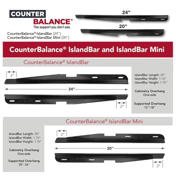 - Mounts on cabinetry to support extended countertop overhangs for “island” and “peninsula” style applications