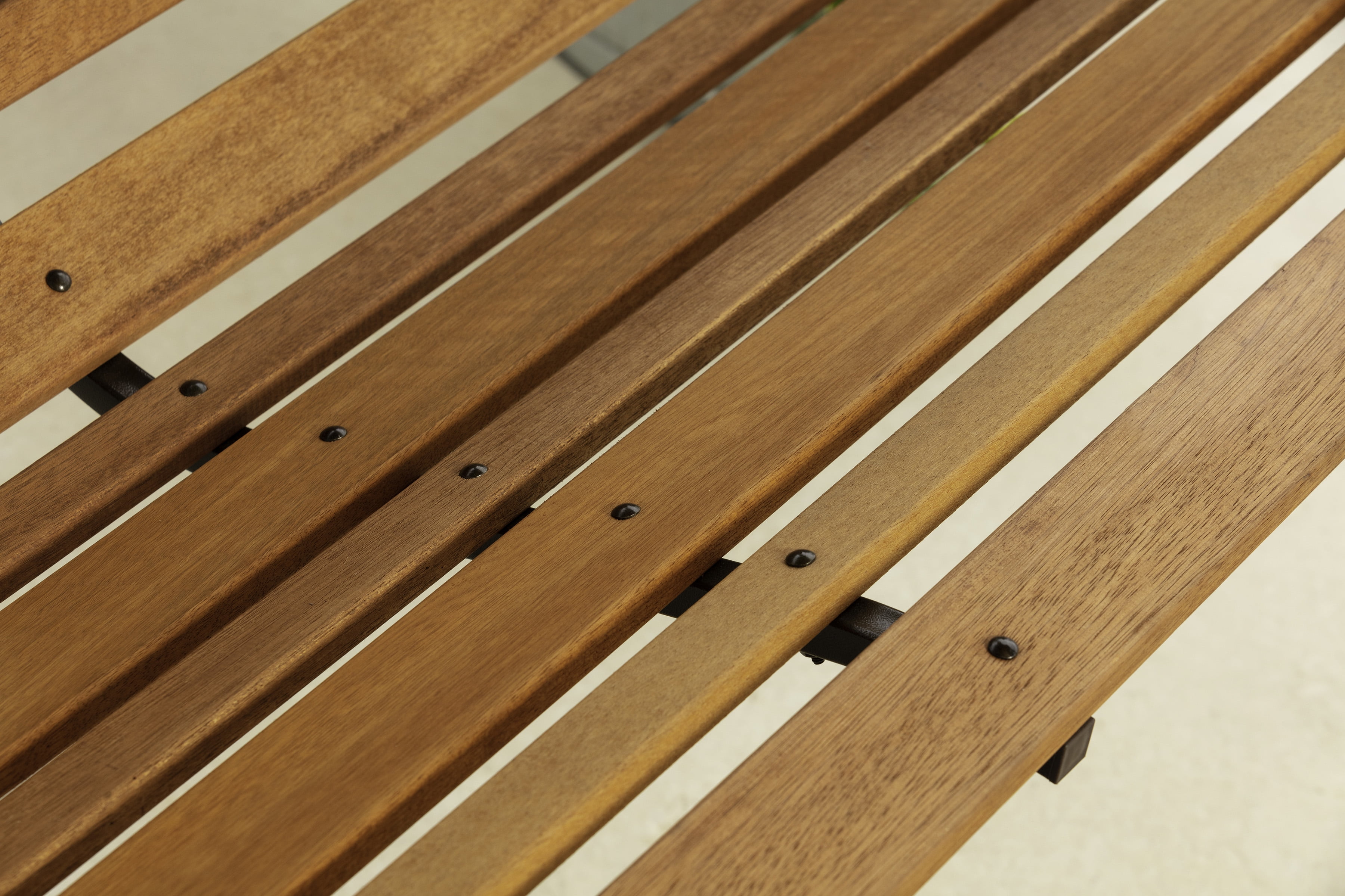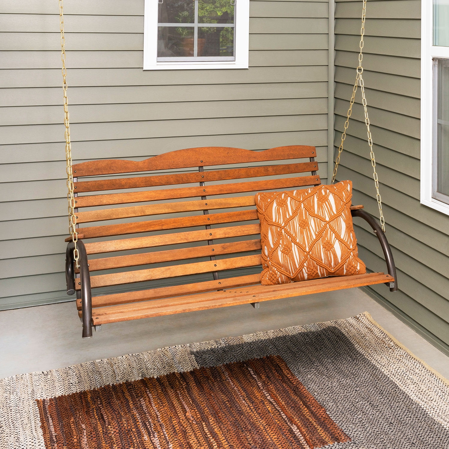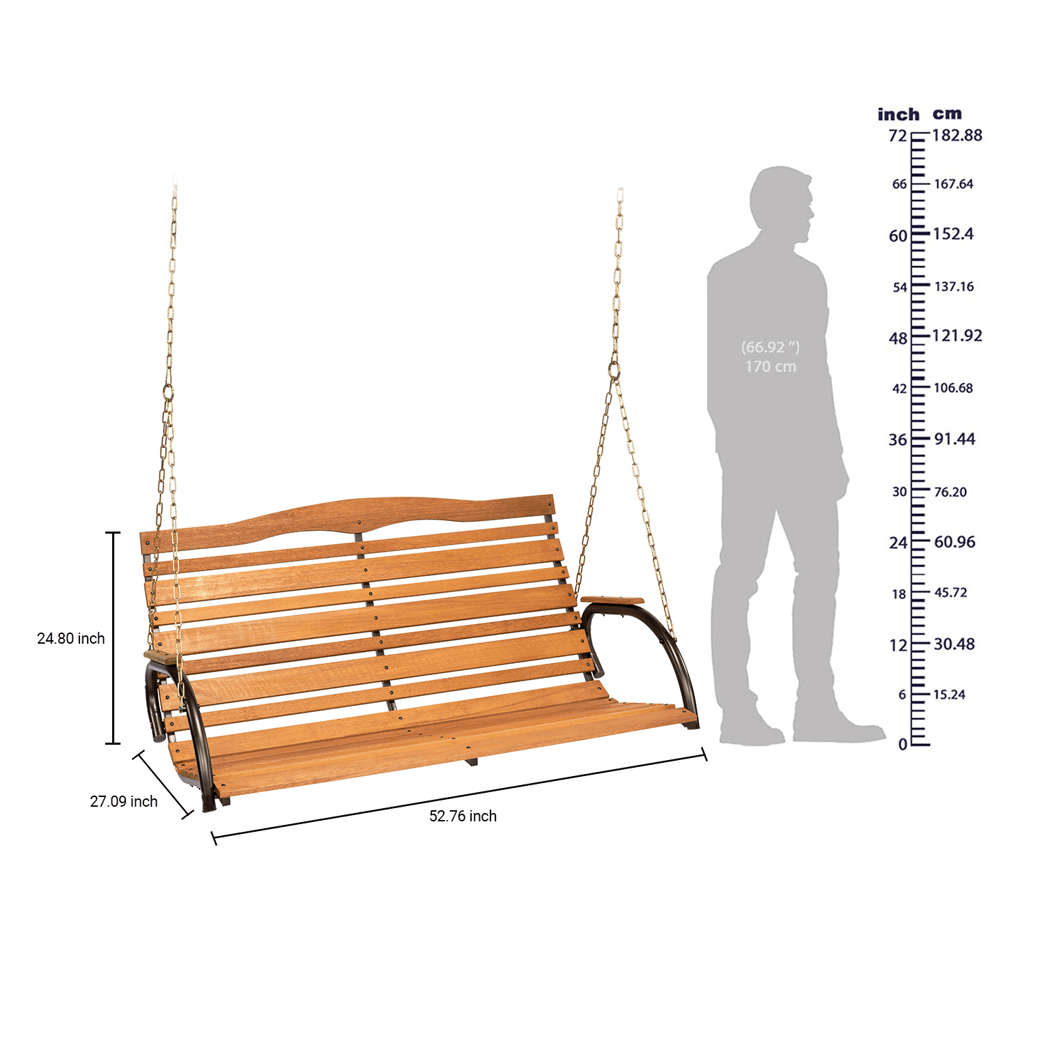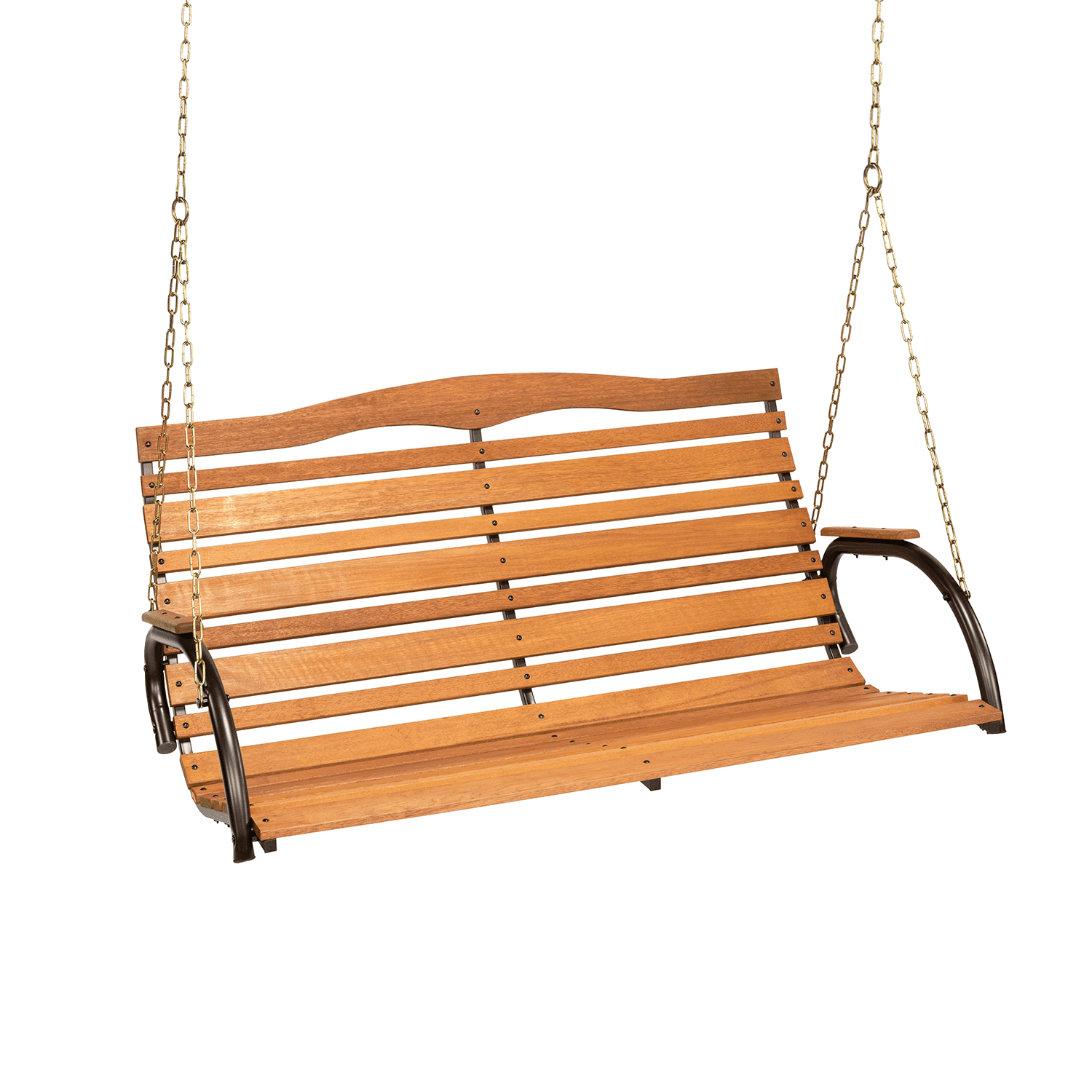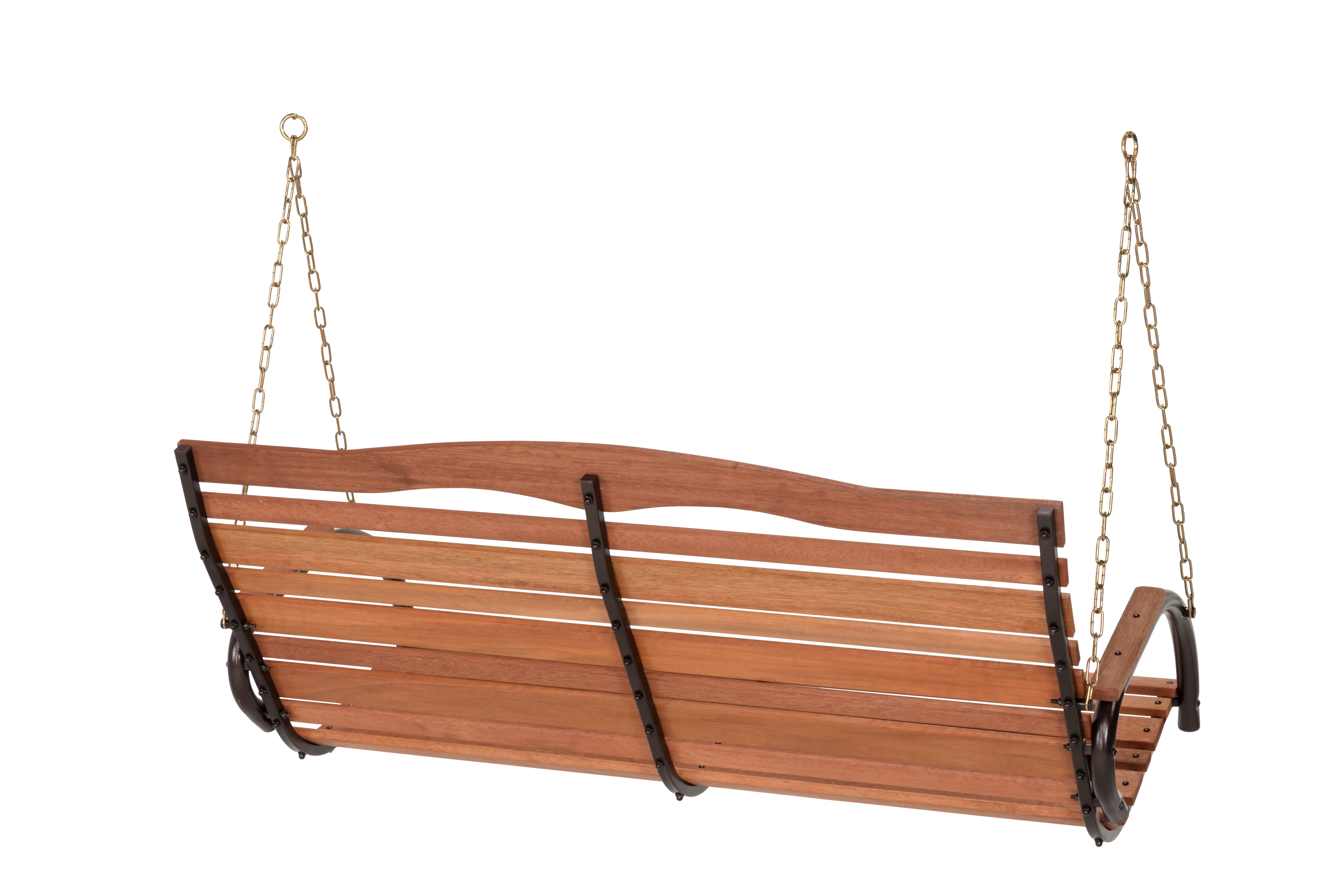 High Backrest: Provides comfort for a relaxing experience. Natural Beauty: A warm stain finish on the Indonesian Mahogany stats enhances the beautiful wood grain. Design: Fifteen 48″ slats on a gently curved steel frame for comfort and strength Outdoor Versatility: Perfect for patios, porches, or other outdoor spaces. Weather Resistant: Indonesian mahogany slats and a powdercoated steel frame withstand outdoor elements for long-term durability. Sturdy Construction: Designed to support 2 adults up to 500 pounds. Flat-Pack Shipping: Includes 7′ chains, hardware to hang the swing and simple assembly instructions for convenient setup. Enhanced Packaging: Secure packaging ensures the product arrives safely without damage. Low Maintenance: Smooth finish is easy to clean with a damp cloth. Customer Support: Customer service 8am – 8pm M-F, English, Spanish and French, 3 year warranty.