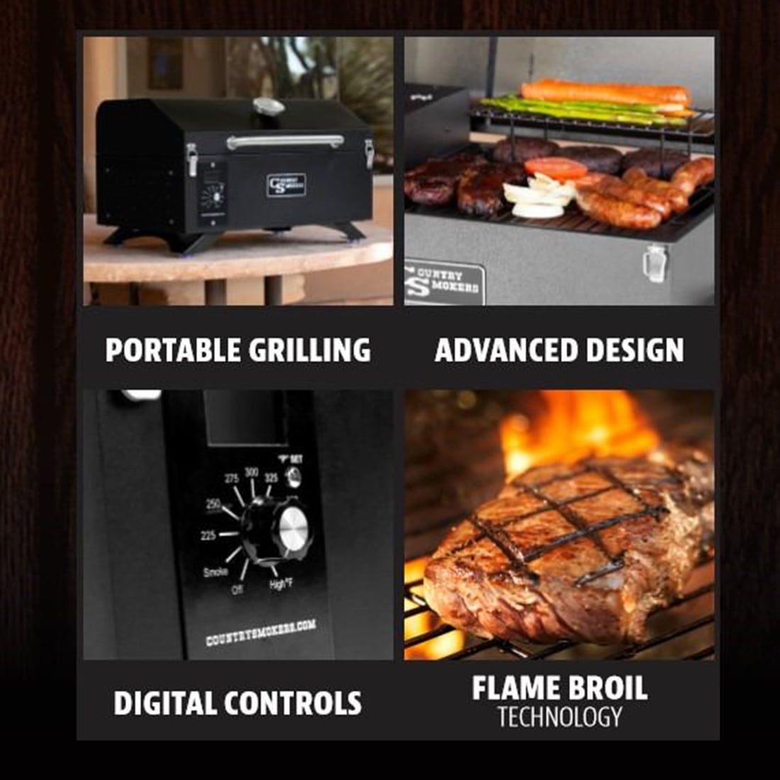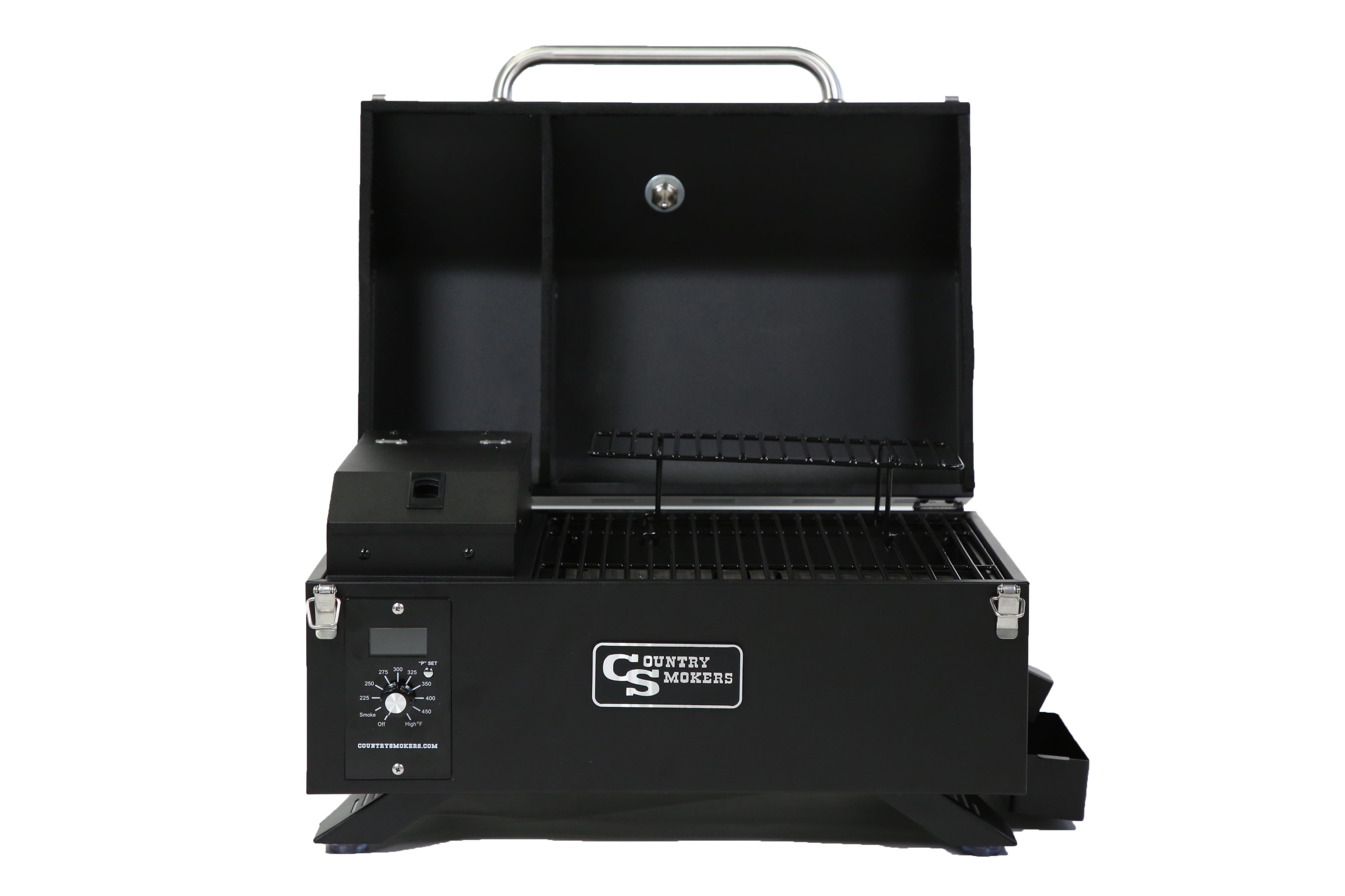 The Traveler – Portable Wood Pellet Grill Country Smokers Fuel source: Wood pellets Wood pellet grill smoker Black sand exterior Control type: Dial-in digital Hopper capacity: 3.5lbs Total cooking surface: 256 square inches Main surface: 191.4 square inches Removable upper rack: 64.6 square inches
