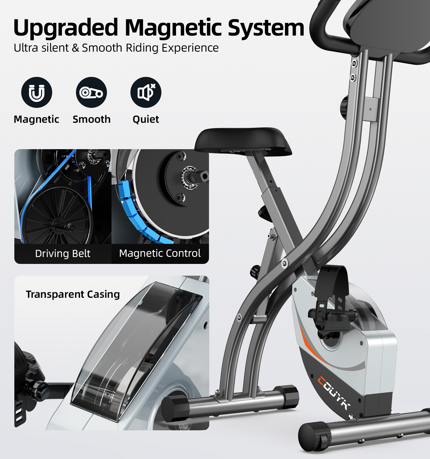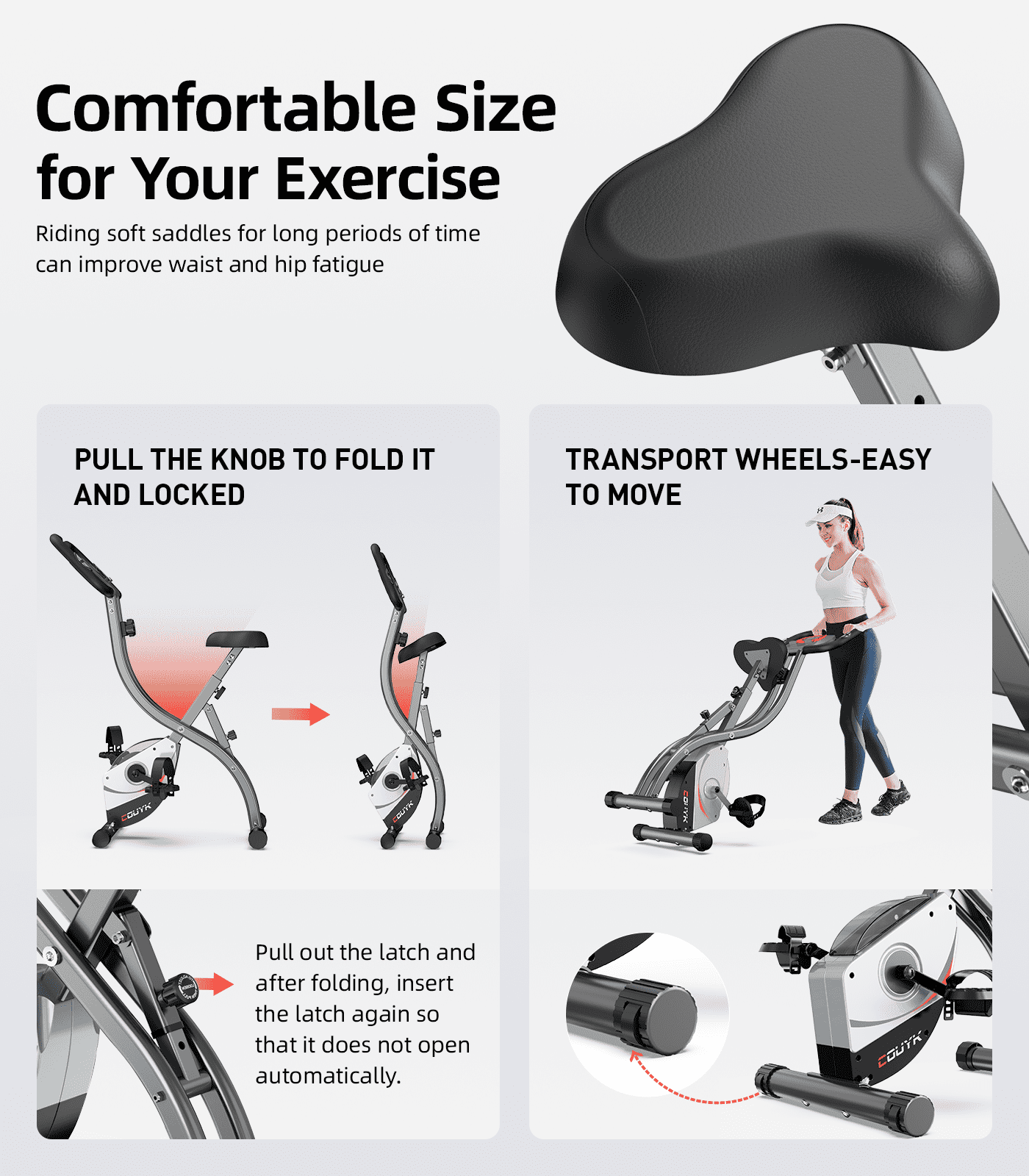 CouYK Foldable Exercise Bike Indoor Cycling Bike Magnetic Stationary Bike With our focused R&D team and complete product line, we are proud to provide high-quality and affordable products to enable everyone to lead a healthier life. Product Name :Folding Exercise Bike Package Weight : 36 lbs Magnetic Resistance:8-level Folded Dimensions:15”W x 49.6”H Assembled Dimensions: 33.7”L x 17.7” W x 43.3” H