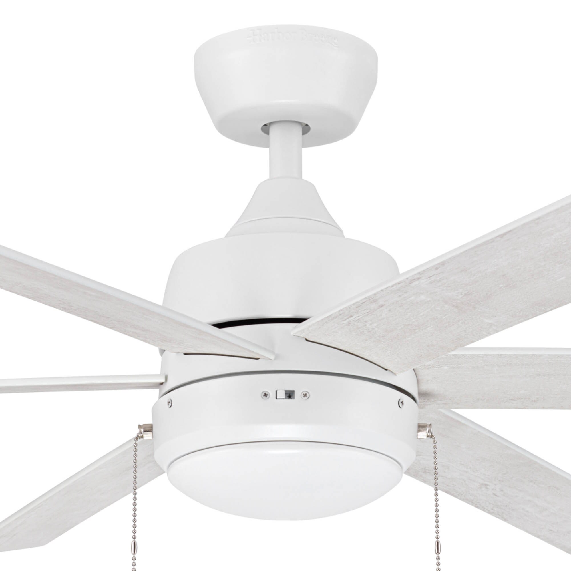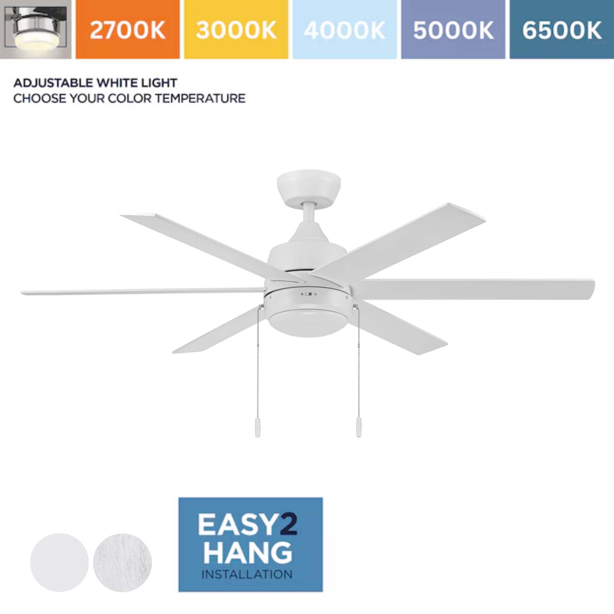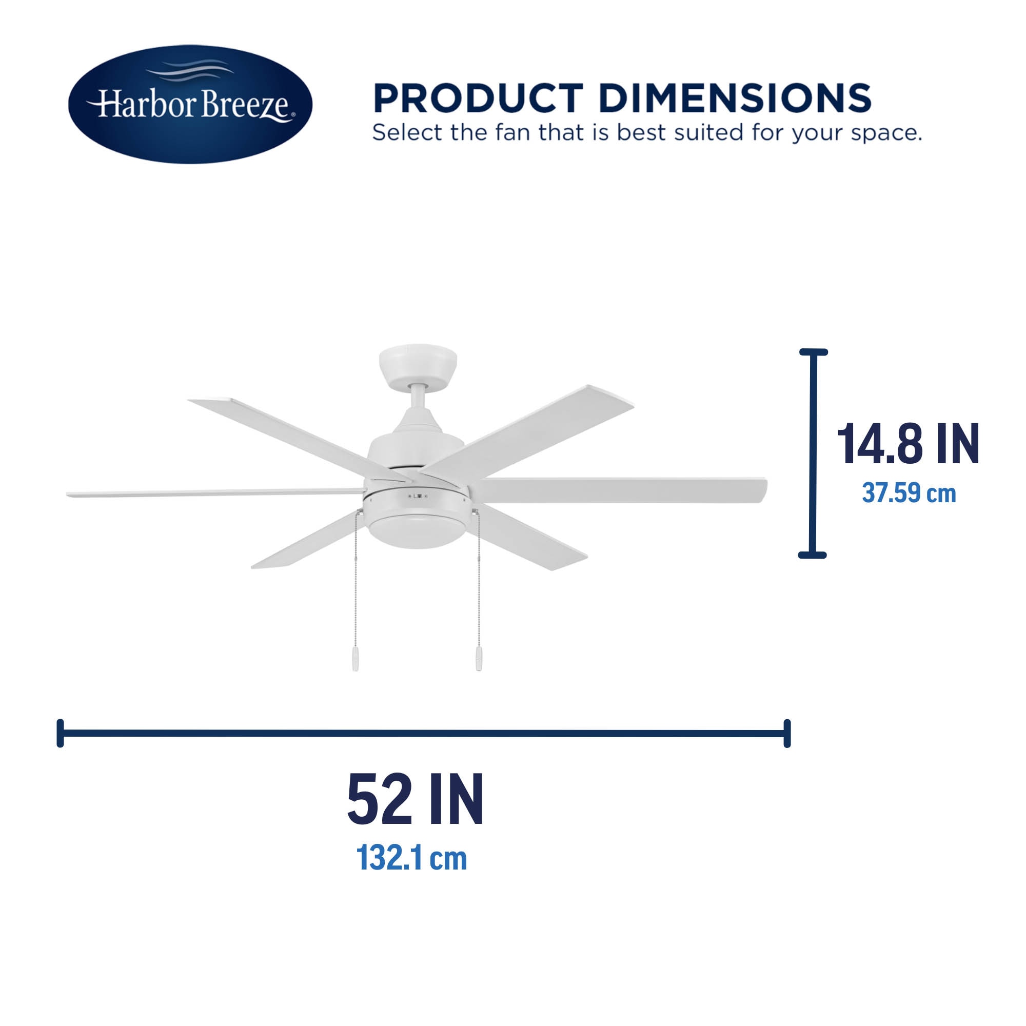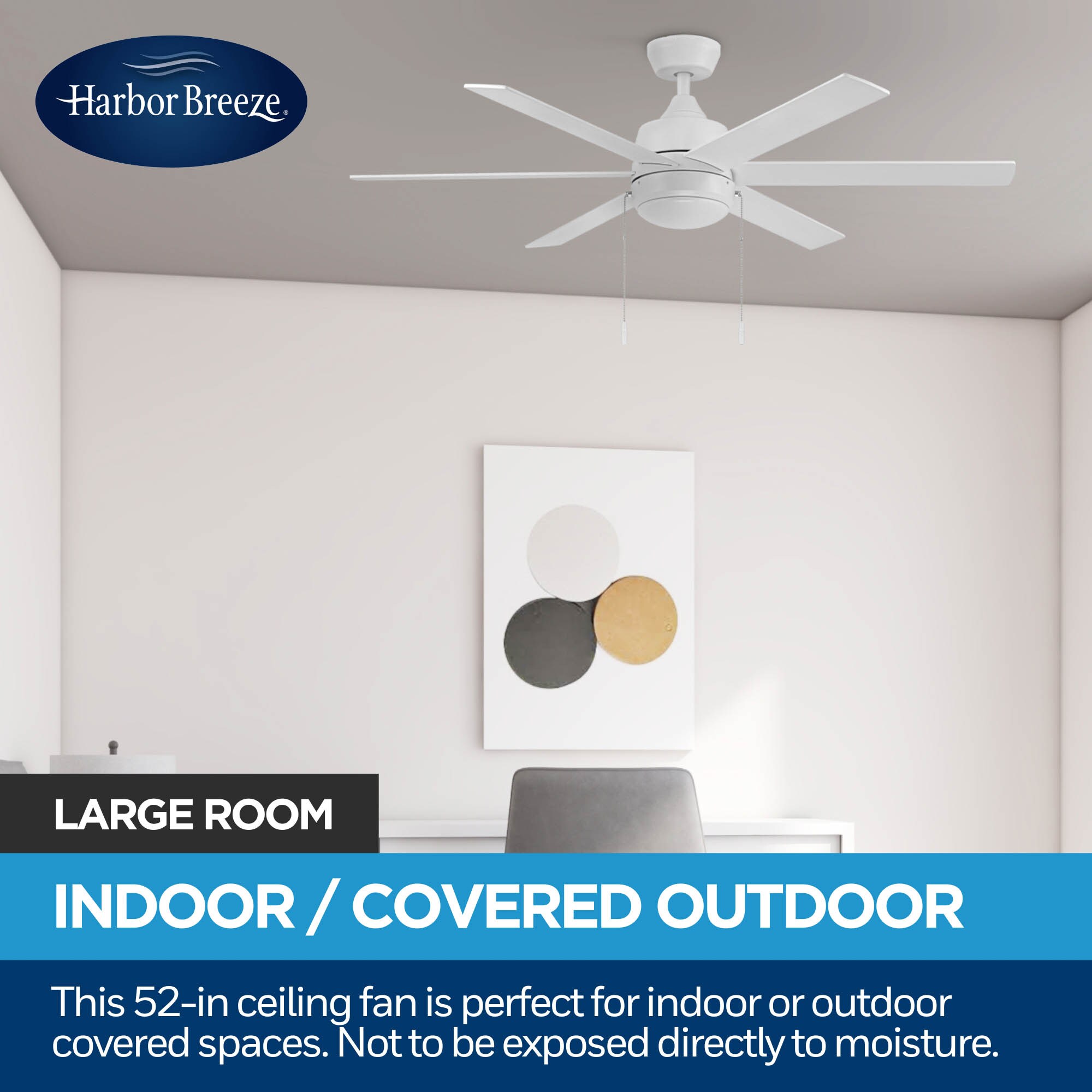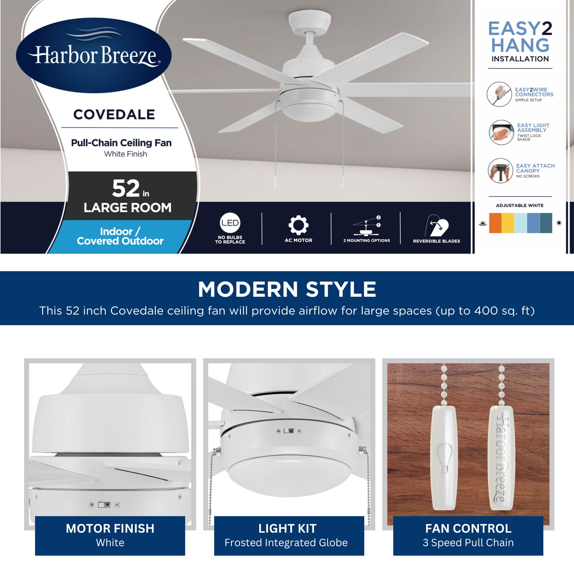 The Harbor Breeze Covedale is a 52 inch indoor/outdoor ceiling fan with lights, perfect for your medium to large sized modern space(s). This white ceiling fan features Easy2Hang installation, an integrated LED light kit and 6 reversible blades. With its three speed, reversible motor, this pull chain-controlled fan will provide comforting air circulation year-round. Harbor Breeze ceiling fans provide style, function, and illumination to help make your house a home.