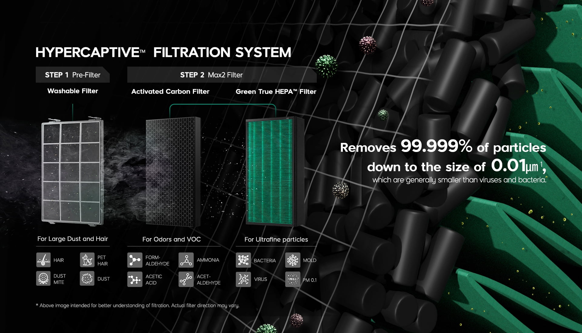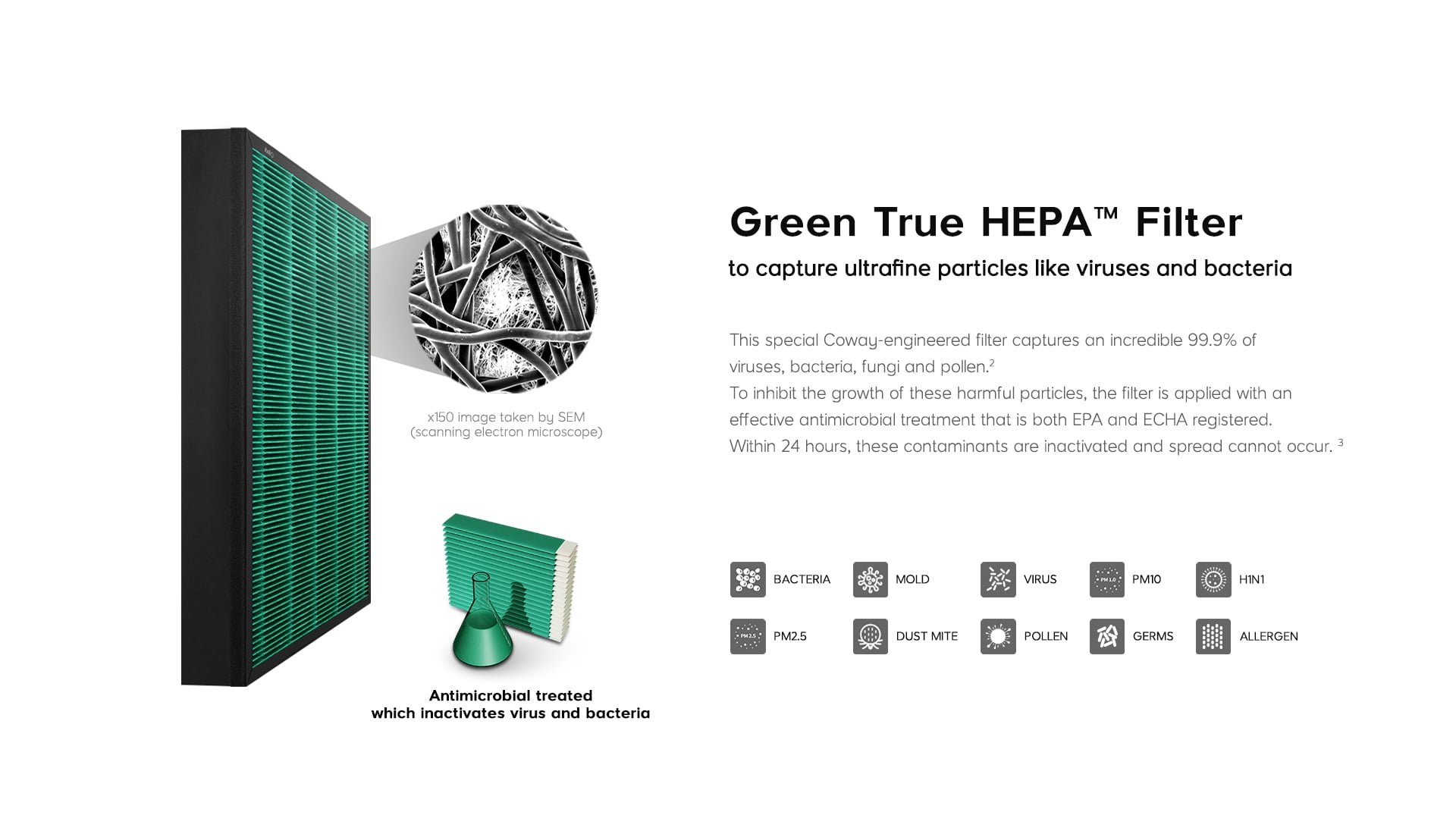 Green true HEPA filter Activated carbon Deodorization filter Room coverage: up to 1,560 sq. Ft 12-Months average life-time Item Weight 1.5 pounds Shipping Weight 3.7 pounds Product Dimensions 10.9 x 1.8 x 14.2 inches Item Package Quantity 2 Green True HEPA removes up to 99.97% of allergens, molds, pollen, fungi, and fine dust. Activated Carbon removes up to 99% of VOCs, gases, and odor.