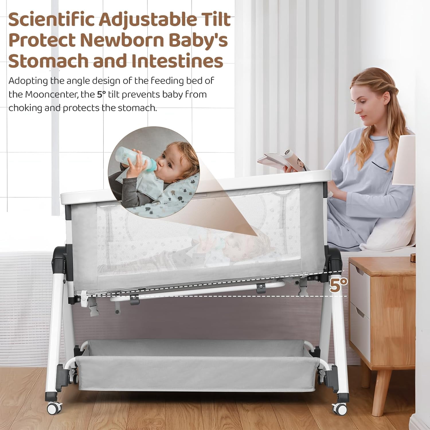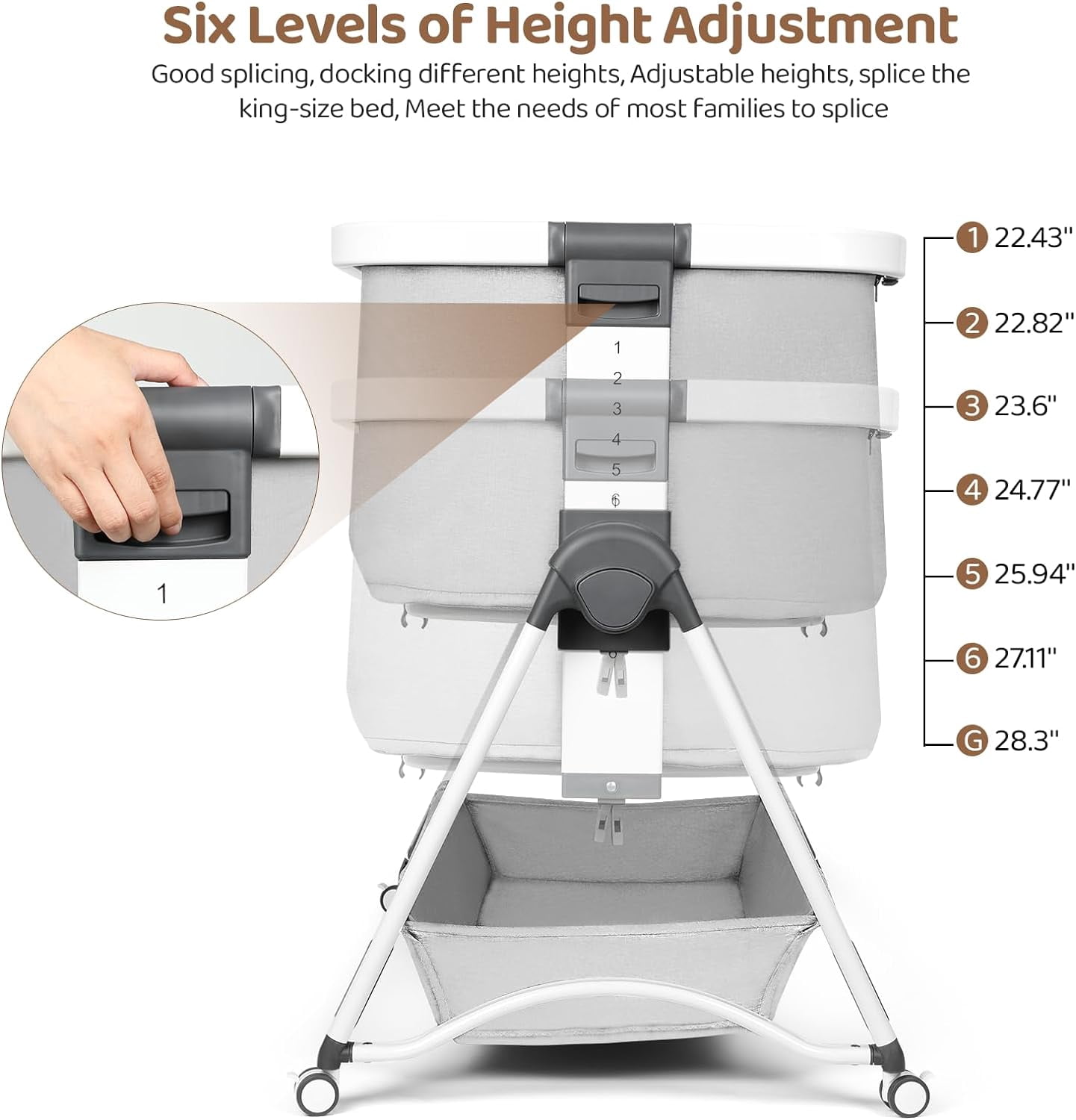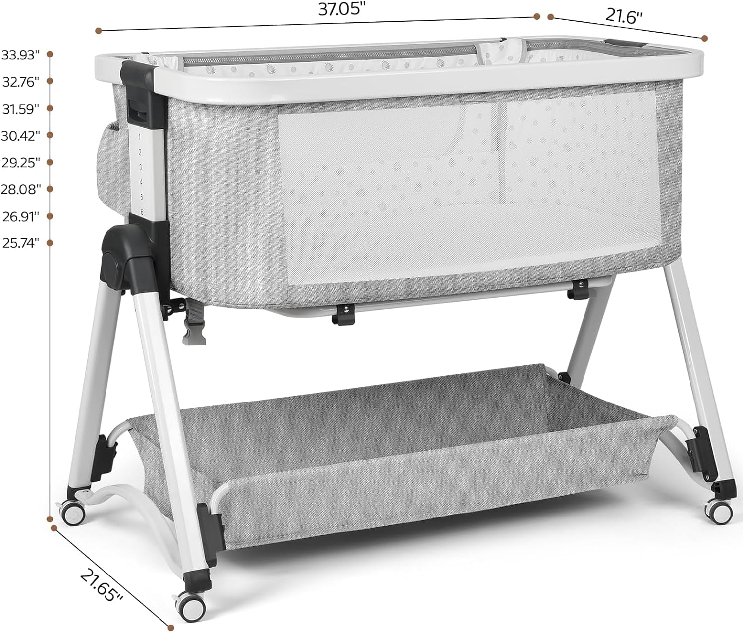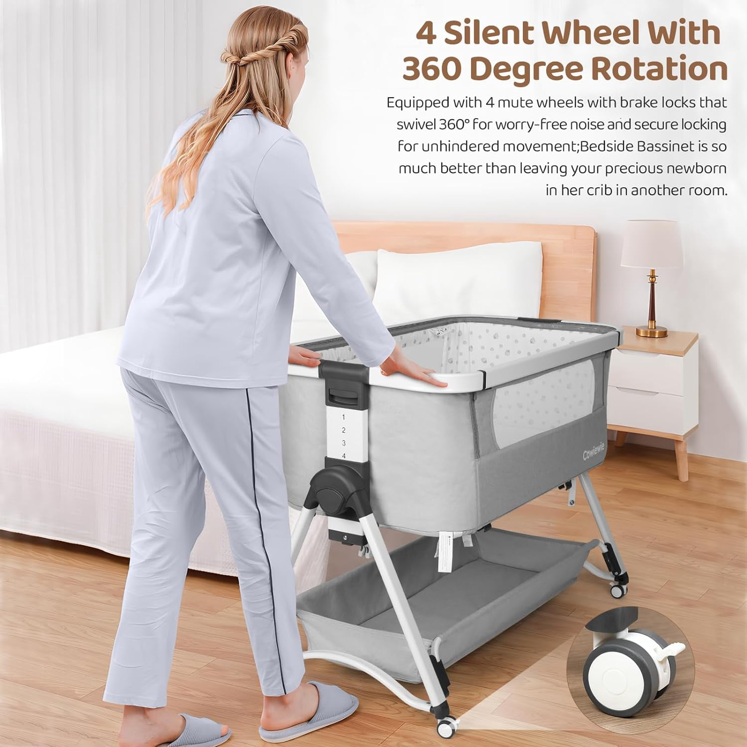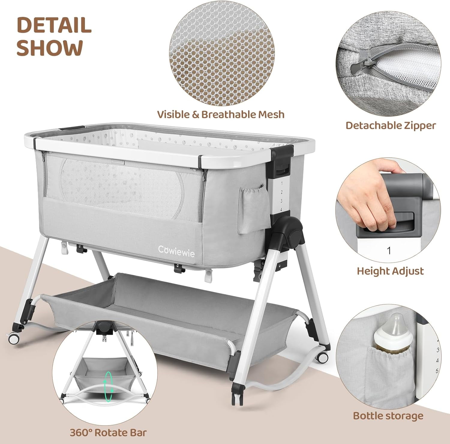 Cowiewie 2-in-1 Swingable Bassinet, Bedside Sleeper, Light Gray with Mattress, Breathable Net Multiple function as a beside crib, travel cot, and swingable bassinet Soft, skin-friendly fabric with breathable mesh design for easy baby care Safe inclined angle of 3-8° meeting CPSC safety standards Firm, flat sleeping surface designed for safety and comfort Adjustable height with 6 levels for easier breastfeeding Removable bassinet with zipper to keep baby safe from pets Converts to a baby cradle for soothing your baby to sleep Ultra-strong aluminum frame with reinforced support to prevent tipping Includes a storage basket for easy access to baby essentials Suitable for newborns to toddlers with a sturdy frame and stable wheels Handy carry bag included for convenient travel and outings Color: Light Gray; Gender: Unisex
