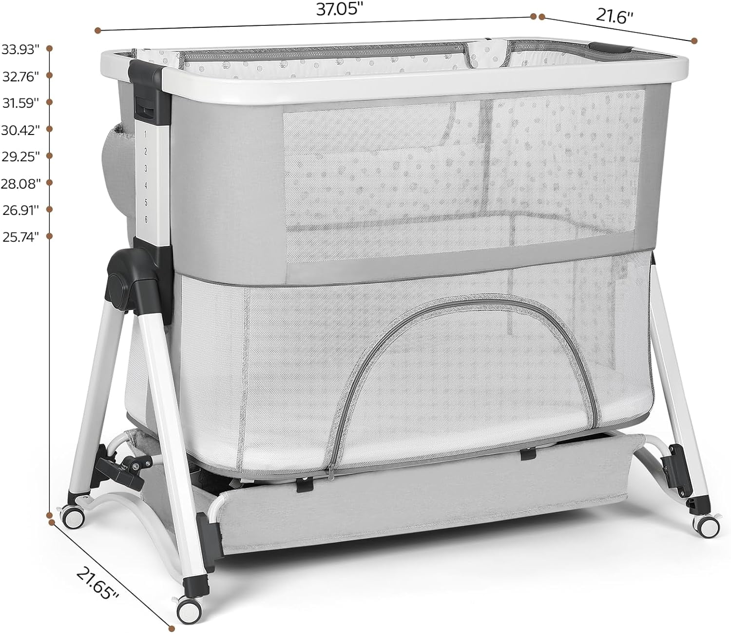 MULTIPLE FUNCTION – Cowiewie baby bassinet can be used as a baby cradle, baby playpen, or bedside sleeper attached to an adult bed. SAFE – Our bassinet inclined angle is 3-8° which is less than 10° as CPSC stated. This product is designed with a firm, flat sleeping surface that meets and/or exceeds all U.S. Consumer Products Safety Commission safety standards. ADJUST HEIGHT- 6 height positions (min 22”, max 27”) suit for most adults’ beds, allow breastfeeding easier. BABY CRADLE – Flip the bottom rocker of the bassinet can be converted into a baby cradle, better for soothing your baby to sleep. All the wheels can be detached. ULTRA STRONG – The frame of our baby crib is made from strong, sturdy aluminum, with a reinforced frame beneath the bassinet, it will not tip or get knocked over. COMFORT – Made of soft, skin-friendly fabric with breathable mesh on both sides, makes baby feel breathable and comfortable. Color: Light Gray; Gender: Unisex