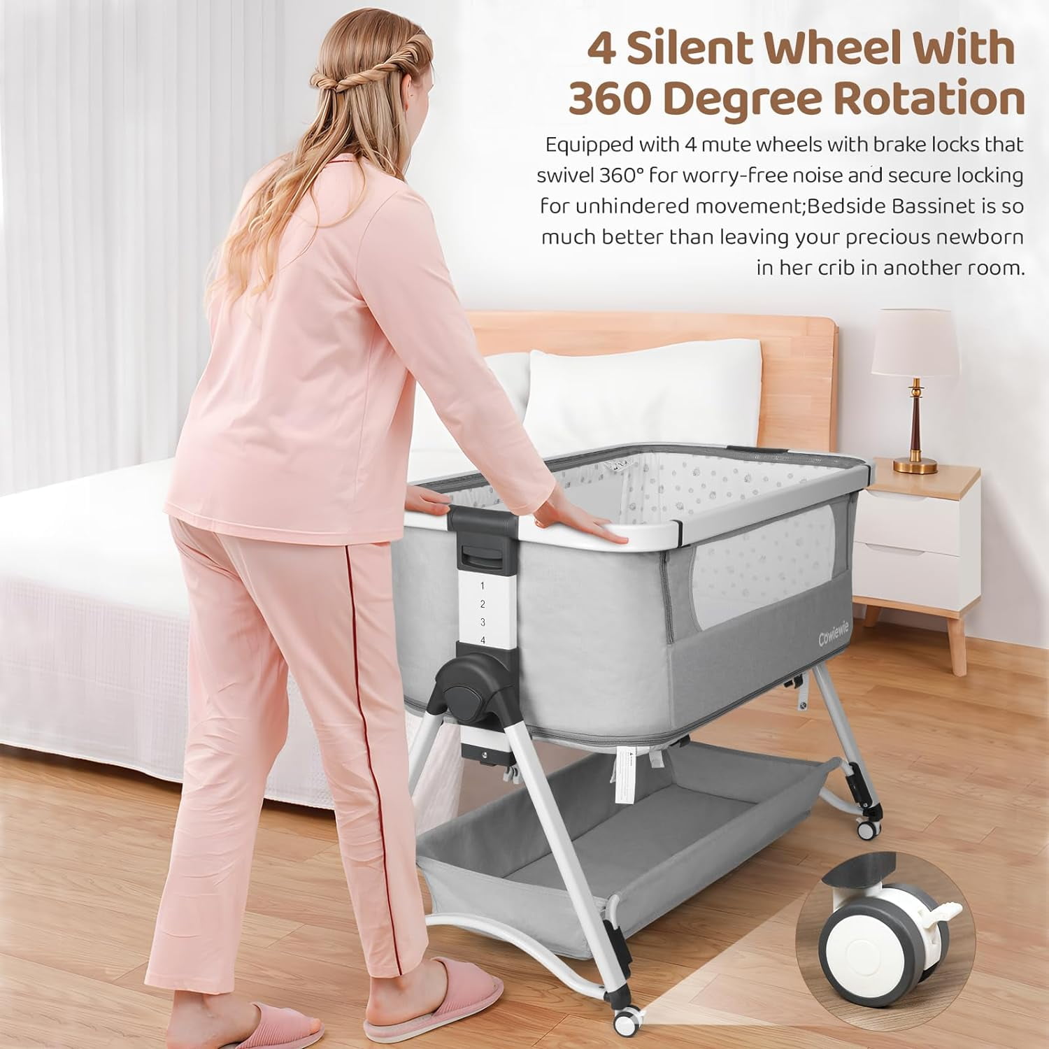 Cowiewie 3 in 1 Baby Bassinet Bedside Sleeper Playpen Cradle 6 Height Adjustable, Portable Travel Cot with Wheels, for Newborns Infants 0-18 Months, Light Gray