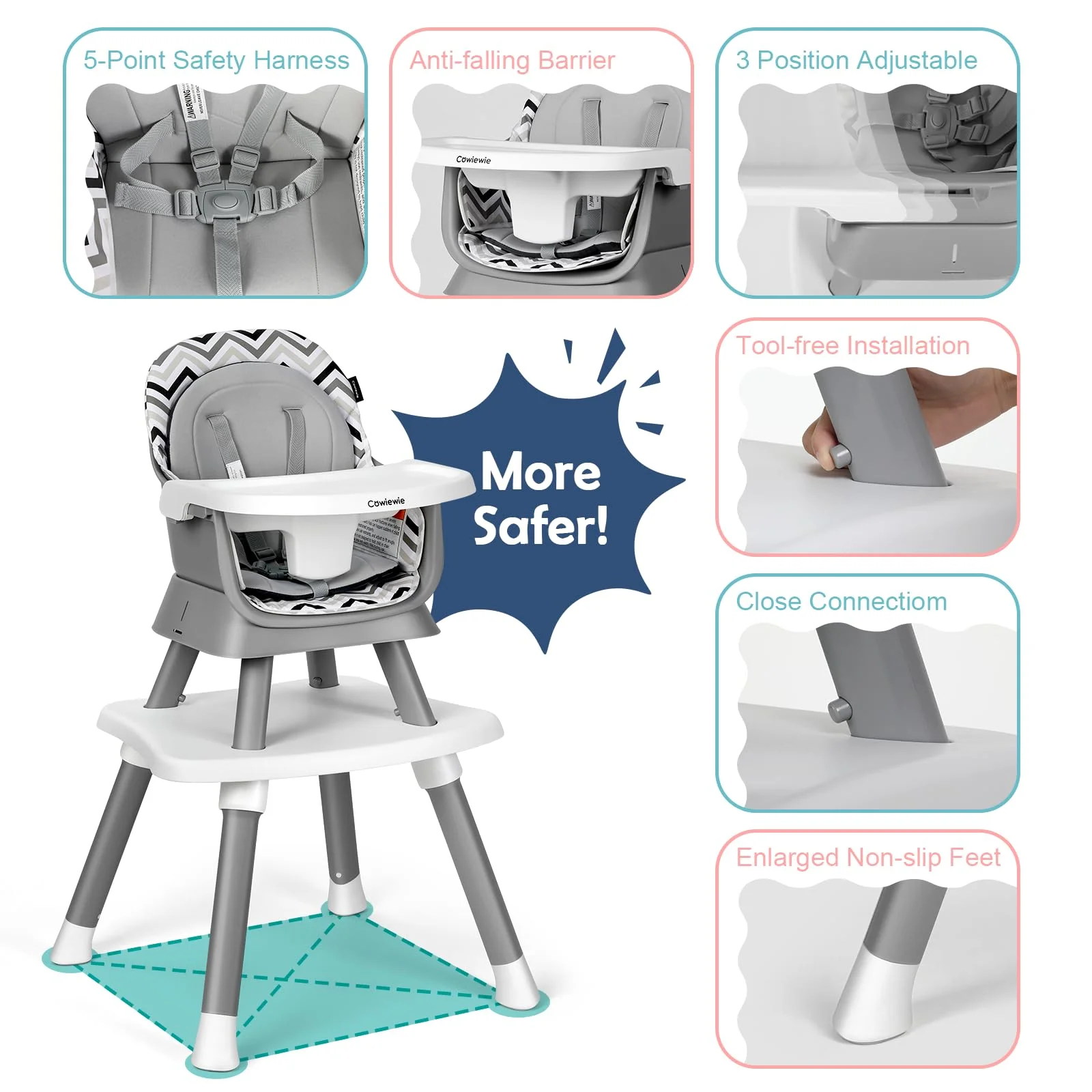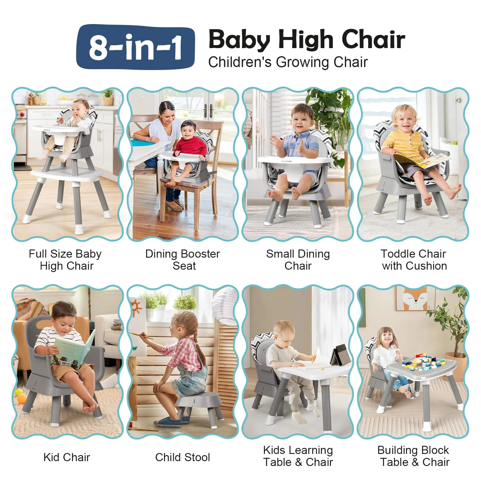 1. Develop Your Infant’s Ability to Eat Independently Let the baby sit independently in the high chair, so that the baby himself/herself from a simple grasp of food over to eat with a spoon, to develop the baby’s ability to eat independently on their own, in addition to exercising the baby’s hands, eyes, brain coordination and cooperation (use before to ensure that the baby’s bone development is complete, can sit up normally – safety first) 2. Cultivate the Infant’s Table Manners Baby use dining chair to eat, to a large extent, liberate the hands of parents, and the baby is more like to move around, very likely to touch the water cup knife and fork, and other items, or grab the table on the food, dining chair effectively isolate these “dangers”. At the same time, you can teach some important table manners to the baby, such as how to use the spoon when eating, to strengthen the baby’s ability to learn and imitate. 3. Use a Baby Dining Chair to Eat More Safely Babies in the early stages like to move around (they are surprised at the world) baby is very easy to slip, Cowiewie dining high chair with armrests, seat back design, high chair is the whole baby around, the five-point seat belt can also be fixed baby so that the baby dining safer. Cowiewie is Committed to Creating High-quality, Affordable Products for Newborns and Teens! IMPORTANT FEATURES:: If you have any questions about the multifunctional high chair or need a replacement, please visit us through our website and we will take care of it right away 1, TOOLLESS INSTALLATION- 3 minutes to install (friendly for people who don’t like to read instructions).Assembled Product Weight:17 lbs 2, 5-point harness: anti-standing, the harness is an important tool to ensure his/her safety in the chair; 3, Multi-level adjustment-3-level adjustment and removable, friendly to children who wear a lot of winters, you can freely choose the right dining chair space, enjoy the meal; 4, Double-layer cushion – US safety regulations require, to prevent children sitting in the chair from slipping, and protect the child’s spine, especially when the day is cool, the cushion is soft, removable and washable, wet wipes can also be scrubbing; 5, Four corners of the force + Four points of support: the chassis is wide and solid, reducing the risk of tilting; 6, Non-slip feet: enhance the friction with the ground to prevent tipping over; 7, Baby mode: high chair – the child and adult line of sight; booster seat function – can be connected to an adult chair (easy to carry); 8, Growth attributes: learning table, block table mode (equipped with a large enough block board); 9, Life mode: step stool mode can develop the child’s independent habits (hand washing, brushing teeth, etc.); 10, Cleaning problems: oil on the cushion with a wet paper towel wipe off; the dinner tray can be placed in the dishwasher.