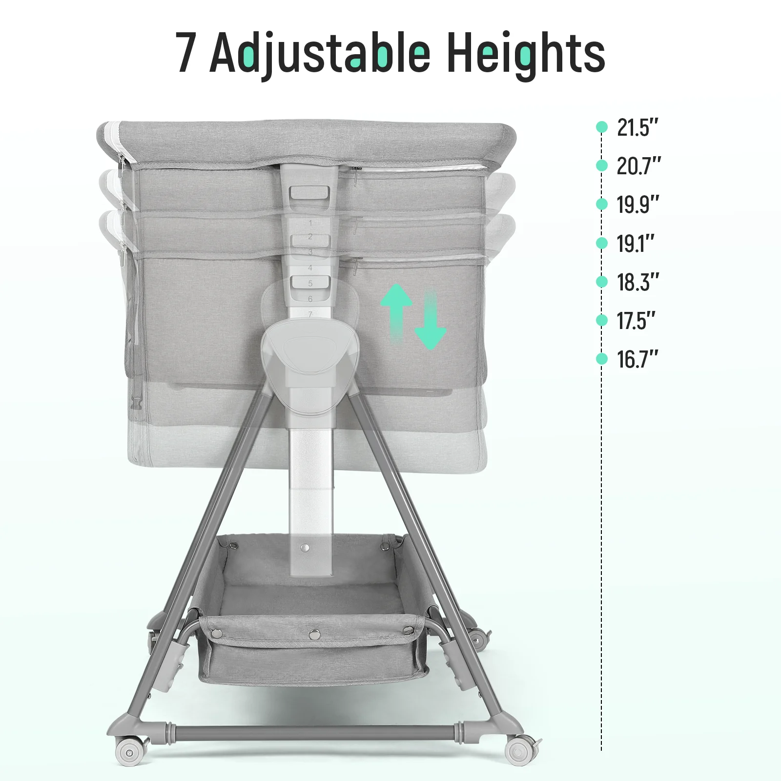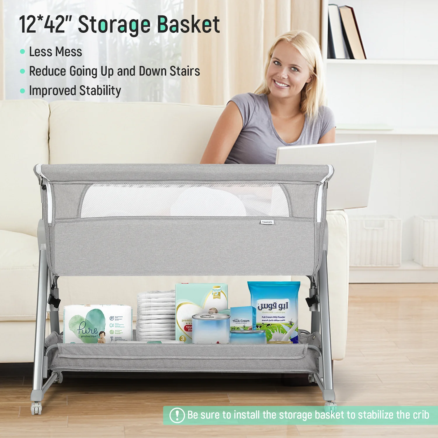 Specification: 1) Color: Light Gray 2) Material: Aluminum Alloy + Linen + Mesh 3) Dimension: 36.6” x 22” x 32.3” (L x W x H) 4) Adjustable Height: 16.7in/ 17.5in/ 18.3in/ 19.1in / 19.9in/ 20.7in/ 21.5in off the groud 5) Mattress Dimension: 32.5” x 19” x 1.2” (L x W x H) 6) Product Weight: 17.5 lbs 7) Max imum Weight: 33 lbs 8) Applicable Age: 0-6 Months 9) Gender: Unisex 10) Package includes: – 1 x Bedside Crib – 1 x Large storage basket – 1 x Mattress – 1 x 2.3m Safety Strap – 1 x Instruction Bassinet inclined angle is 3-8° which is less than 10° as CPSC stated. This product is designed with a firm, flat sleeping surface that meets and/or exceeds all U.S. Consumer Products Safety Commission safety standards. Features: – Baby’s Small Private Space: Perfect For Any Incoming Newborn – Material Safety: Detachable washing nylon cloth + peach skin; sponge and wood board – Safety and Firmness: Strong and rust-resistant aluminum alloy frame ensures long service life. – More Reasonable Structure Size: Firm triangular structure and non-slip foot pads ensure high stability and baby’s safety. – Independent Space: It’s also convenient for mothers to take care of the baby at night. NOTE: The Storage Basket MUST be installed: the purpose is to strengthen the stability of the crib