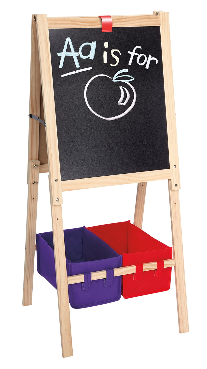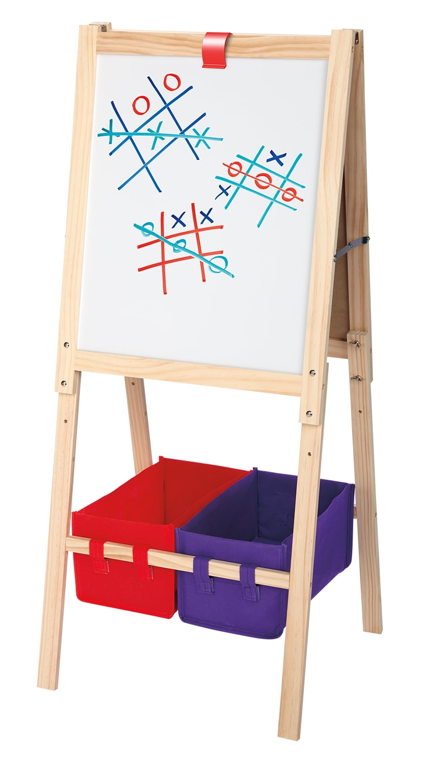 Foster your child’s creative side with this 3-in-1 Smartest Artist Double-Sided Adjustable Wood Children’s Art Easel by Cra-Z-Art 5 Piece Set, Includes real wood framed art easel with chalkboard side, dry erase board side, 1 easel clip, and 2 durable fabric storage bins to keep art supplies organized Includes two durable fabric storage bins to hold art supplies neatly tucked underneath Height-adjustable legs make it easy for children of any size to enjoy Convenient easel clip holds paper in place while kids paint or color Recommended for ages 4 and up, perfect for the little artist in your life Unit folds flat for easy storage and transportation so you can bring your creativity on the go This kit weighs 9lb, model number 14037-1 Easy-to-follow assembly instructions included
