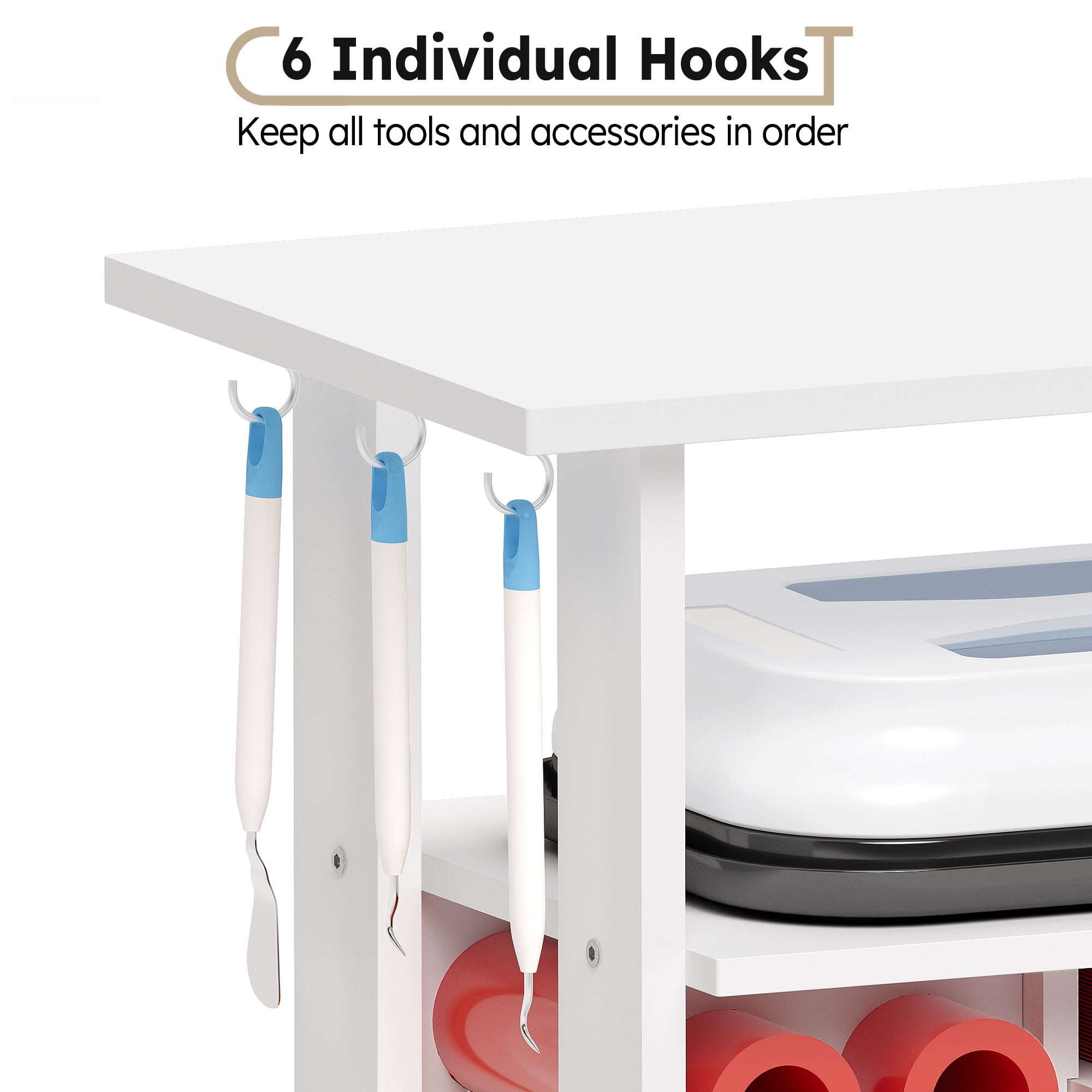 Equipped with 29 vinyl roll holders that keep your vinyl rolls neatly organized and easily accessible, making it an ideal companion for Cricut machines and other crafting tools. Features 5 removable shelving compartments that can accommodate hundreds of 12×12 scrapbook papers or various other crafting accessories, allowing you to organize your supplies according to your specific needs. Comes with 6 hooks for effortlessly hanging and accessing your most-used tools, such as scissors, weeding tools, and other essential crafting items, enhancing your workflow and efficiency. Constructed from premium solid wood and MDF, this craft storage desk is built to last, with a water-resistant treated surface that makes it easy to clean and maintain. Designed with a compact footprint, this rolling storage cart fits seamlessly into any craft room or workspace, and the removable and mobile design allows you to easily move the cart wherever you need it, providing flexibility and convenience for your crafting projects.