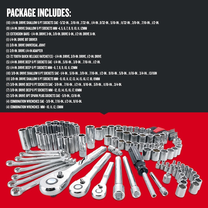 135 pc 3 Drive Mechanics Tool Set comes equipped with 72 Tooth ratchets, a broad assortment of drive tools, and a rugged blow mold case. This case is constructed with metal hinges for separate sets, and the dimensions are specifically designed to fit into CRAFTSMAN® metal storage boxes for easy organization. 135 pc set includes (10) 1/4-in Drive Shallow 6 PT Sockets SAE (5/32, 3/16, 7/32, 1/4, 9/32, 5/16, 11/32, 3/8, 7/16, 1/2-in), (9) 1/4-in Drive Shallow 6 PT Sockets Metric (4, 5, 6, 7, 8, 9, 10, 11, 12mm), (5) 1/4-in Drive Deep 6 PT Sockets SAE (1/4, 5/16, 3/8, 7/16, 1/2-in), (7) 1/4-in Drive Deep 6 PT Sockets Metric (6, 7, 8, 9, 10, 11, 12mm), (10) 3/8-in Drive Shallow 6 PT Sockets SAE (1/4, 5/16, 3/8, 7/16, 1/2, 9/16, 5/8, 11/16, 3/4, 13/16-in), (11) 3/8-in Drive Shallow 6 PT Sockets Metric (8, 10, 11, 12, 13, 14, 15, 16, 17, 18, 19mm), (7) 3/8-in Drive Deep 6 PT Sockets SAE (3/8, 7/16, 1/2, 9/16, 5/8, 11/16, 3/4-in), (7) 3/8-in Drive Deep 6 PT Sockets Metric (12, 13, 14, 15, 16, 17, 18mm), (9) 1/2-in Drive Shallow 12 PT Sockets SAE (3/8, 7/16, 1/2, 9/16, 5/8, 11/16, 3/4, 13/16, 7/8-in), (8) 1/2-in Drive Shallow 12 PT Sockets Metric (14, 15, 16, 17, 18, 19, 21, 22mm), (1) 1/4-in Drive Ext Bar (3-in), (1) 3/8-in Drive Ext Bar (6-in), (1) 1/2-in Drive Ext Bar (6-in), (2) 3/8-in Drive Spark Plug Sockets (5/8-in and 13/16-in), (1) 1/4-in Drive Bit Driver, (16) Short Arm Hex Keys, (4) SAE Combination Wrenches (3/8, 7/16, 1/2, 9/16-in), (4) Metric Combination Wrenches (10, 11, 12, 13mm), (1) 1/4-in Drive Ratchet, (1) 3/8-in Drive Ratchet, (1) 1/2-in Drive Ratchet, (1) 3/8-in Drive Size Adapter (1/4-in), (1) 3/8-in Drive Universal Joint and (17) Specialty Bits.