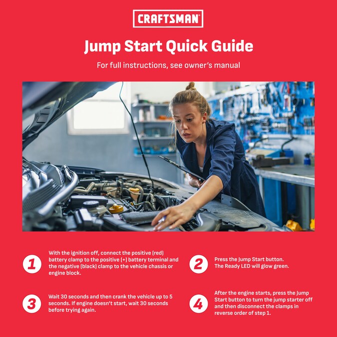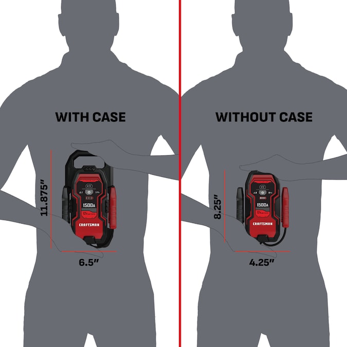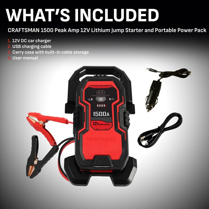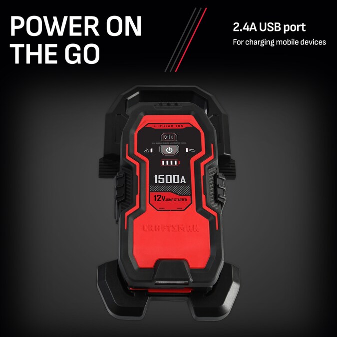 When a dead battery derails your plans, fight back with a CRAFTSMAN lithium jump starter. With the CRAFTSMAN 1500 Peak Amp 12V Lithium Jump Starter and Portable Power Pack (CMXCESM264) you can get back on the road in minutes. This jump starter’s advanced lithium ion battery is designed to last for years while delivering significant power. The unit will jump start a vehicle up to 35 times on a single charge and can also safely charge a range of mobile devices from its integrated 2.4-amp USB port. Compact enough to fit in a glove box or center console, the CMXCESM264 is powerful enough to jump start up to 8.0L gas and 4.5L diesel engines. Additional features make this unit one you can rely on in harsh conditions. In cold weather, the CMXCESM264 will warm up your vehicle’s battery before jump starting—ensuring more reliable starting. Also, if your car’s battery is deeply depleted, the unit will add a pre-charge for even better engine starting performance. Other useful features include a built-in LED area light designed for emergency lighting whenever you need it, USB-C or 12V DC recharging, a rugged carrying case with integrated cable storage, and 8-gauge, 24-inch booster cables with color-coded clamps.