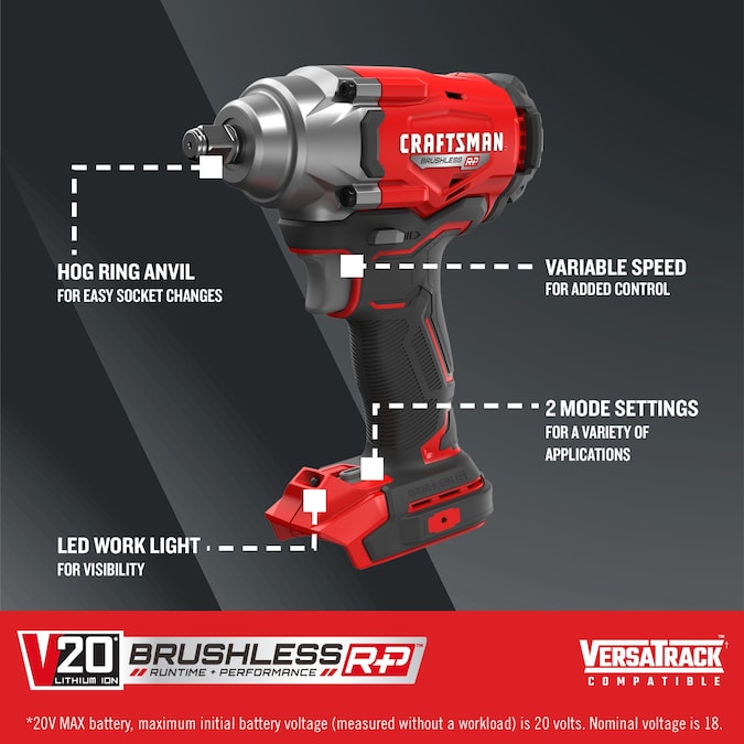 V20 BRUSHLESS RP™ Cordless 1/2-in Impact Wrench with Hog Ring Anvil provides MORE RUNTIME. BETTER PERFORMANCE.™ for your demanding jobs. Drive or remove large fasteners with up to 275-ft-lb max torque. This tool features two speed settings and a variable speed trigger.
