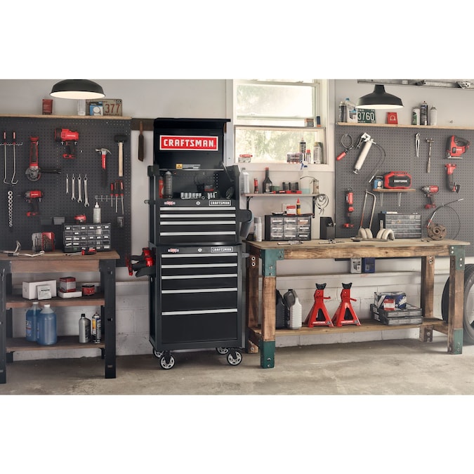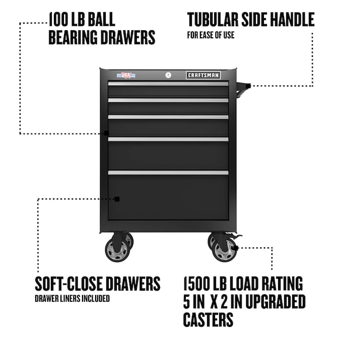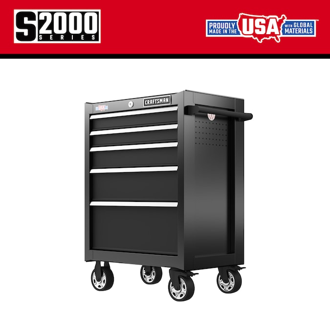 Seamlessly stow up to 100-lbs of hardware, power tools, and tool pieces with this stout S2000 26-in 5-Drawer Rolling Tool Cabinet. Preserve your drawers’ functionality with hard-wearing, self-close drawer slides that gently shut. This cabinet combines endurance and storage capacity with over 9,000 cubic inches of space and a solid steel frame to support the professional’s tools for the long-term.