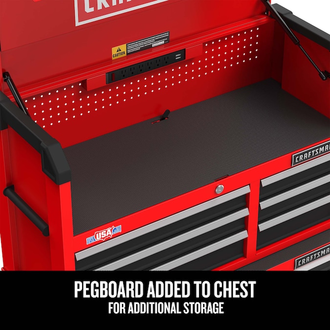 - QUICK ACCESS TO THE CHARGING AREA with gas struts that support the tool chest lid