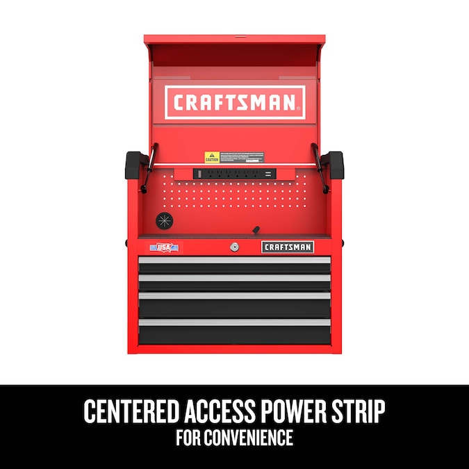 Your multi-utility storage and charging solution, this S2000 26-in 4-Drawer Tool Chest is optimally suited for stowing tools while keeping your batteries and electronics powered up. The chest packs the capacity to store several tools while not taking up much space in your garage or workshop. Easily access the integrated power strip to maintain high productivity throughout the day while the no-slam drawer slides help keep your tools secure and in place.