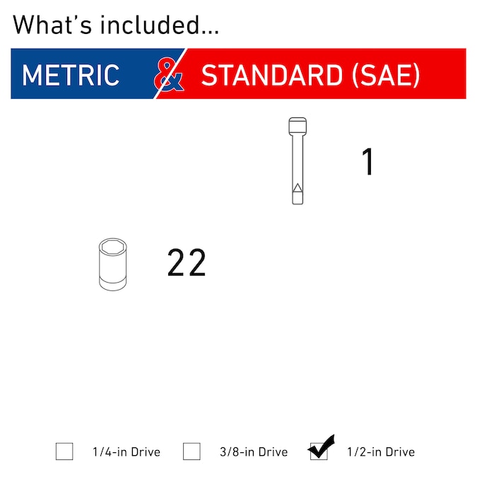 • Includes (11) 1/2-in Dr Deep Impact Sockets SAE (3/8, 7/16, 1/2, 9/16, 5/8, 11/16, 3/4, 13/16, 7/8, 15/16 and 1-in), (11) 1/2-in Dr Deep Impact Sockets Metric (12, 13, 14, 15, 16, 17, 18, 19, 21, 22 and 24 mm) and (1) 1/2-in Dr Impact Extension Bar (3-in)